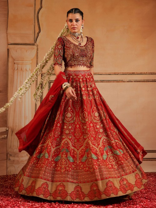 Stunning Red Printed Silk Wedding Lehenga Choli