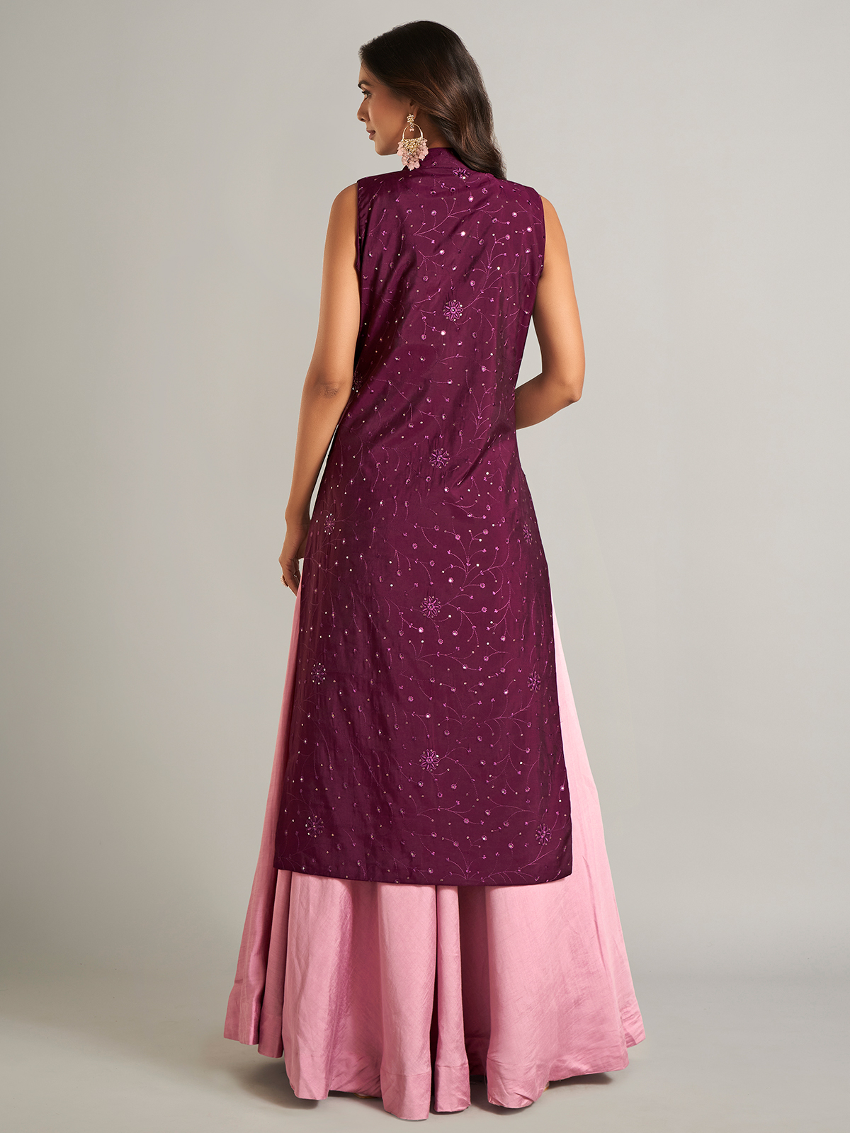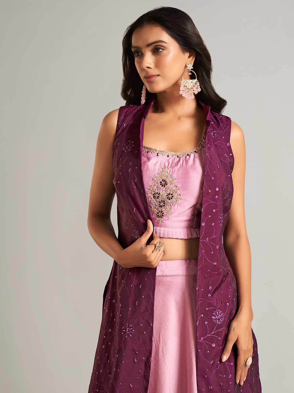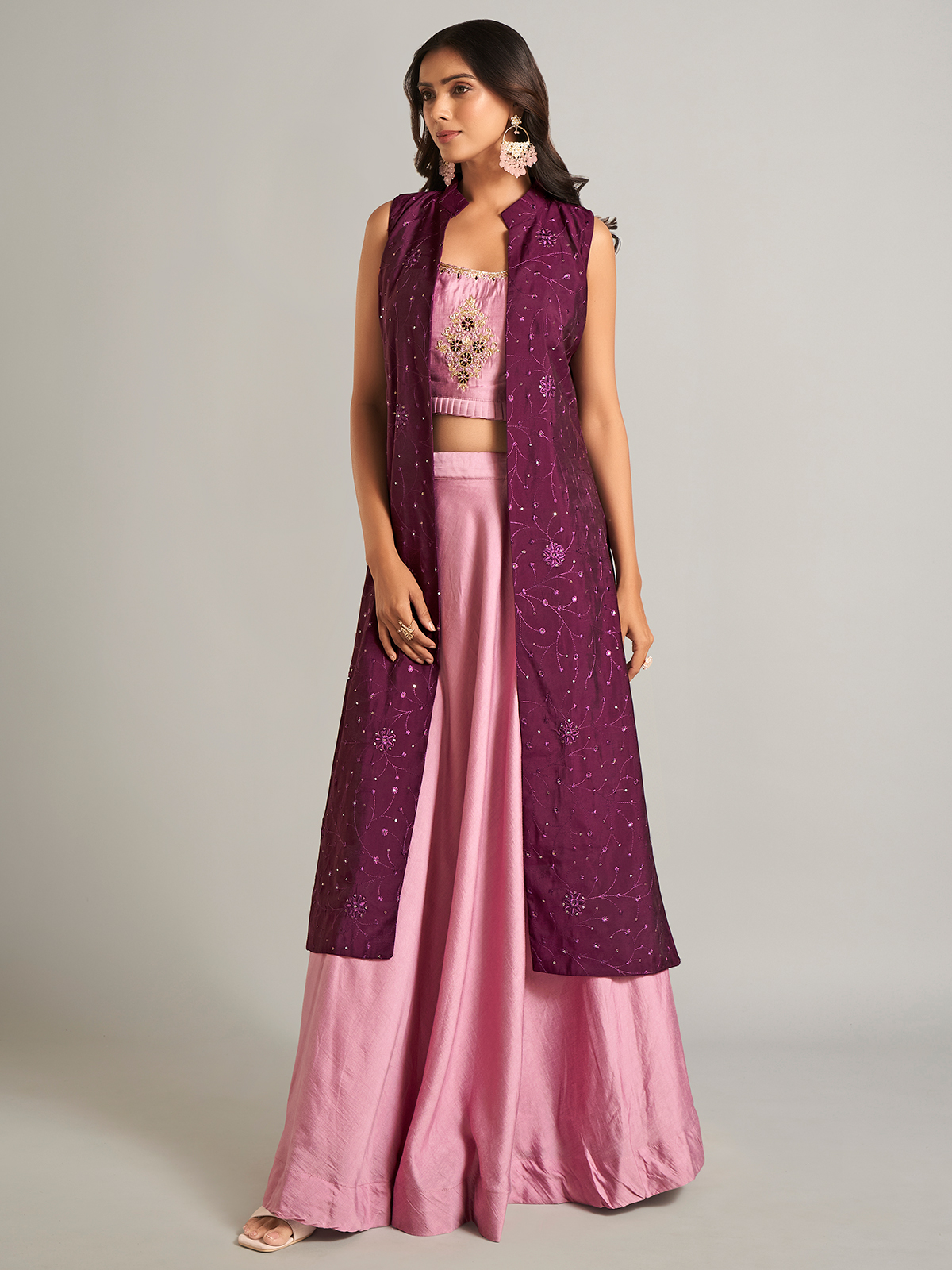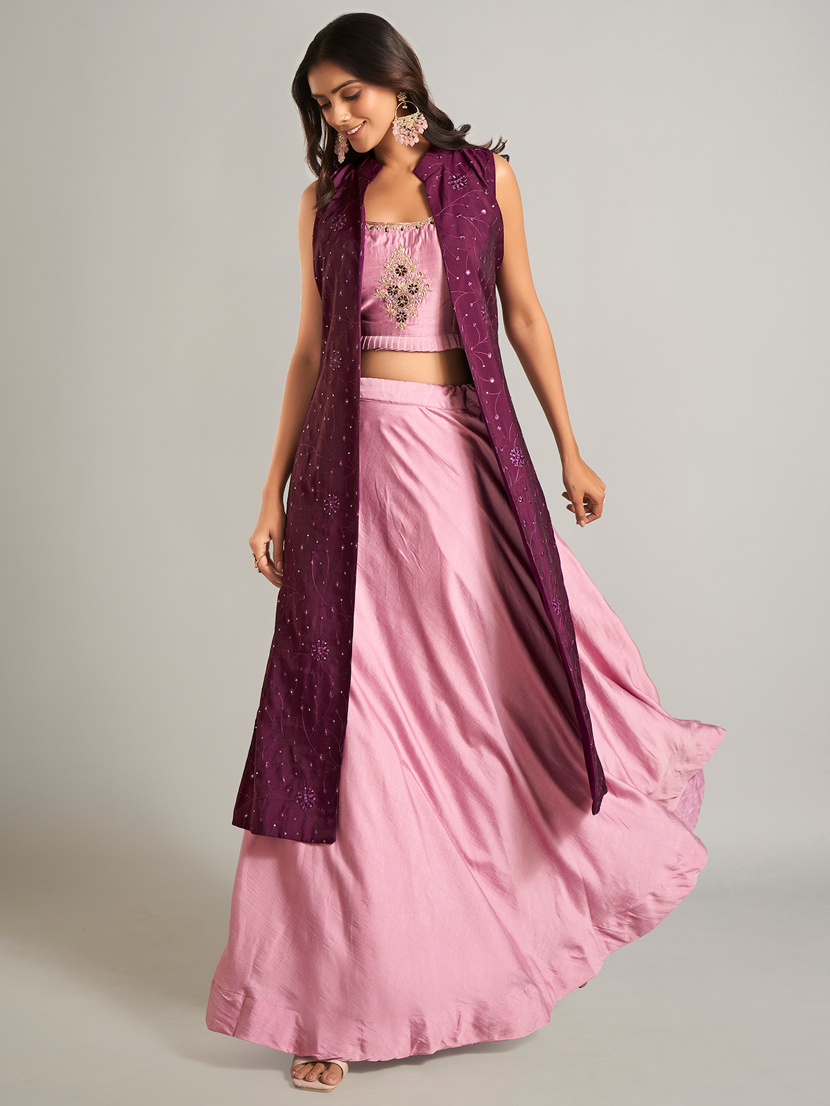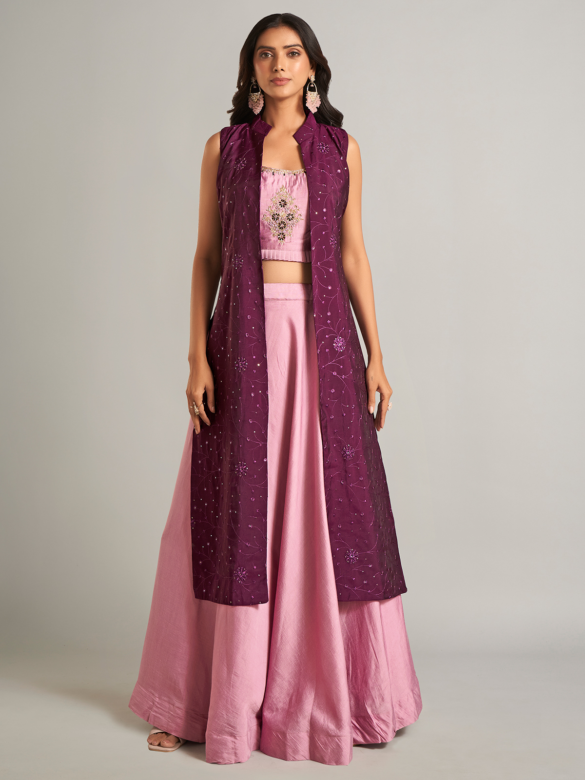 Embrace elegance with this pink silk jacket-style lehenga choli. Crafted with exquisite zardosi, threadwork, sequins, cutdana, stone, and embroidery, it offers a graceful yet sophisticated appeal.