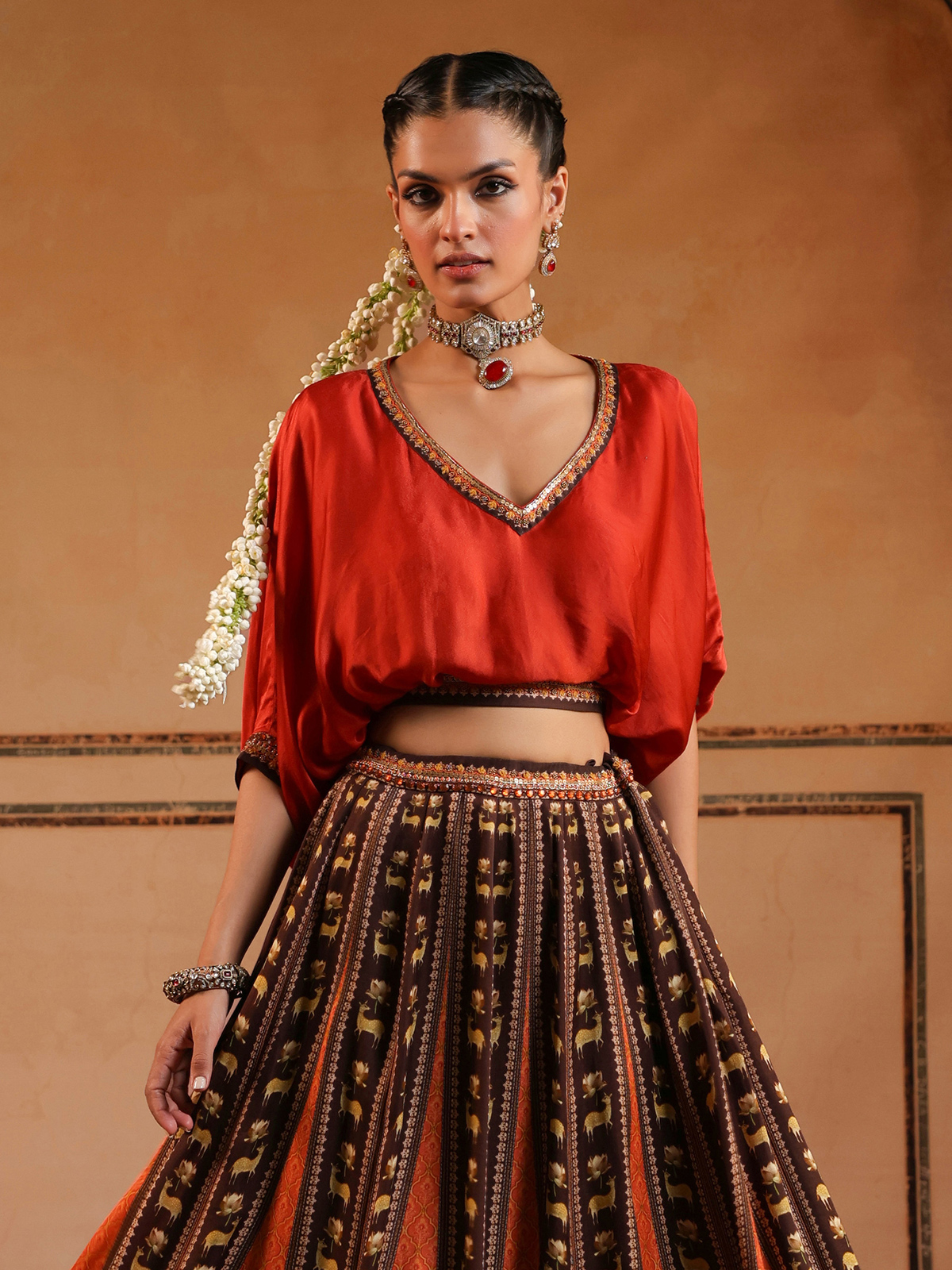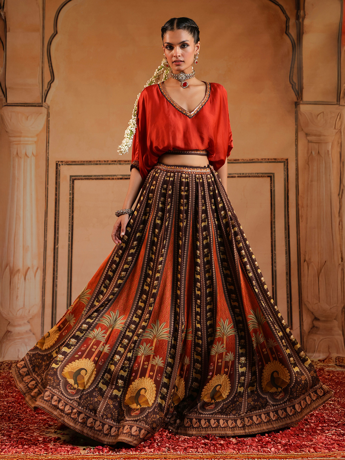Draped in earthy brown with red accents, this silk printed lehenga choli features a V neckline and quarter sleeves. Beads, cutdana, sequins, and thread work shimmer across the design. An ideal wedding attire, it captures timeless traditional richness.