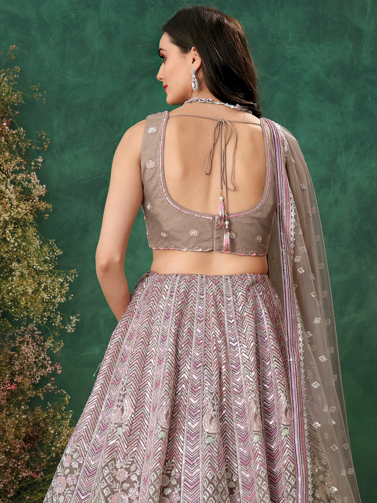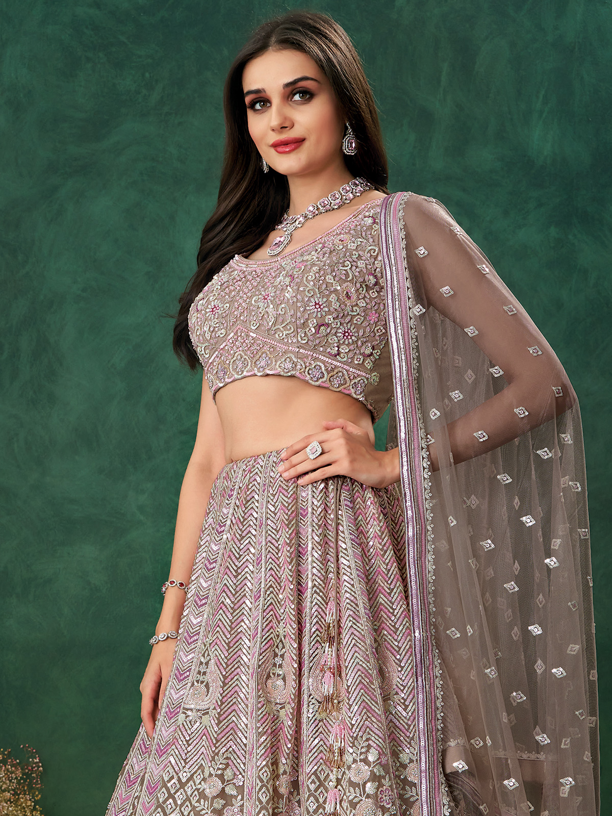 Step into your special day with this dazzling grey net lehenga choli. The entire set is highlighted with heavy sequin and beadwork, giving it a luxurious reception ready look. It includes an unstitched blouse and a coordinating embellished net dupatta.