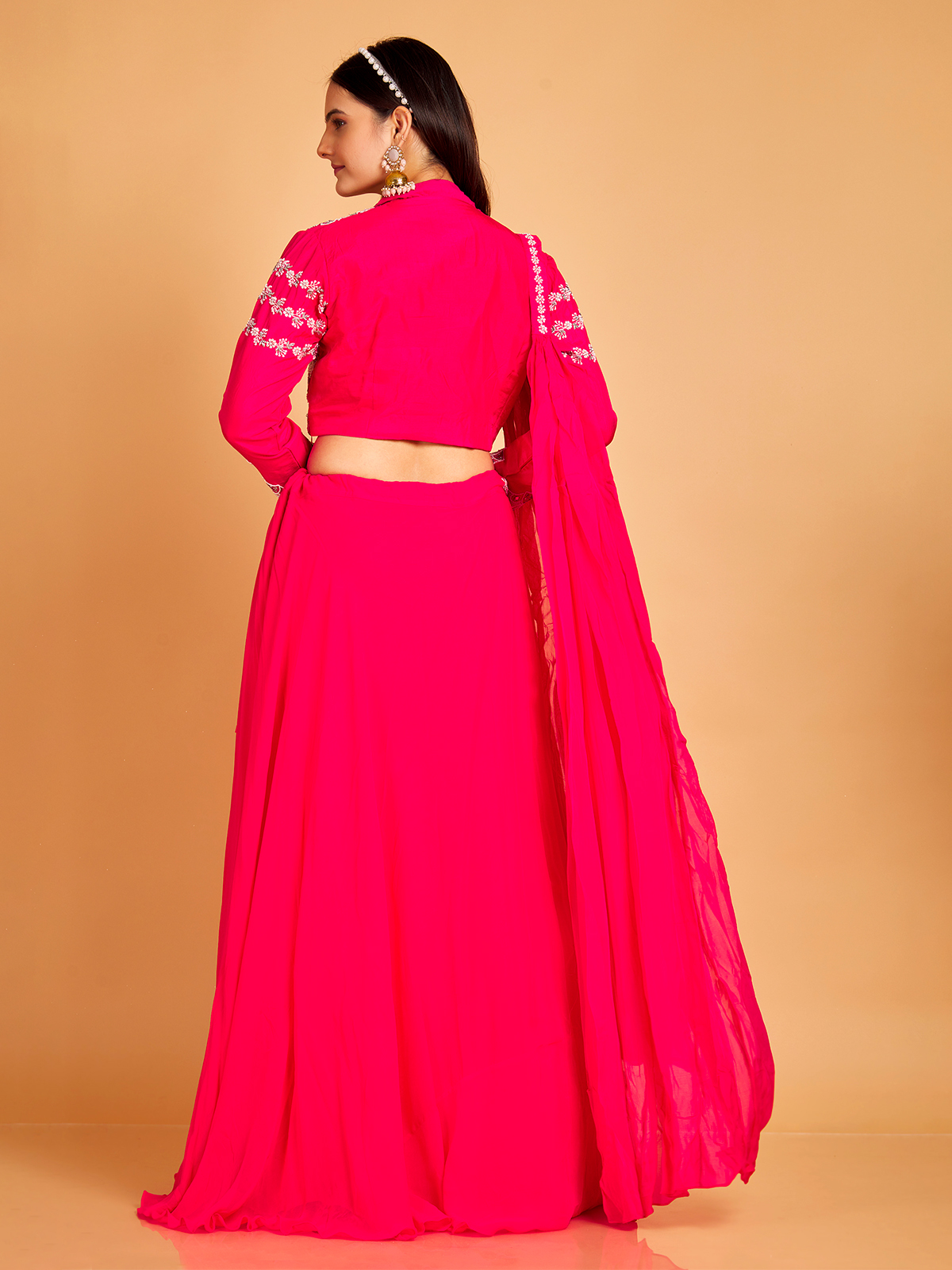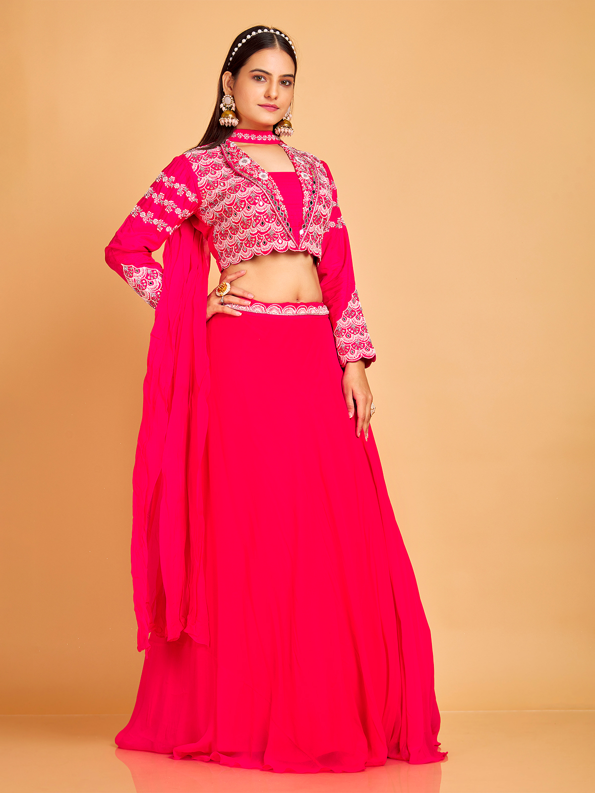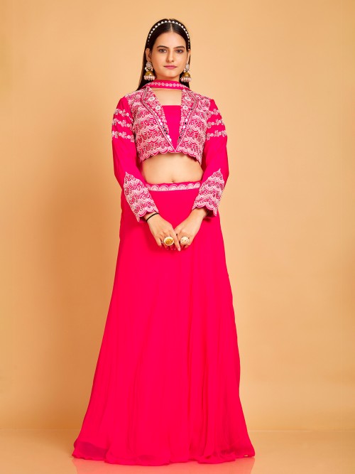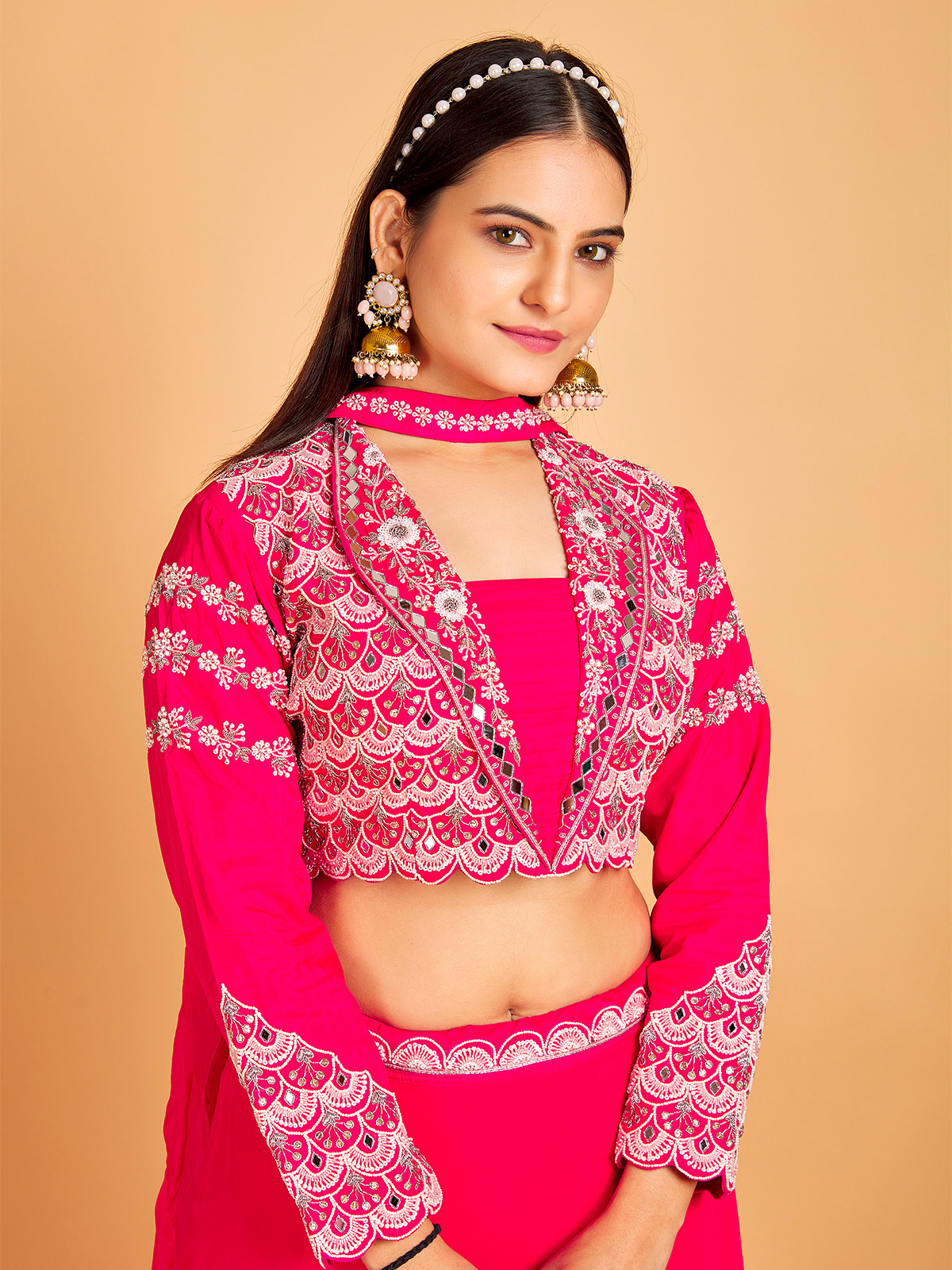 Exuding opulence, our standout rani silk lehenga choli is a splendid choice for traditional occasions. Adorned with captivating mirror, zardosi, sequins, and beads work, this enchanting lehenga is paired with a full sleeve choli and a complementary choker dupatta.