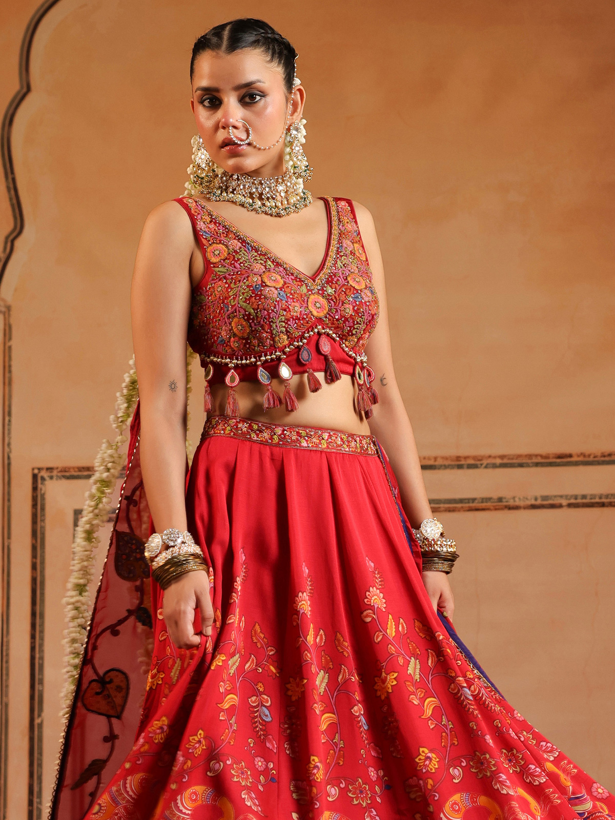 Fiery in tone, this red silk printed lehenga choli presents a sleeveless V neckline silhouette. Decorated with sequins, thread, beads, cutdana, and mirror work, it gleams with charm. Perfect for weddings, its vibrant hue radiates festive brilliance.
