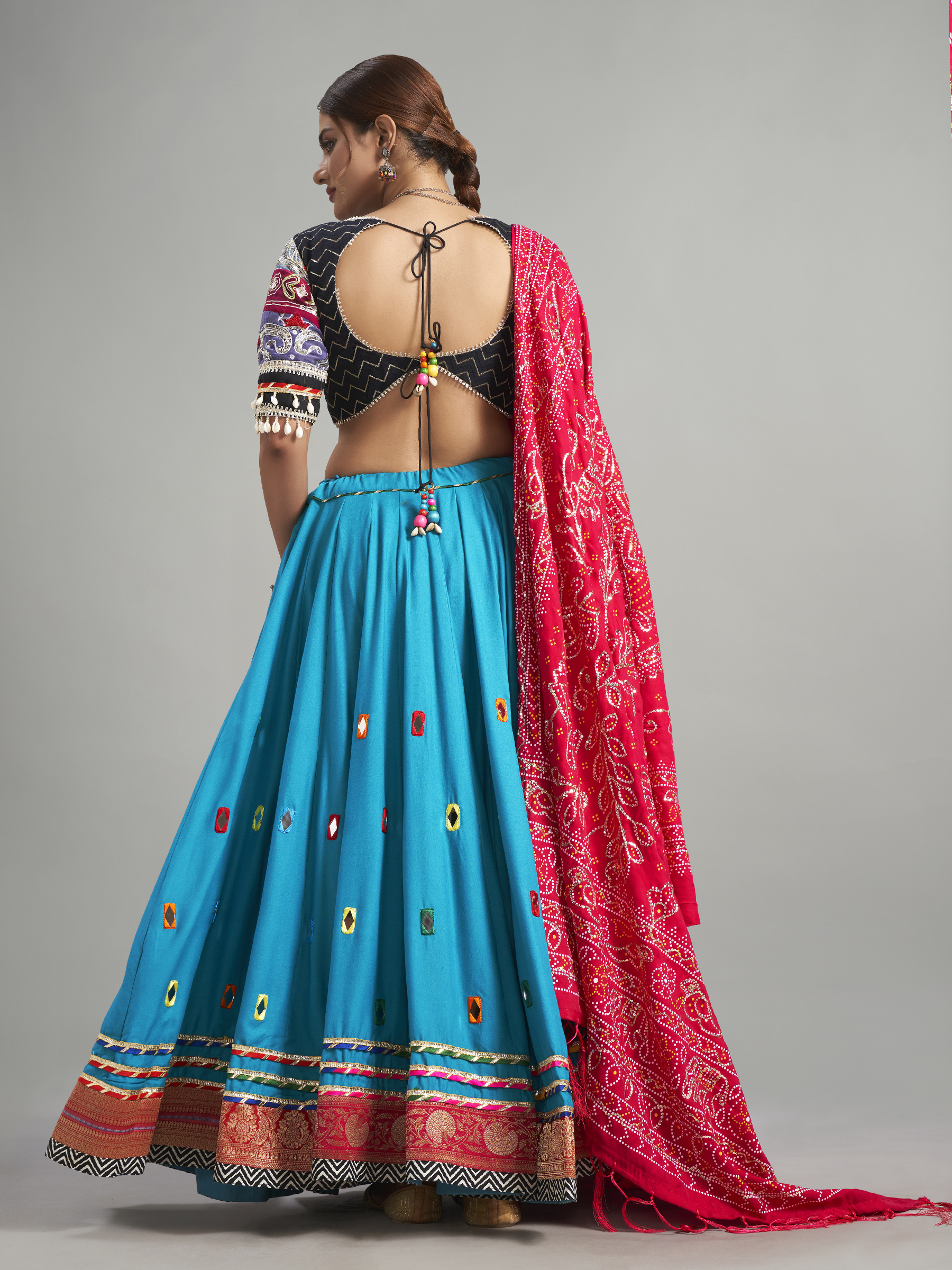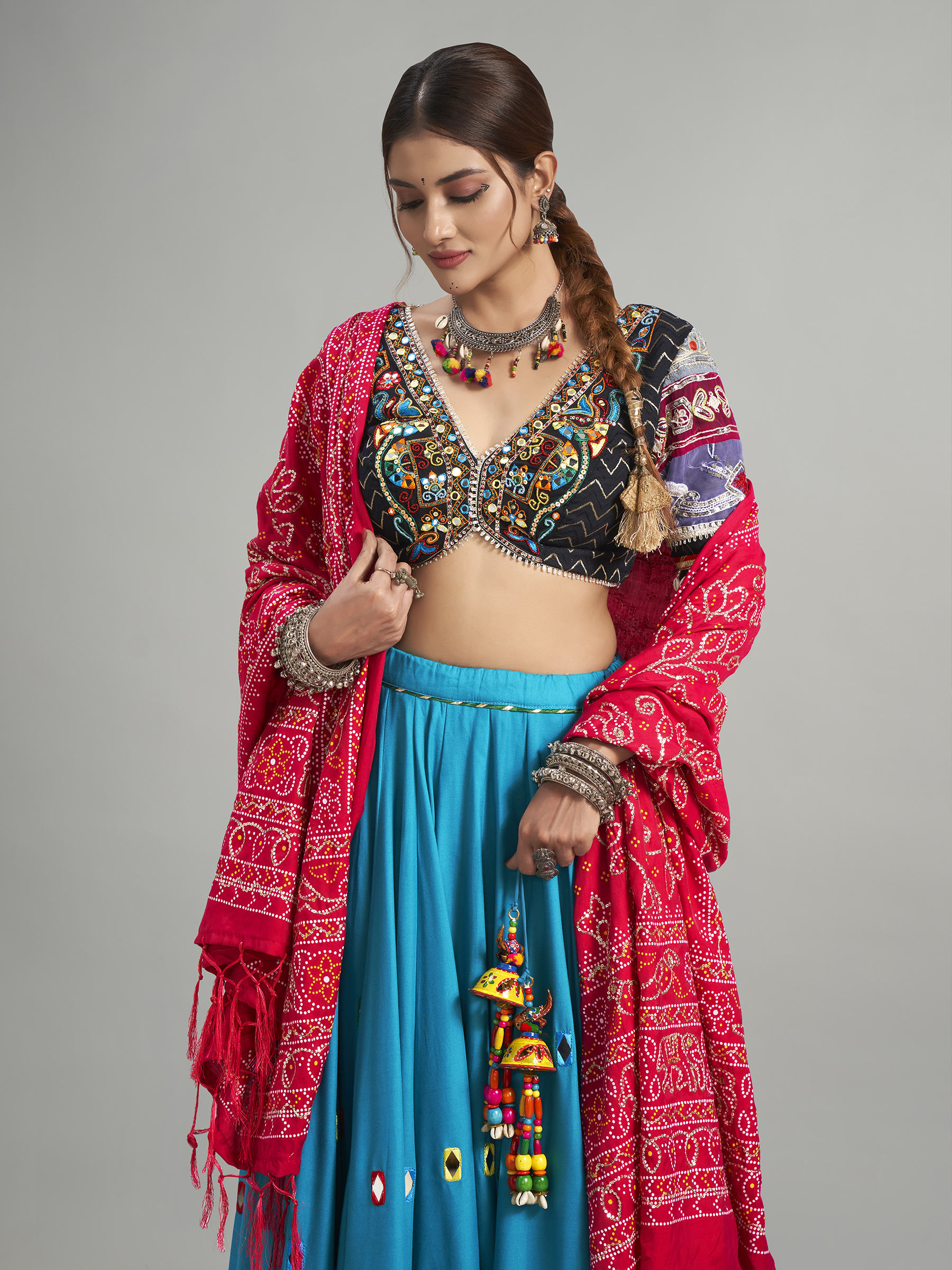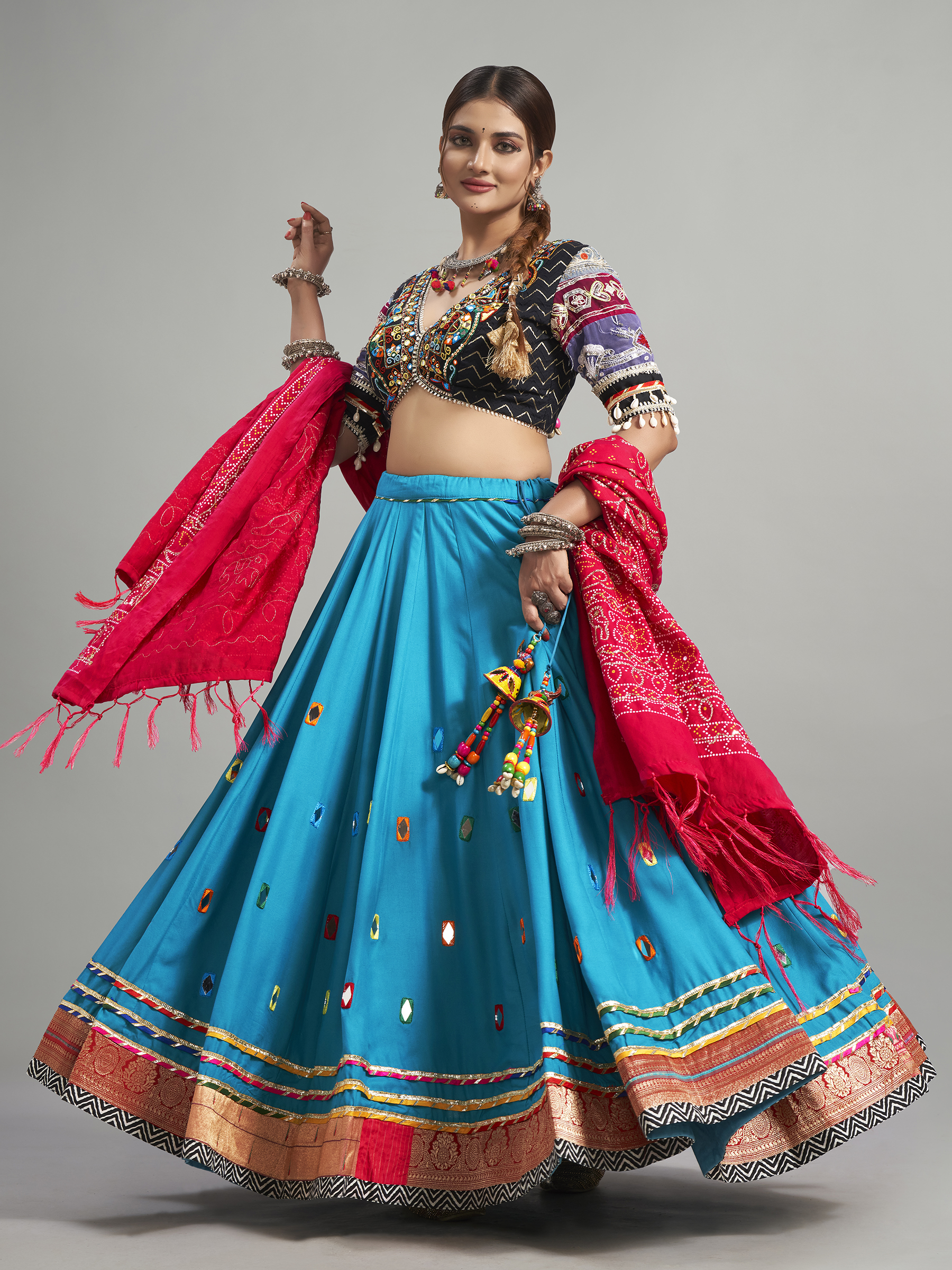 This stunning aqua cotton silk chaniya choli for Navratri reflects rich cultural heritage and contemporary style. Enhanced with sequins, beads, resham, thread, mirror, cowrie shells, and gota work, the choli has a V-neck and elbow sleeves. Comes with a dupatta. Note that the print and work may slightly vary from the image.