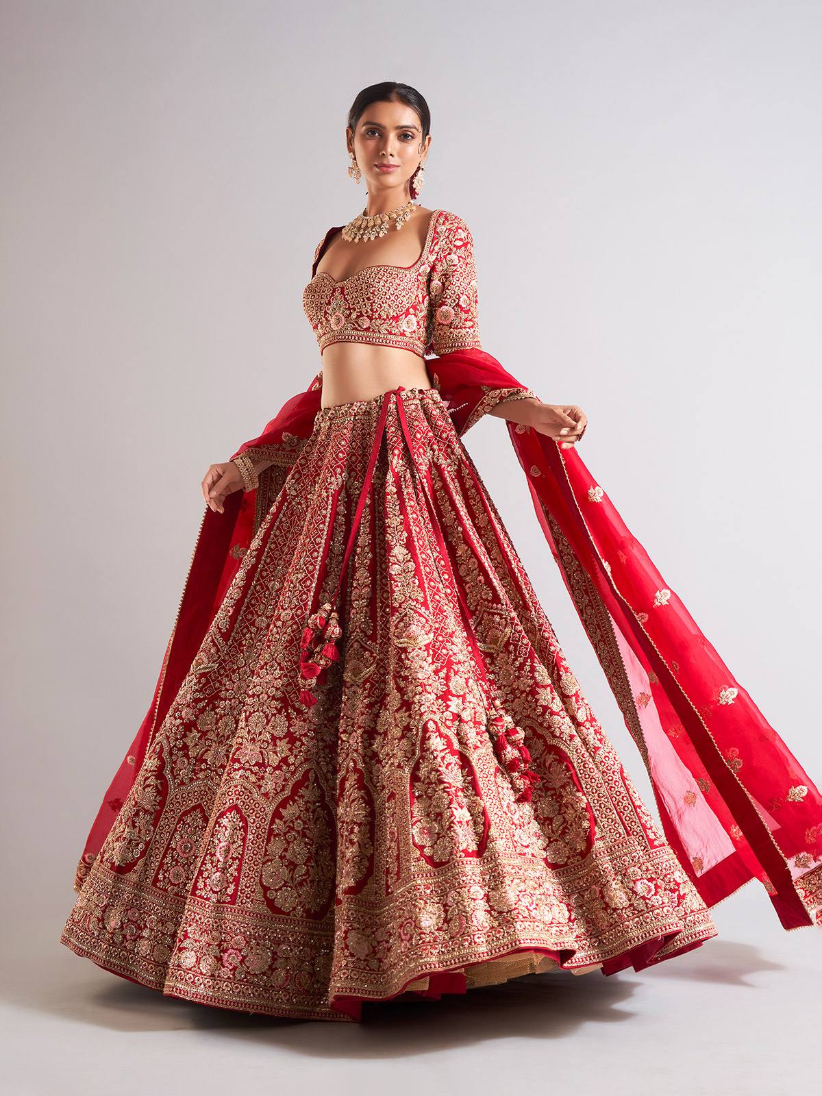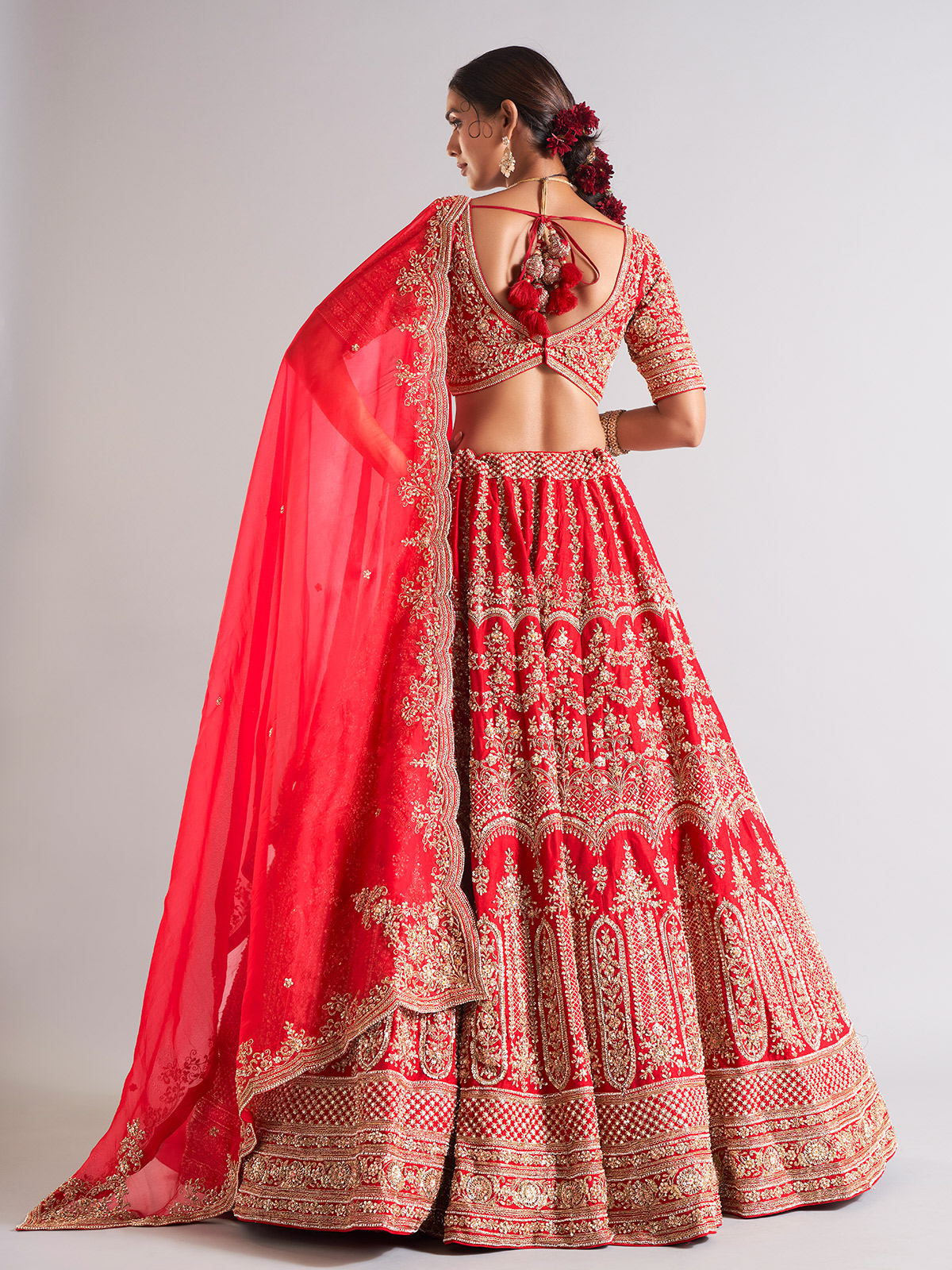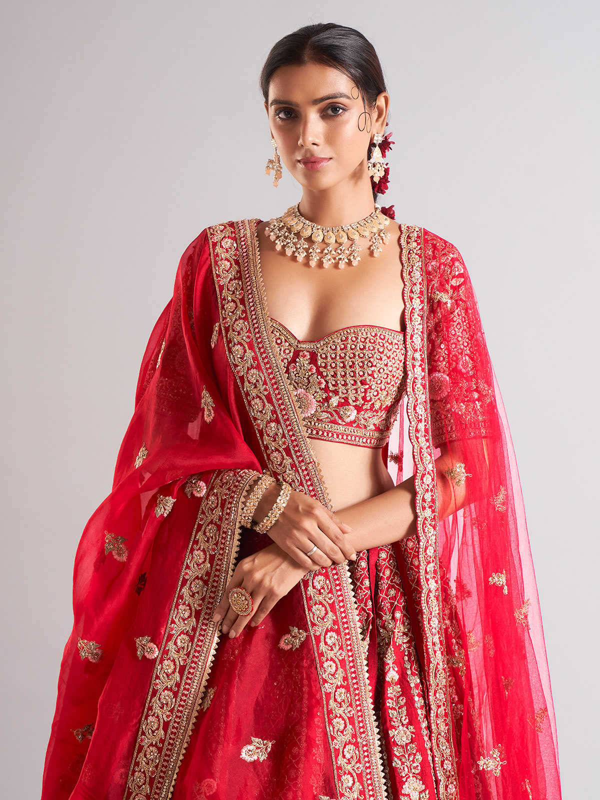 Make a bold fashion statement in this maroon lehenga choli, complete with a dupatta. Crafted from raw silk, it showcases stunning cutdana, sequins, resham, zardosi, thread, and bead work. The elbow-sleeved design makes it perfect for classic occasions.