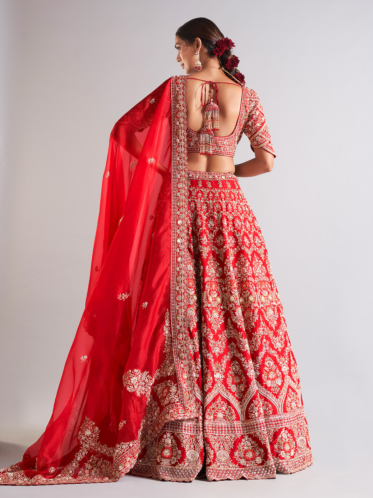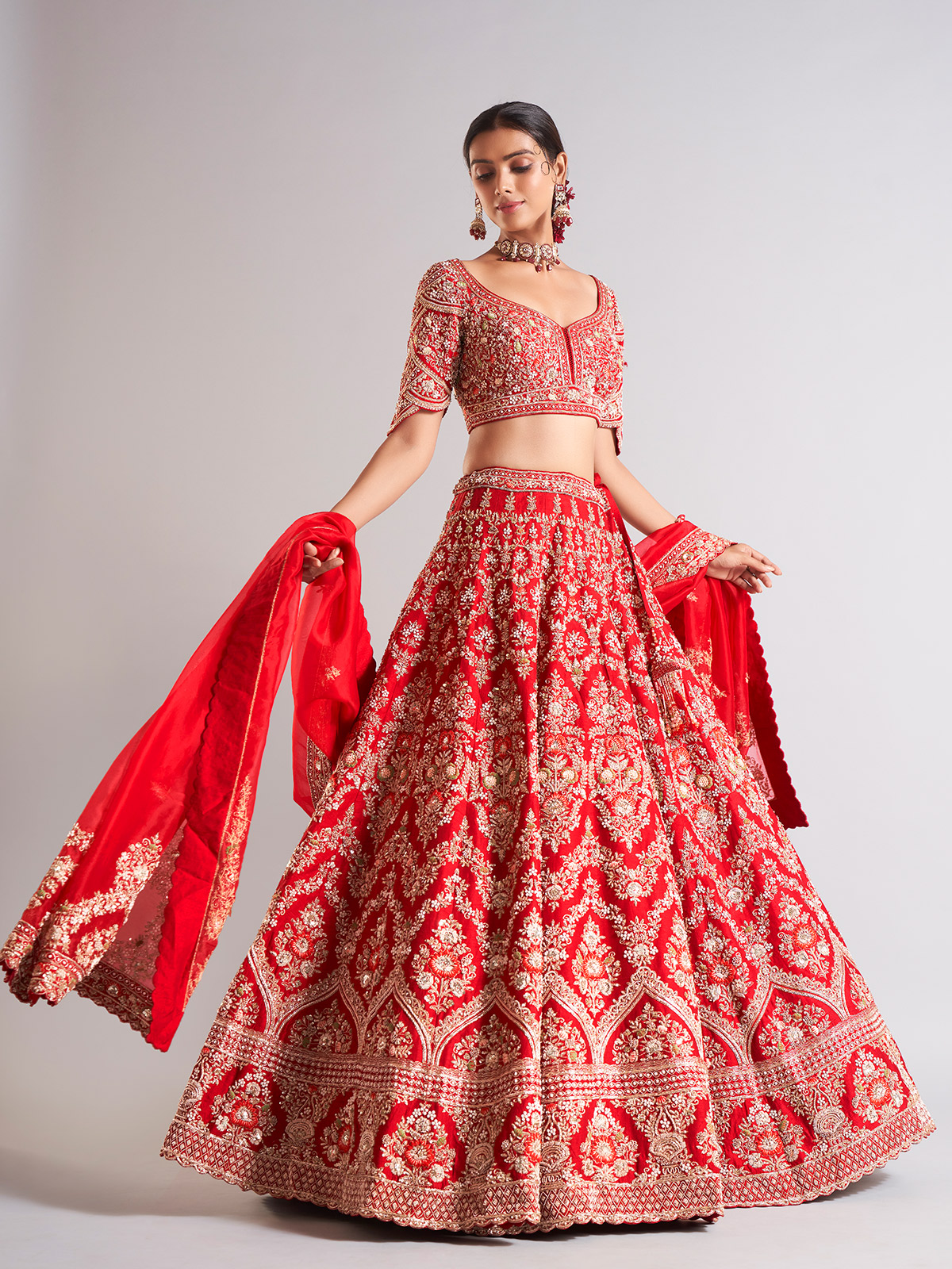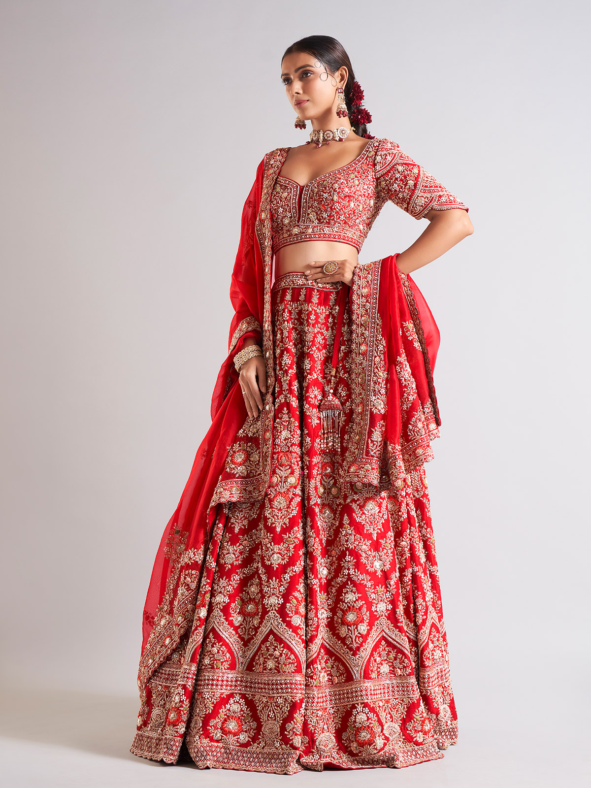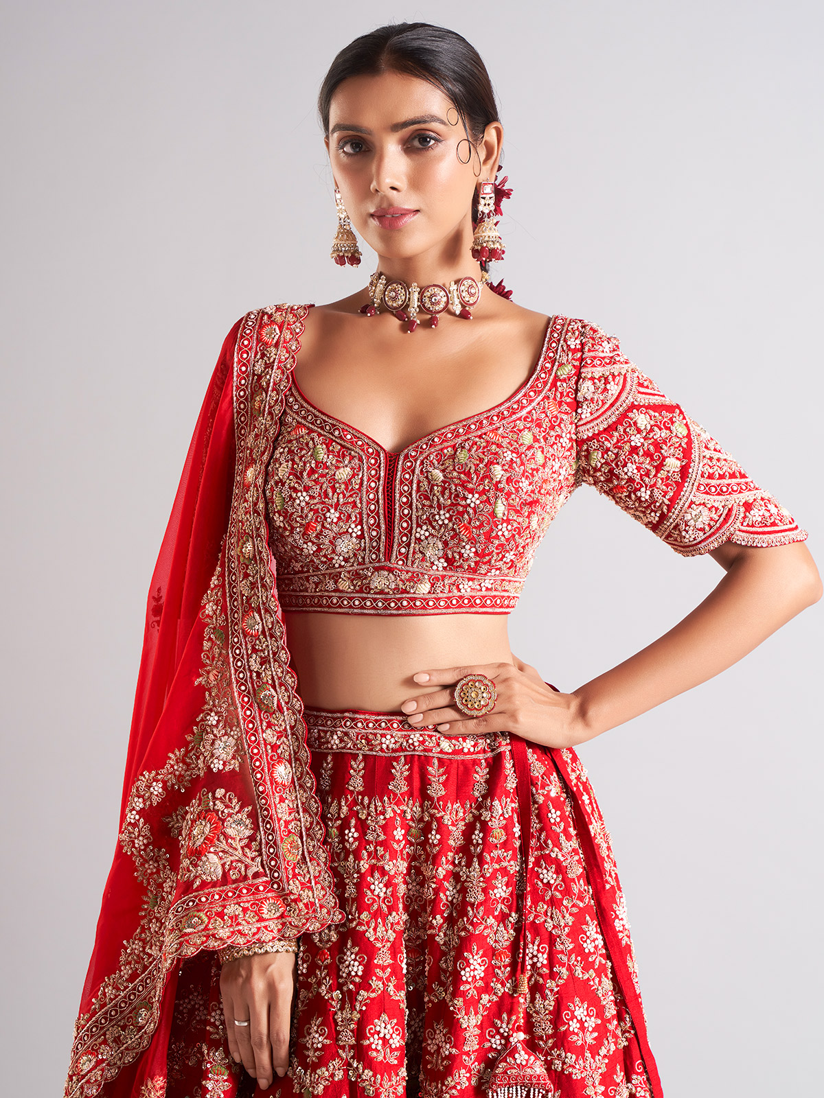 For those who love simplicity, this maroon raw silk lehenga choli is a great option. It showcases intricate cutdana, sequins, resham, zardosi, thread, and bead work, with a sweetheart neckline and elbow sleeves for added comfort.
