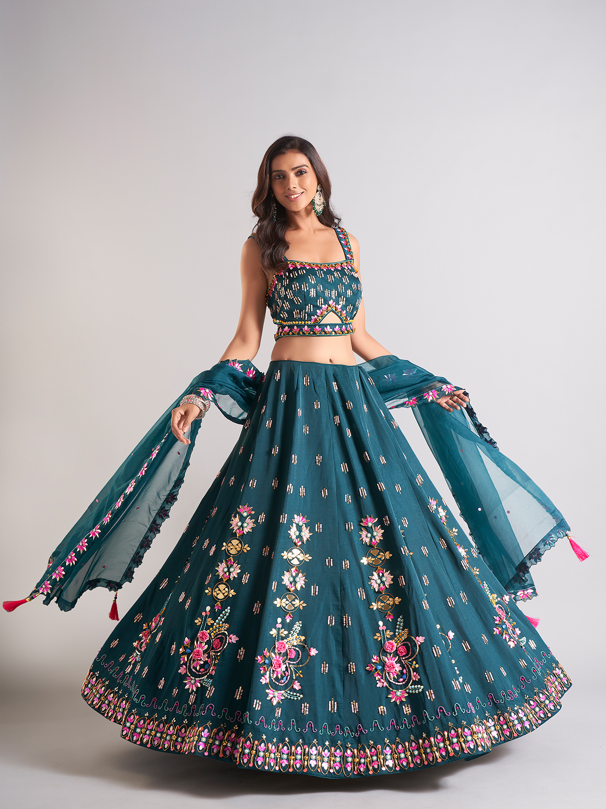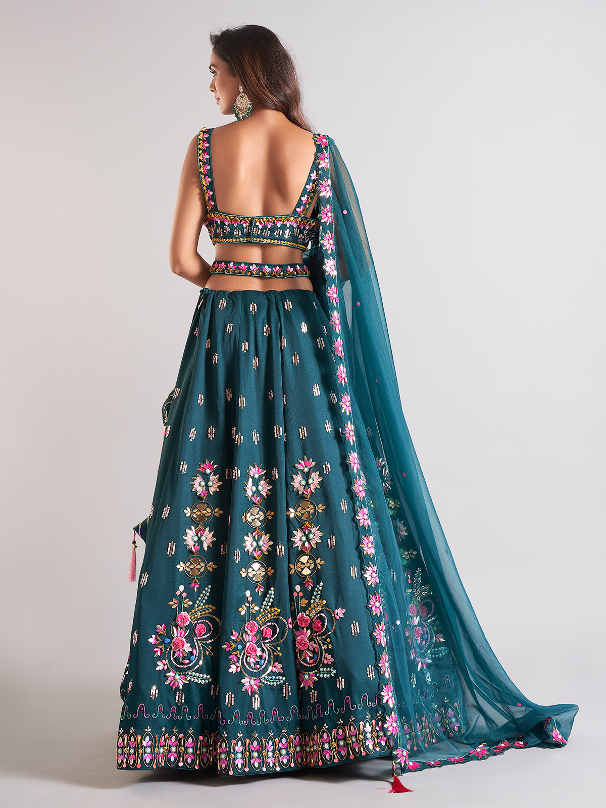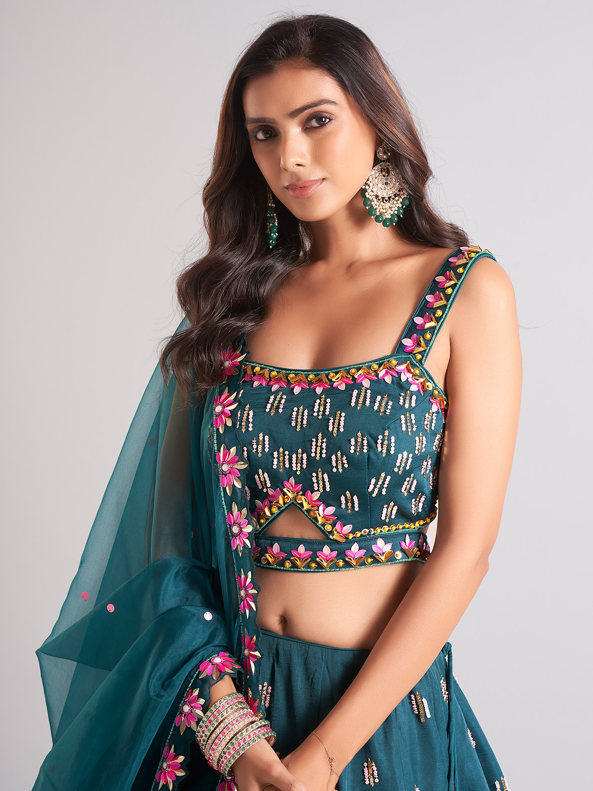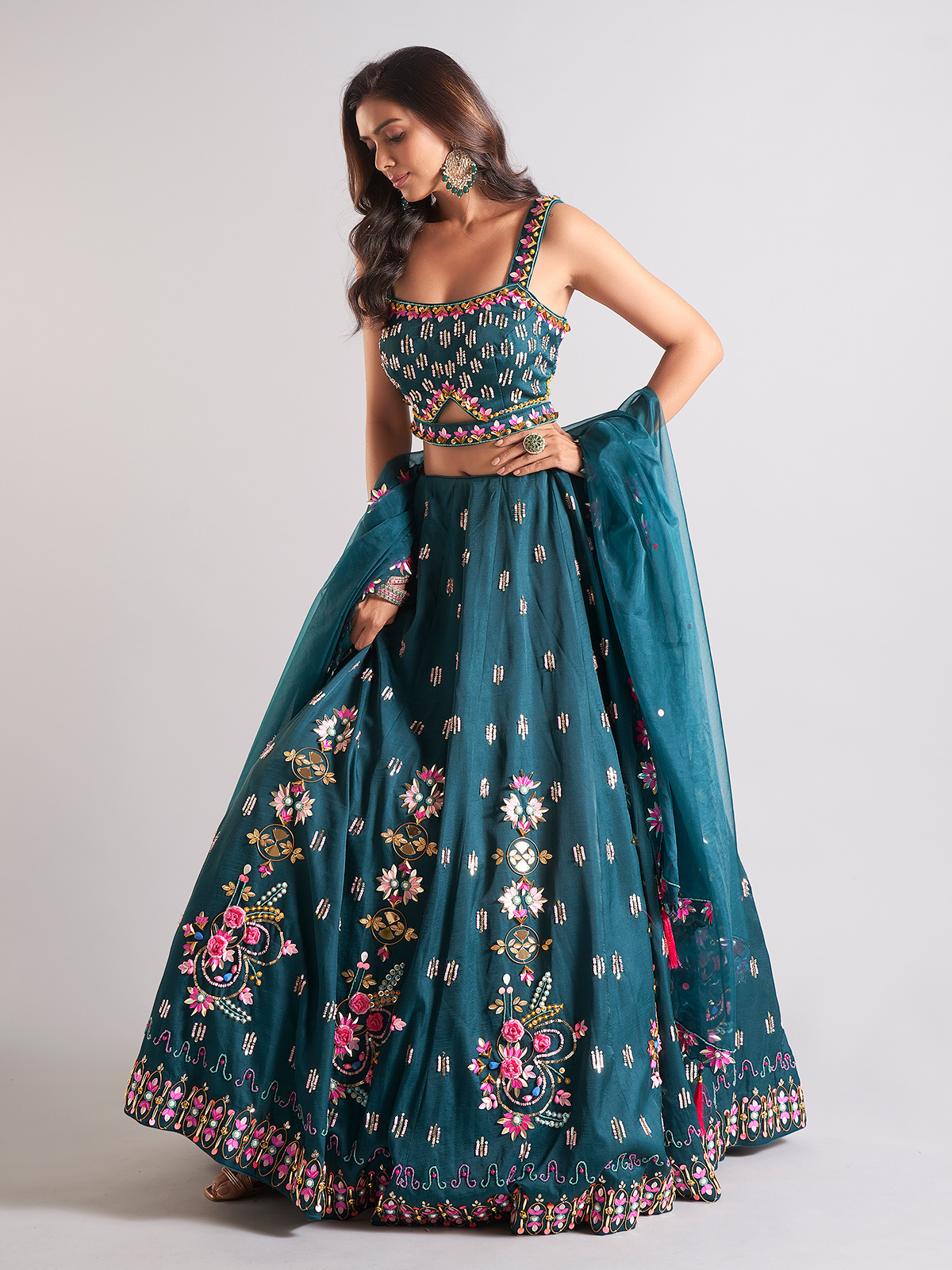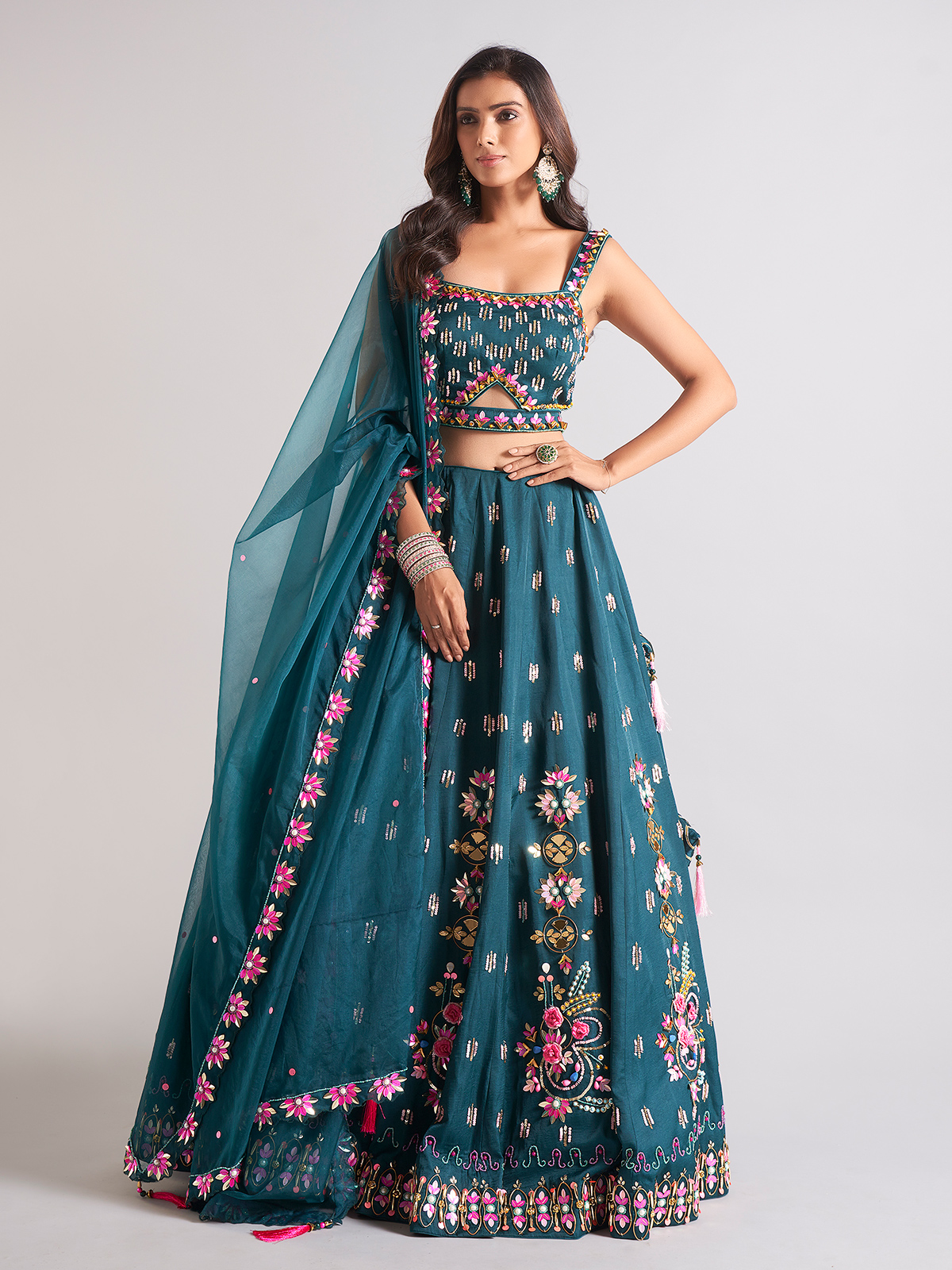 Stand out in this vibrant mint blue silk lehenga choli, featuring exquisite cutdana, sequins, and pearl work. Designed to elevate your look for any wedding occasion.