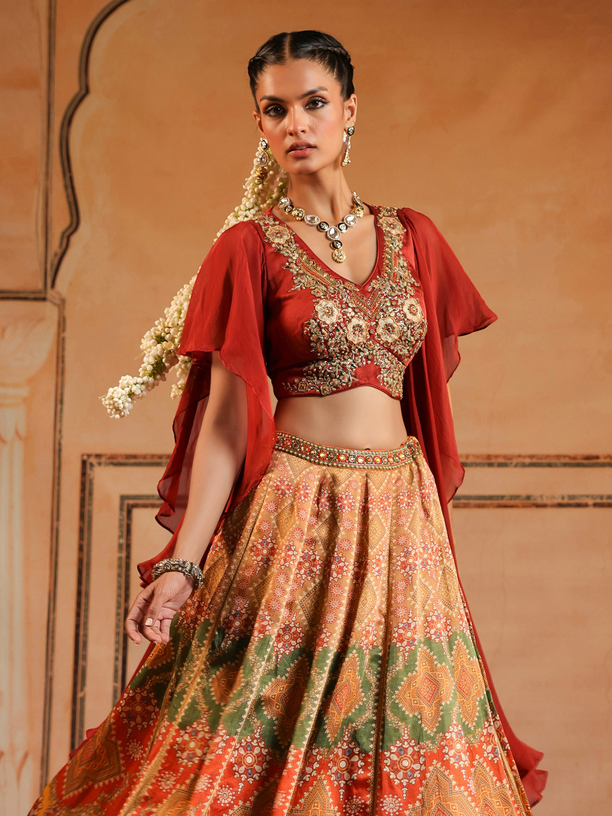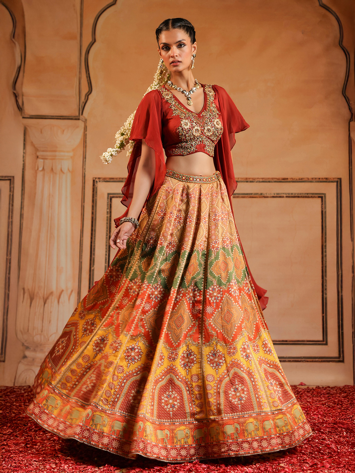 Vivid in multicolor silk, this printed lehenga choli is styled with U neckline choli. Cutdana, beads, sequins, and stone work add sparkling vibrance. Perfect for weddings, the lively hues celebrate festive artistry with elegance.