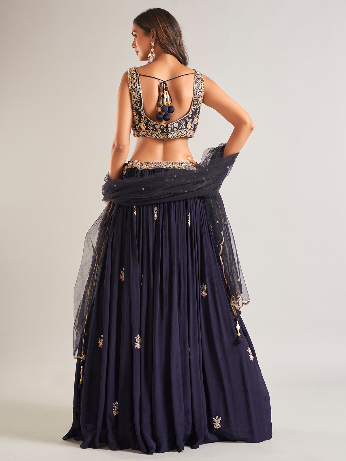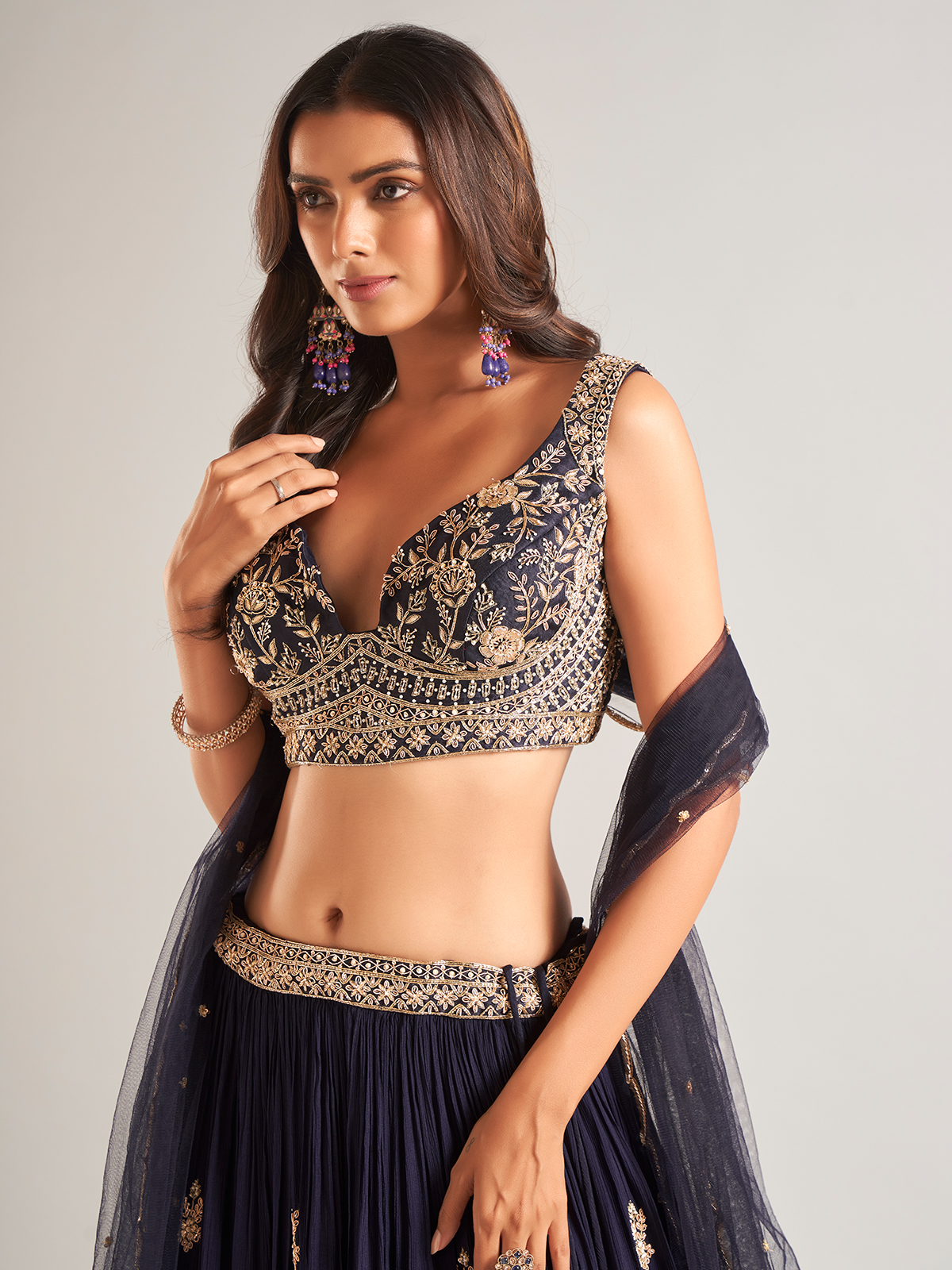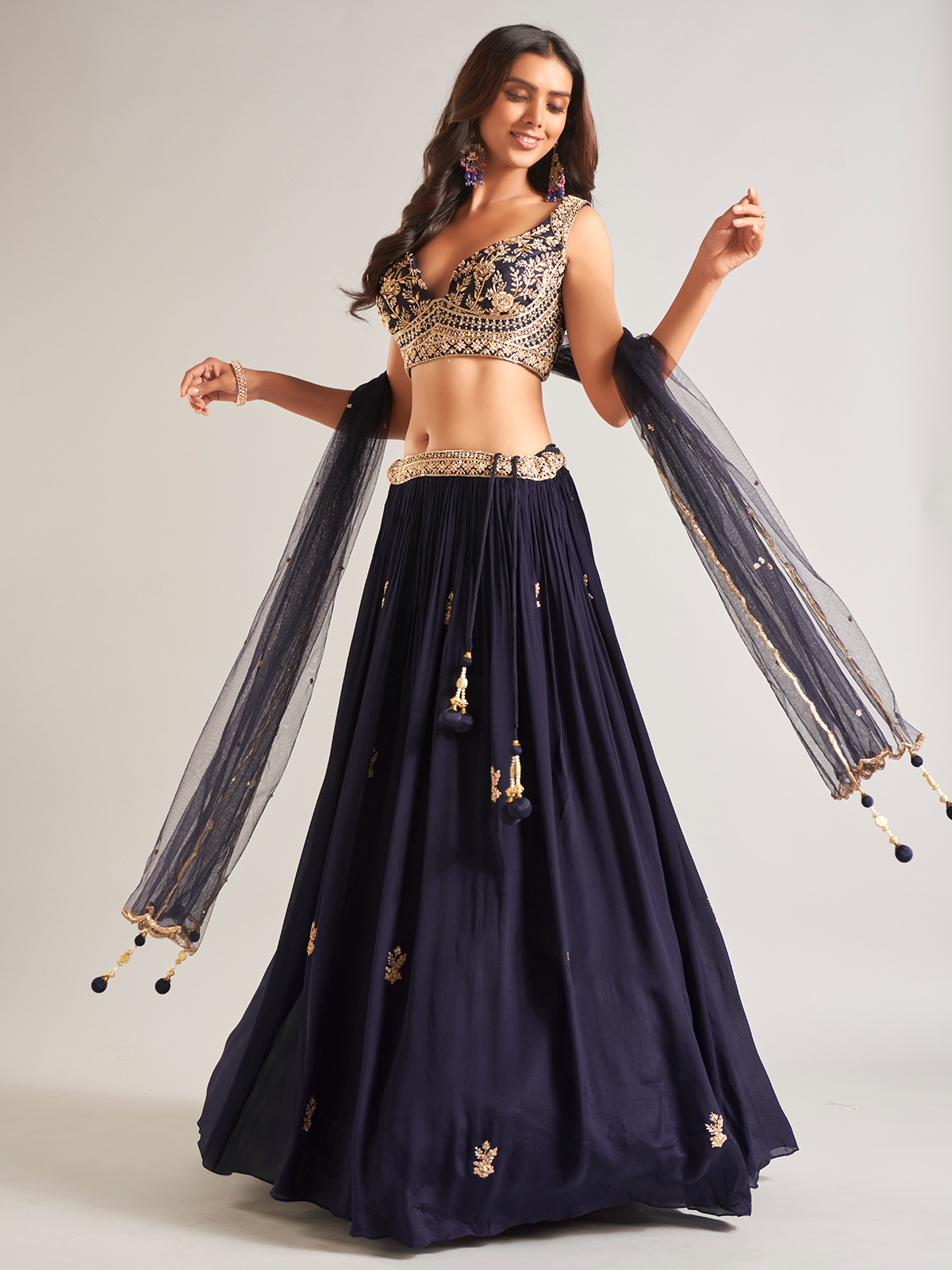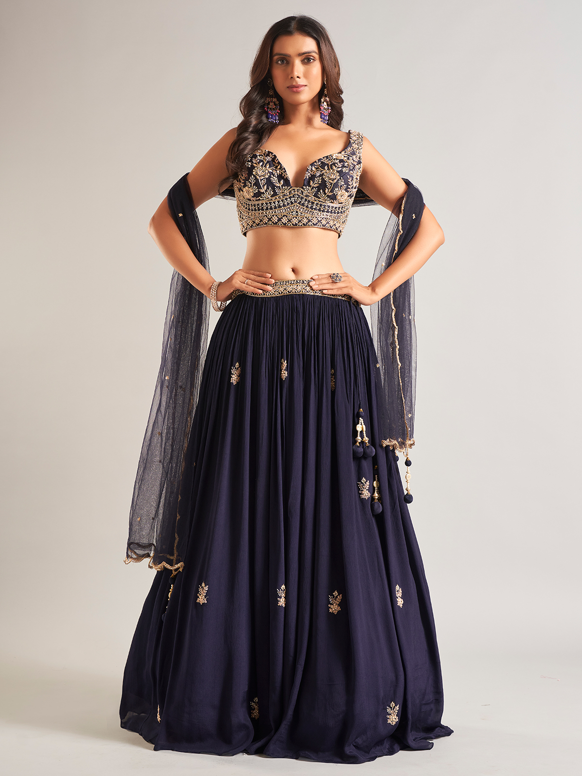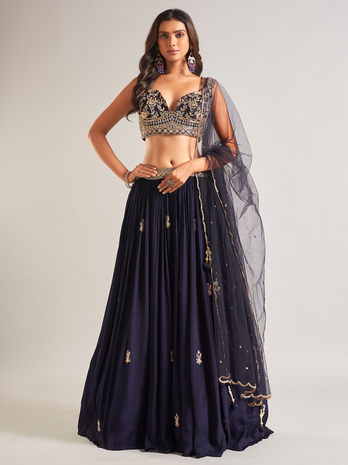 Stay in vogue this season with our navy georgette lehenga choli. Adorned with sequins, pearl, cutdana, beads, zardosi, and resham work, it features a sweetheart neckline and a sleeveless design. Comes with a matching dupatta to complete the look.