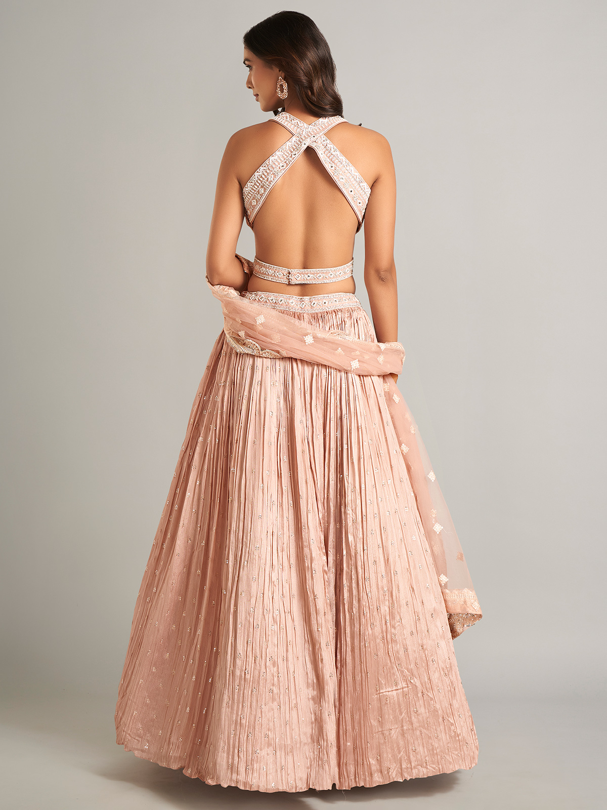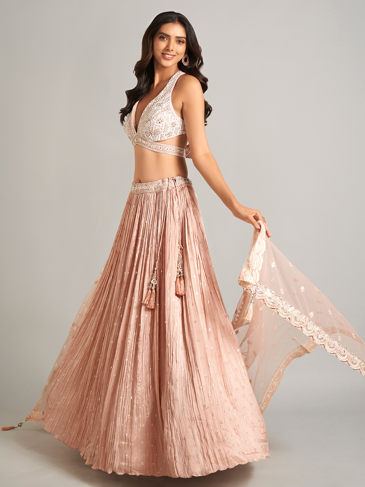Make a lasting impression in this stunning peach lehenga choli with dupatta. Crafted from luxurious lycra fabric, it is adorned with sequins, cutdana, mirror, stone, resham, and zari work, making it the perfect choice for timeless elegance at classic events.