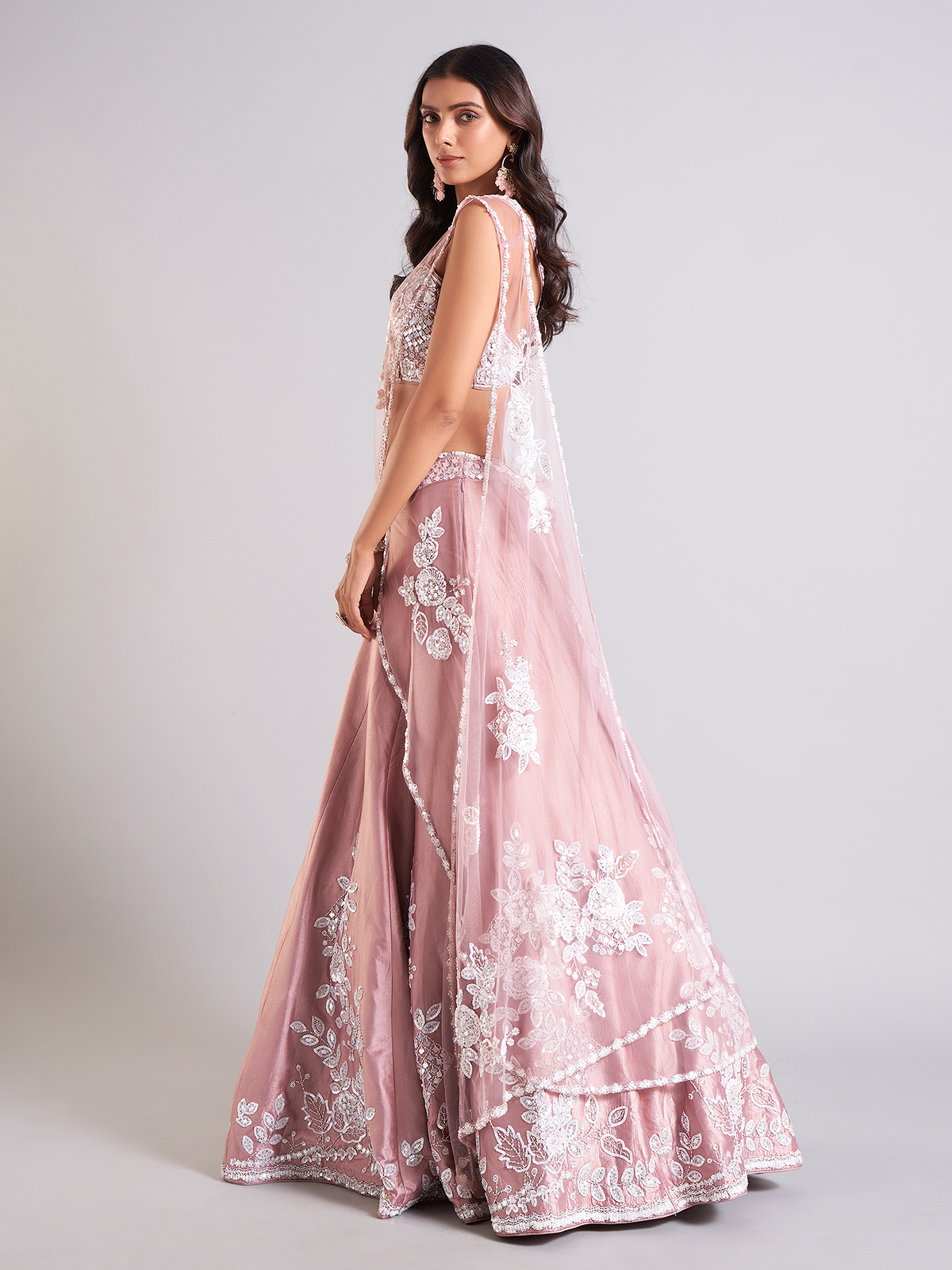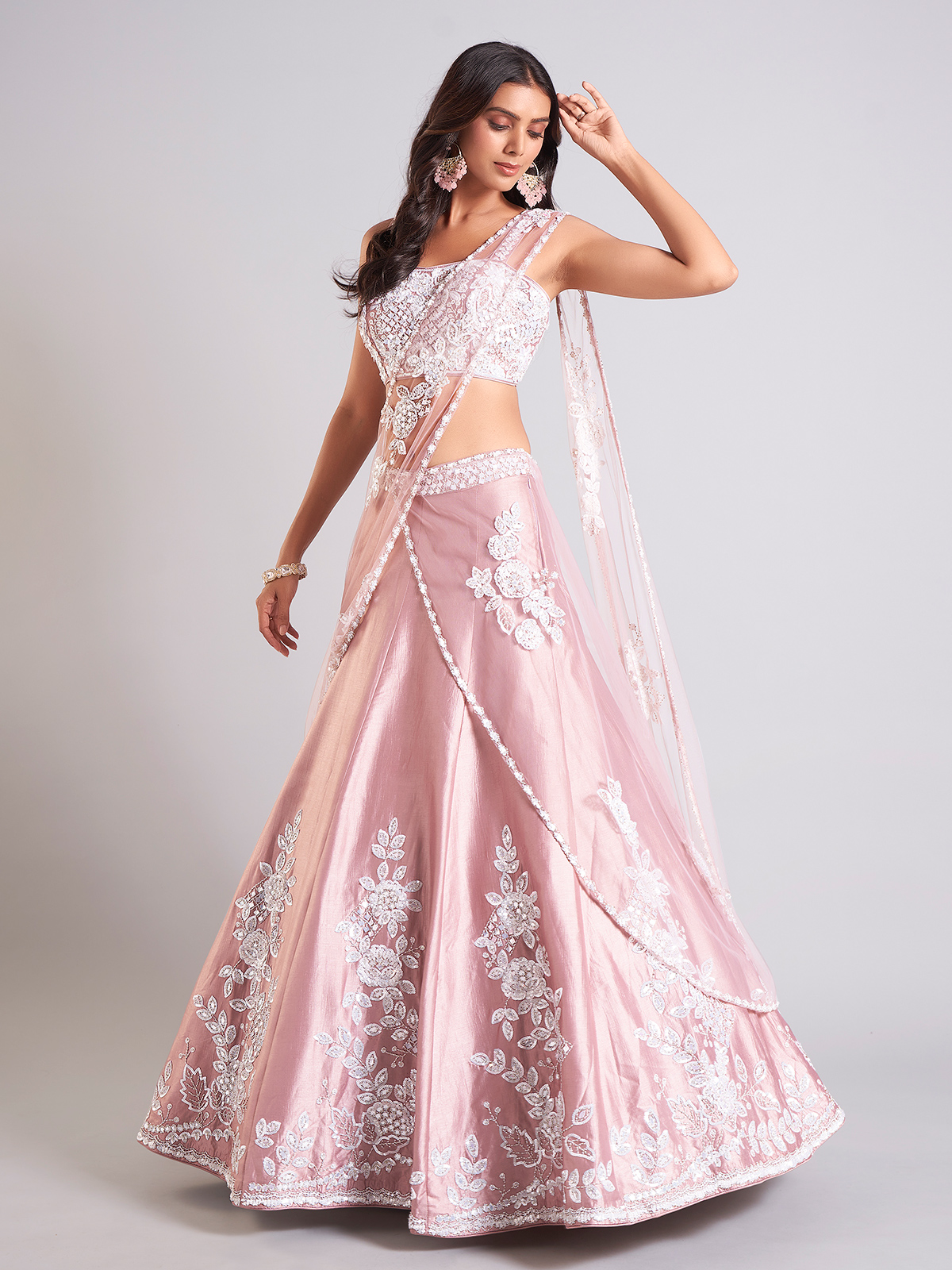 Stand out in this bold pink silk lehenga choli with an attached dupatta. The ensemble is decorated with stunning sequins, cutdana, beads, and aabla work. With its sleeveless choli, this outfit is perfect for classic occasions.
