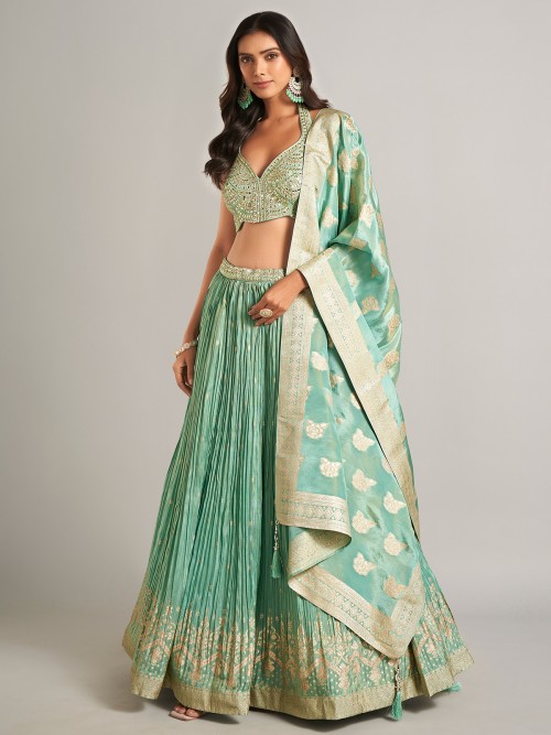 For a sophisticated yet simple look, opt for this pista green silk lehenga choli. With detailed embroidery, aabla, stone, resham, and zari work, the choli features a sweetheart neckline and a sleeveless design, offering both style and comfort.