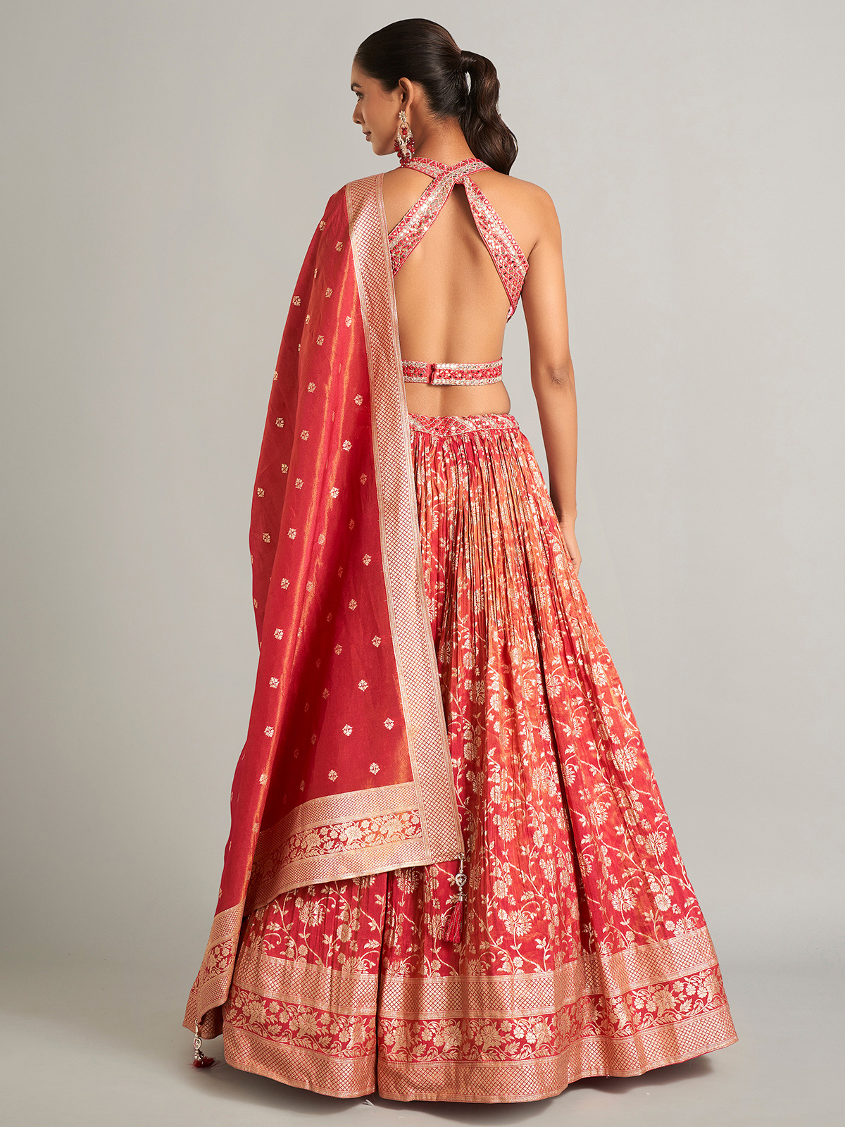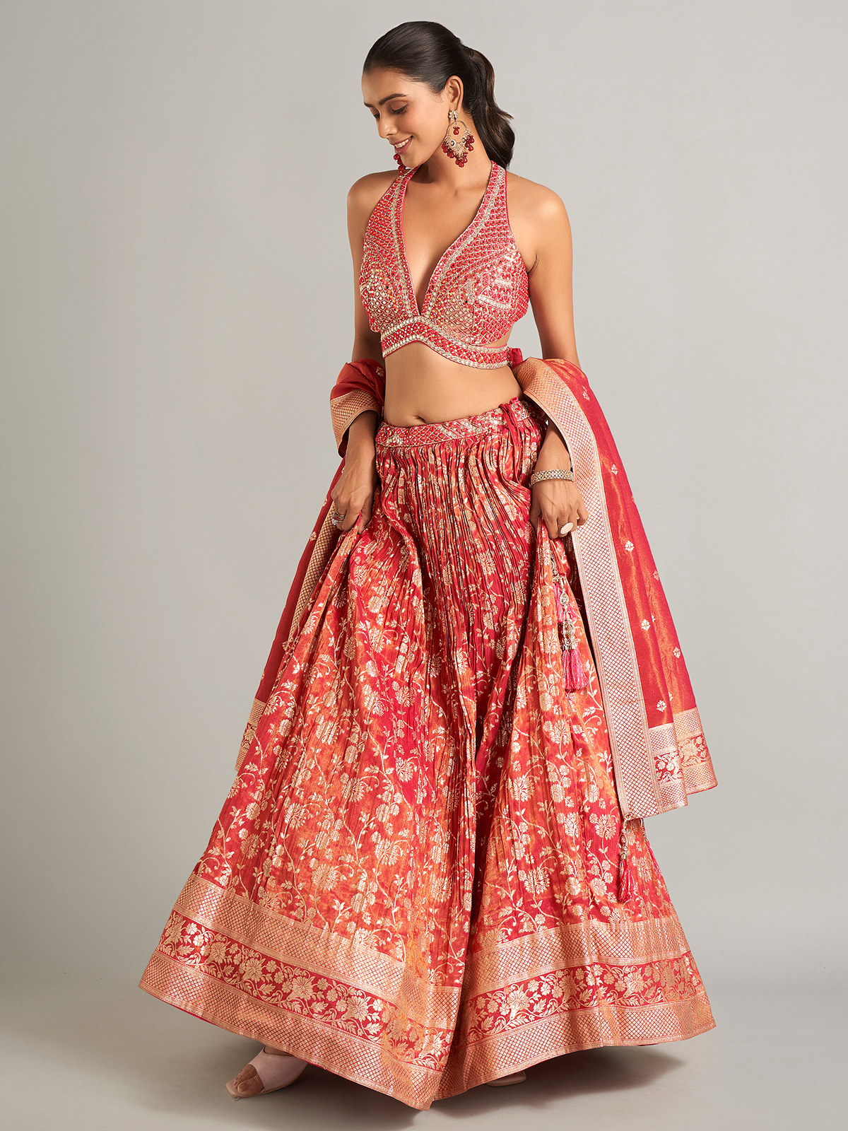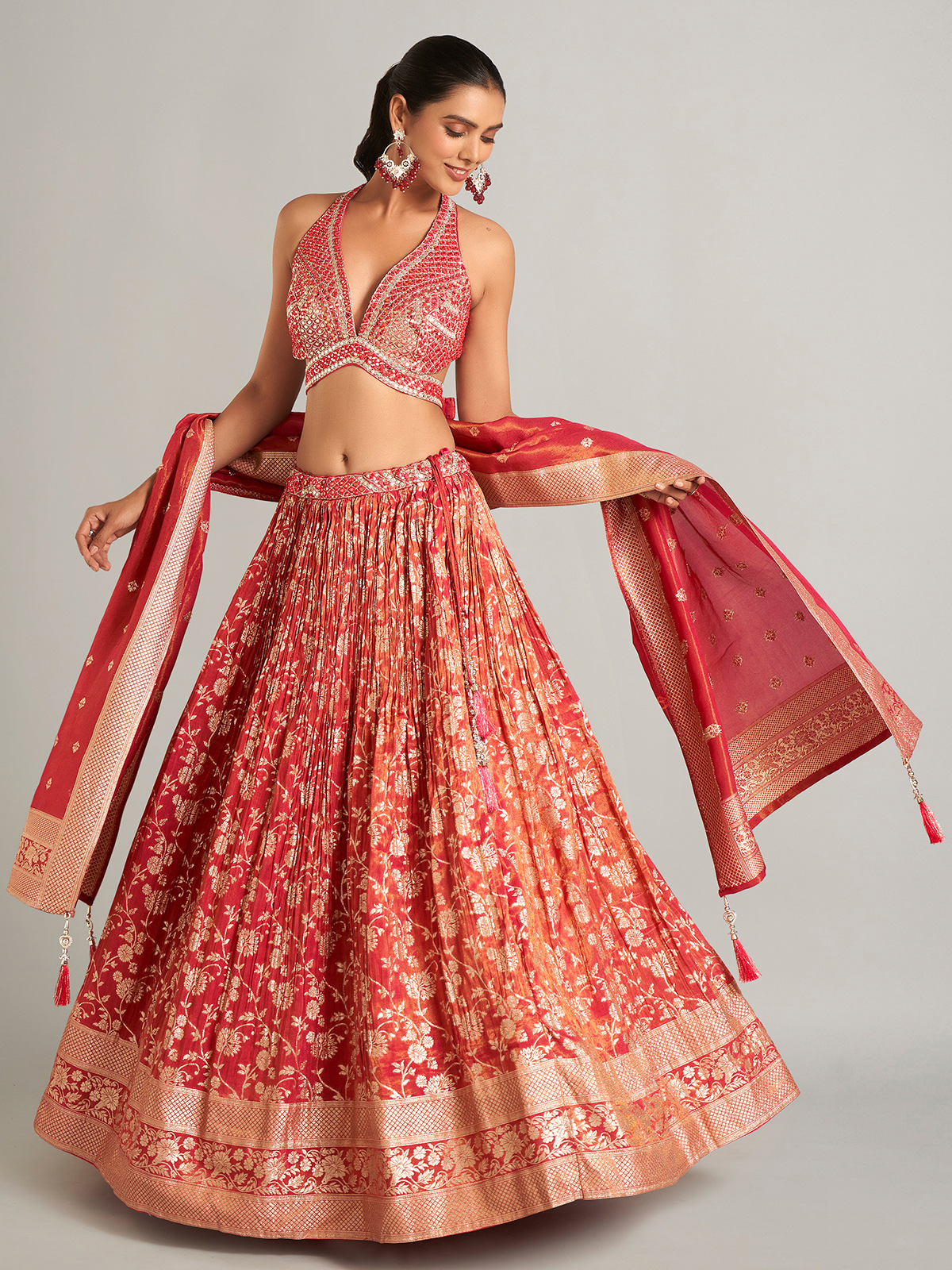 Make a bold statement with this red lycra lehenga choli. Featuring stunning aabla, resham, stone, and zari work, it boasts a sweetheart neckline and sleeveless design, making it perfect for classic occasions. The lehenga is paired with a matching dupatta to complete the look.