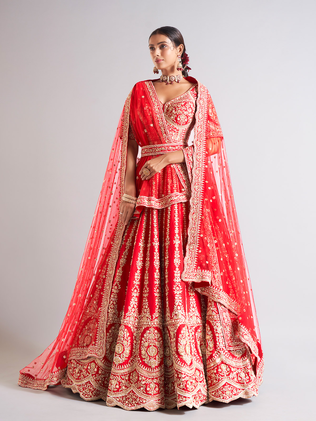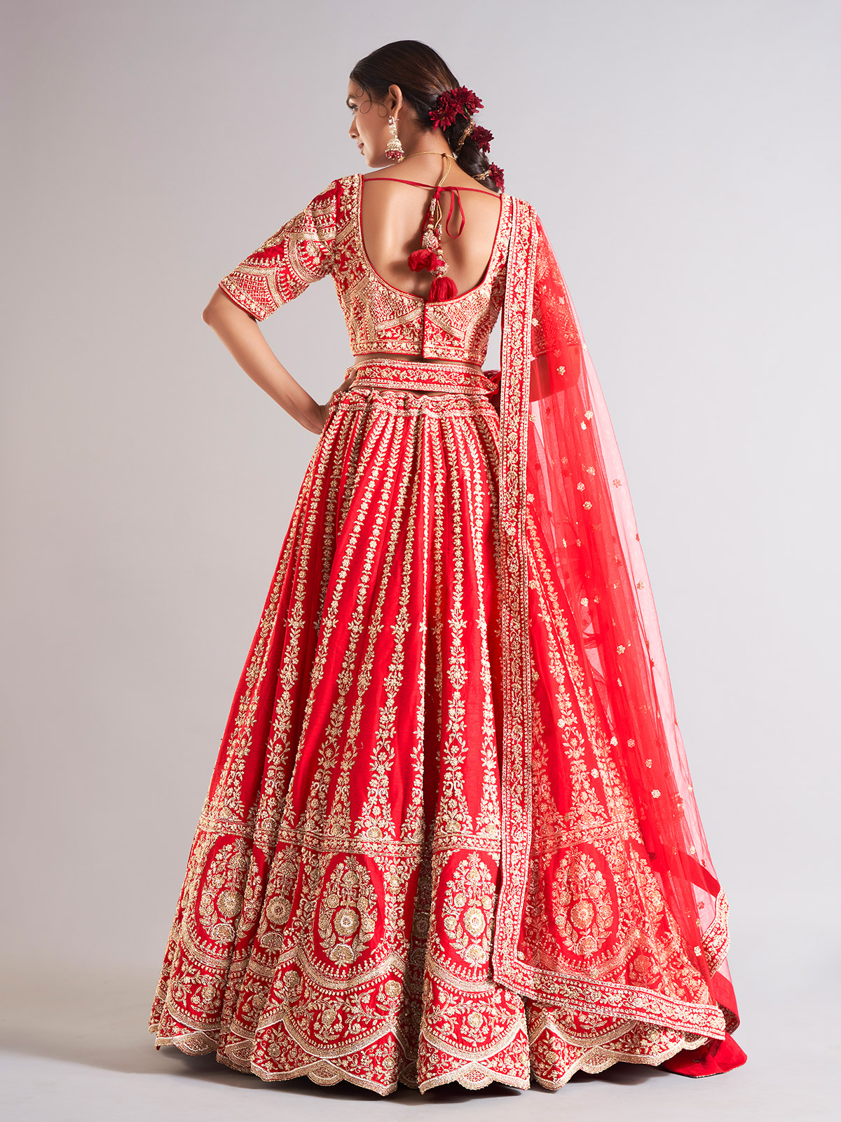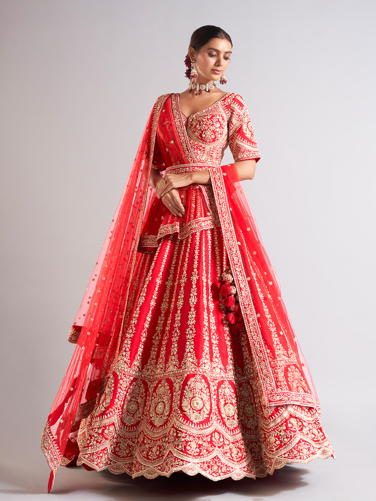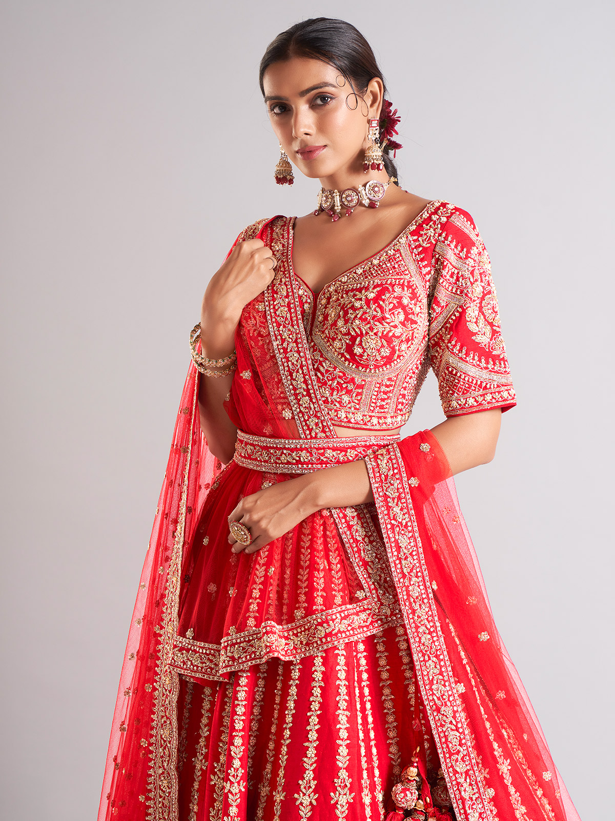 For those who prefer simplicity with a touch of elegance, this red raw silk lehenga choli is the ideal choice. Adorned with cutdana, sequins, resham, and bead work, it features a comfortable V-neck and elbow sleeves.
