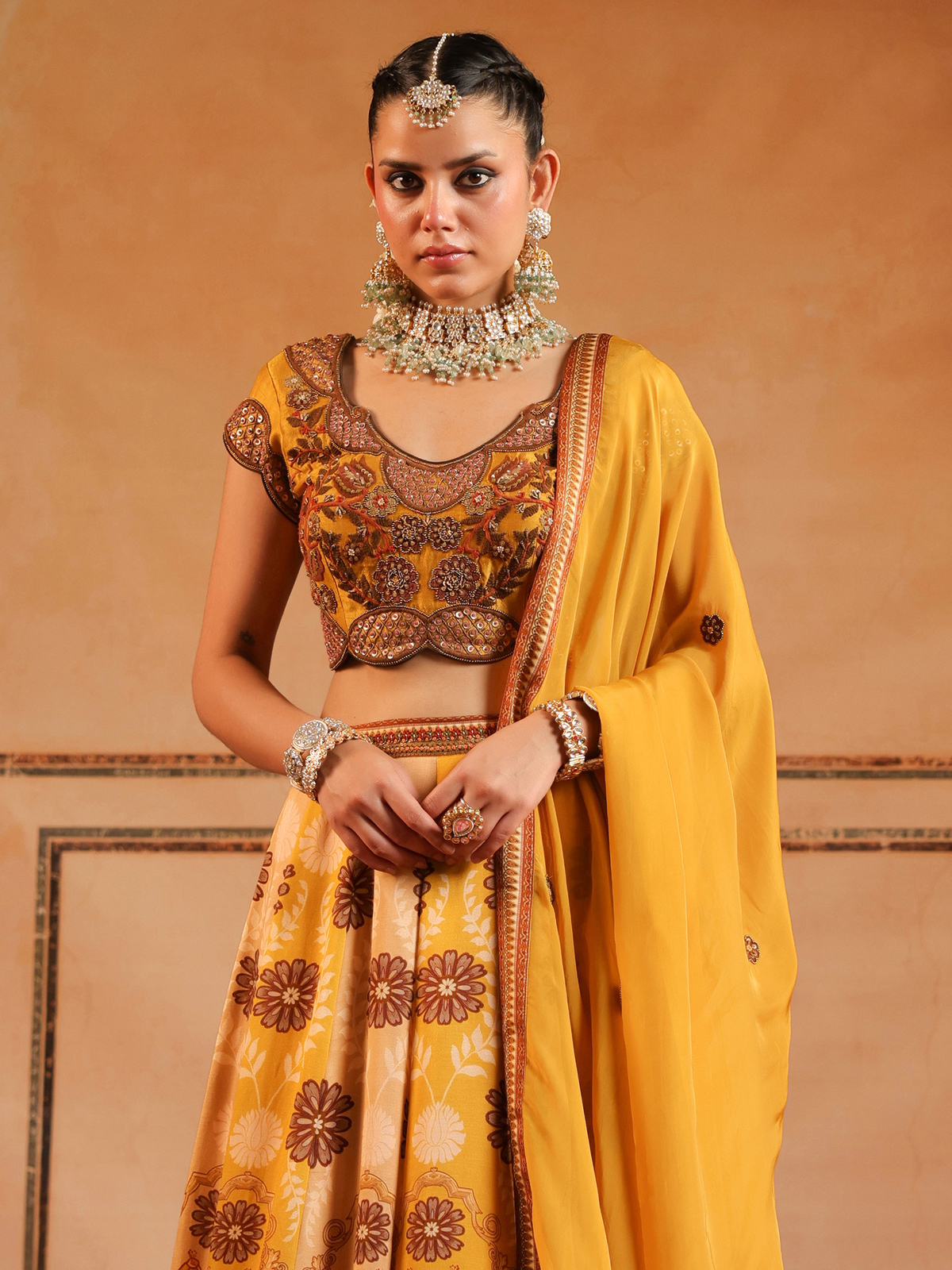 Glowing like sunshine, this yellow silk printed lehenga choli is designed with a cap sleeve choli and dupatta. Zardosi, sequins, beads, thread, and cutdana adorn its festive canvas. An exuberant pick for weddings, it celebrates joy and artistry.