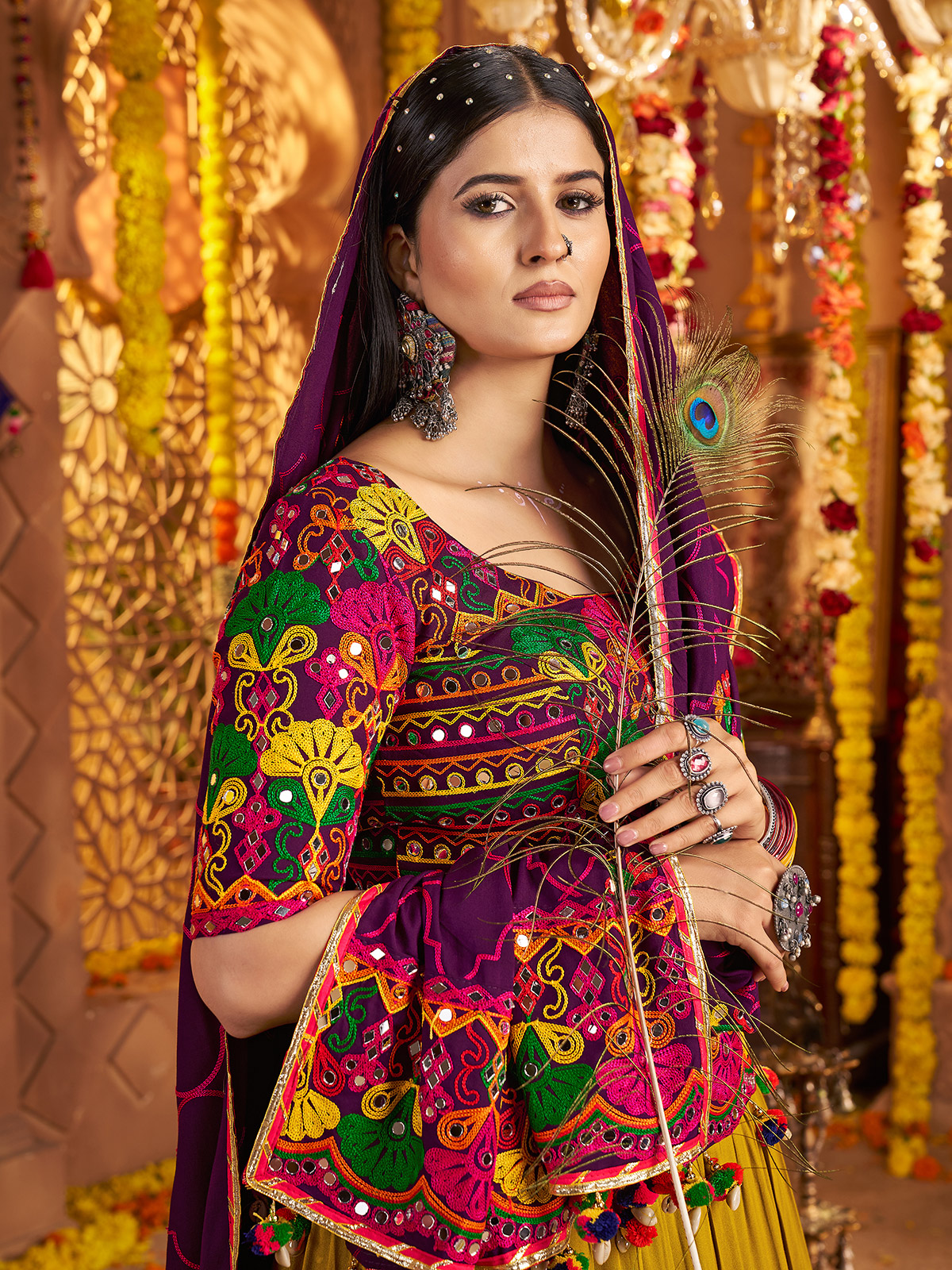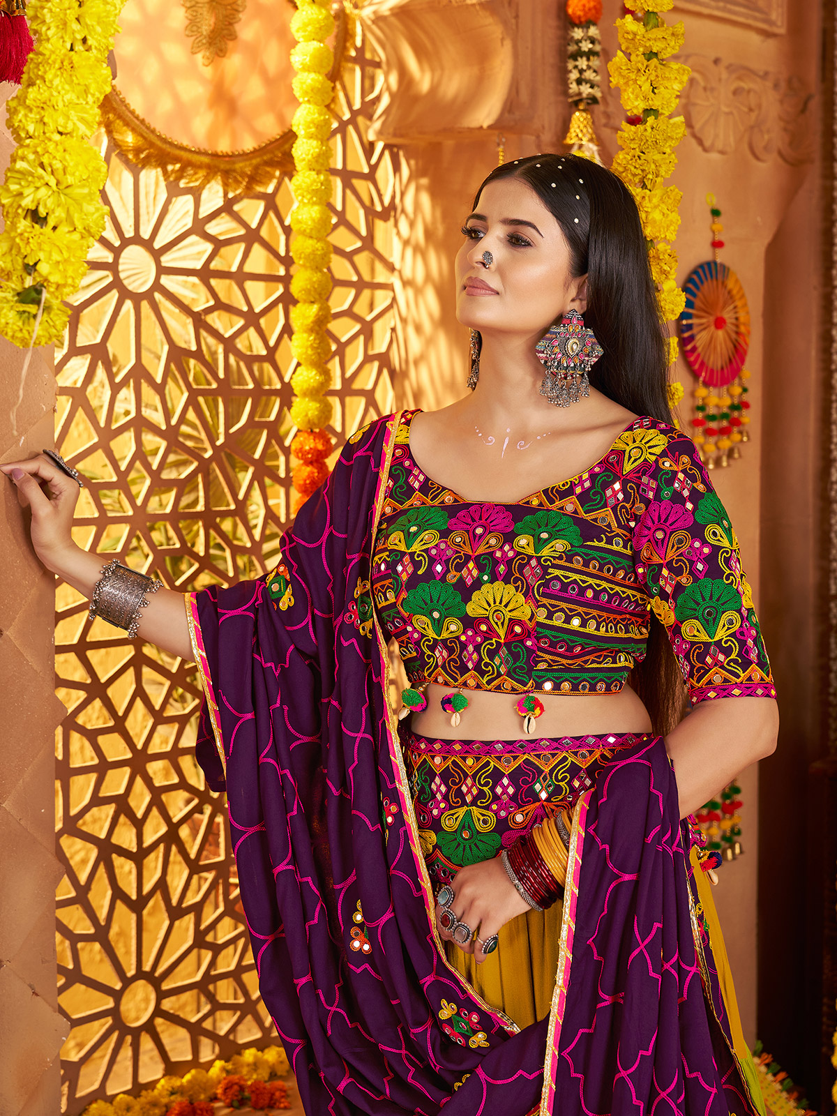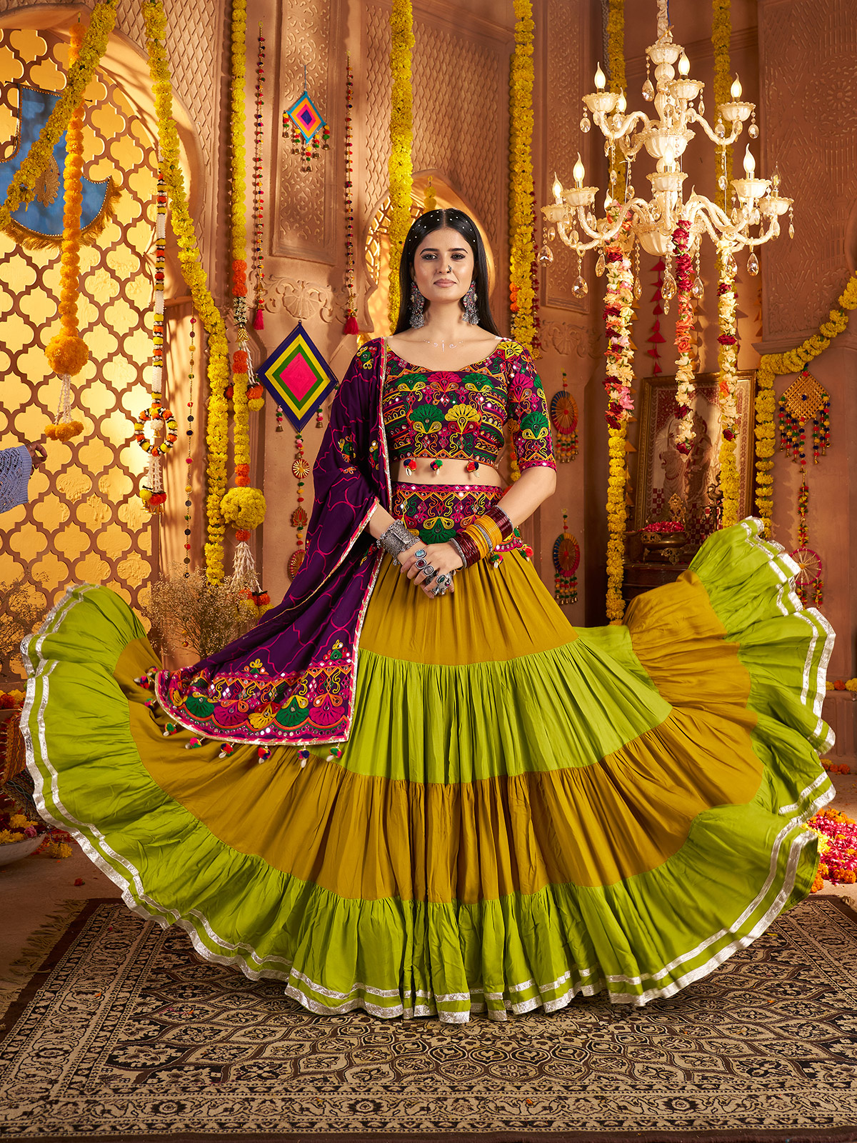 Ready to dazzle on the dance floor this Garba season? This colorful lehenga choli set is your must-have pick. Made from soft viscose cotton, it blends comfort with festive flair. The detailed mirror and resham work adds a touch of sparkle, while the round neckline and half sleeves create a stylish yet traditional silhouette. Finished with an embellished dupatta, this ensemble is perfect for twirling your way through Navratri in style.