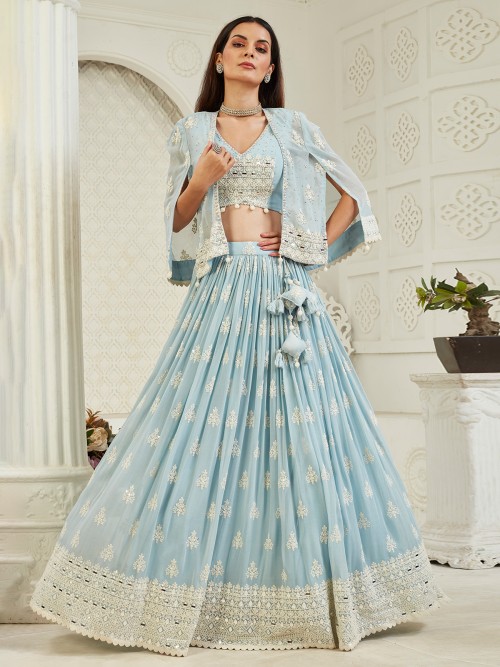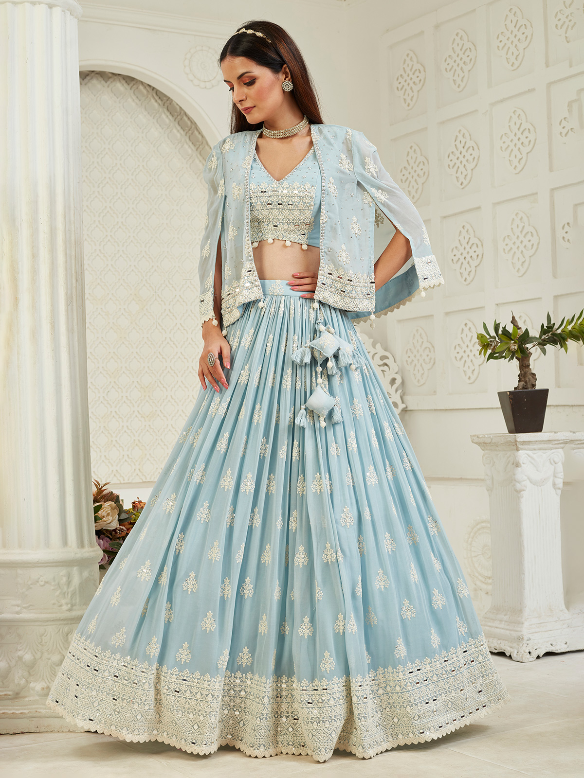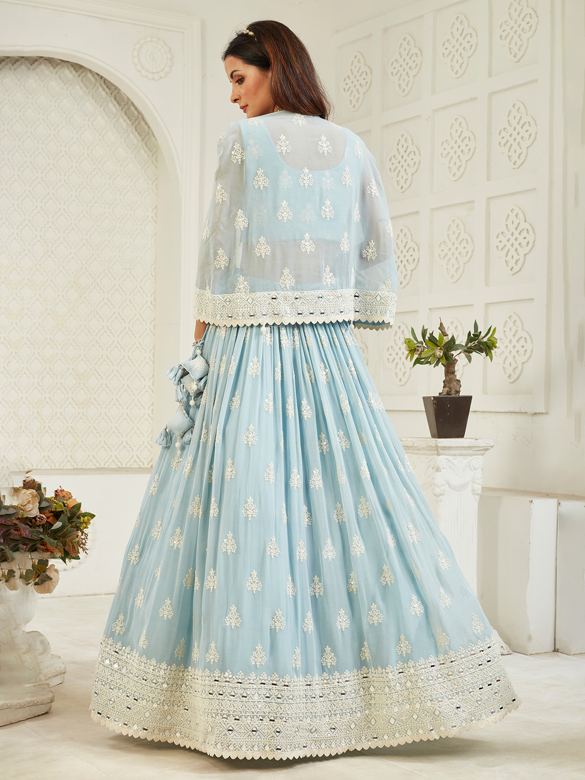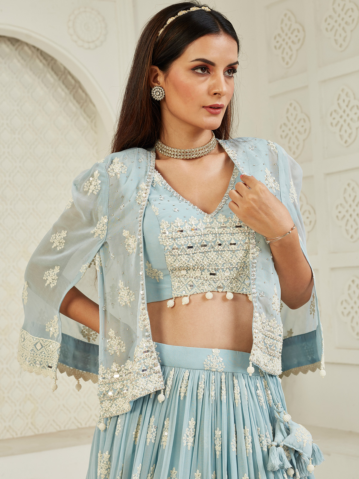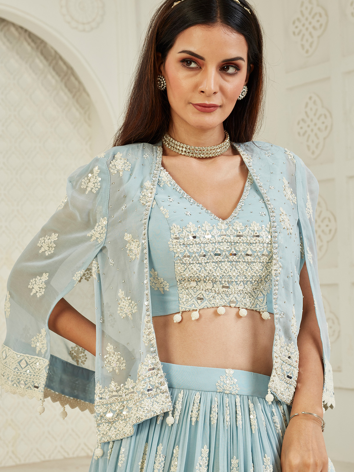 Crafted in mint blue georgette, this jacket style lehenga choli is adorned with embroidery, pearls, thread, stone, aabla, and cutdana work. A refined pick for wedding and reception functions, it blends elegance with festive flair. Comes with a dupatta.