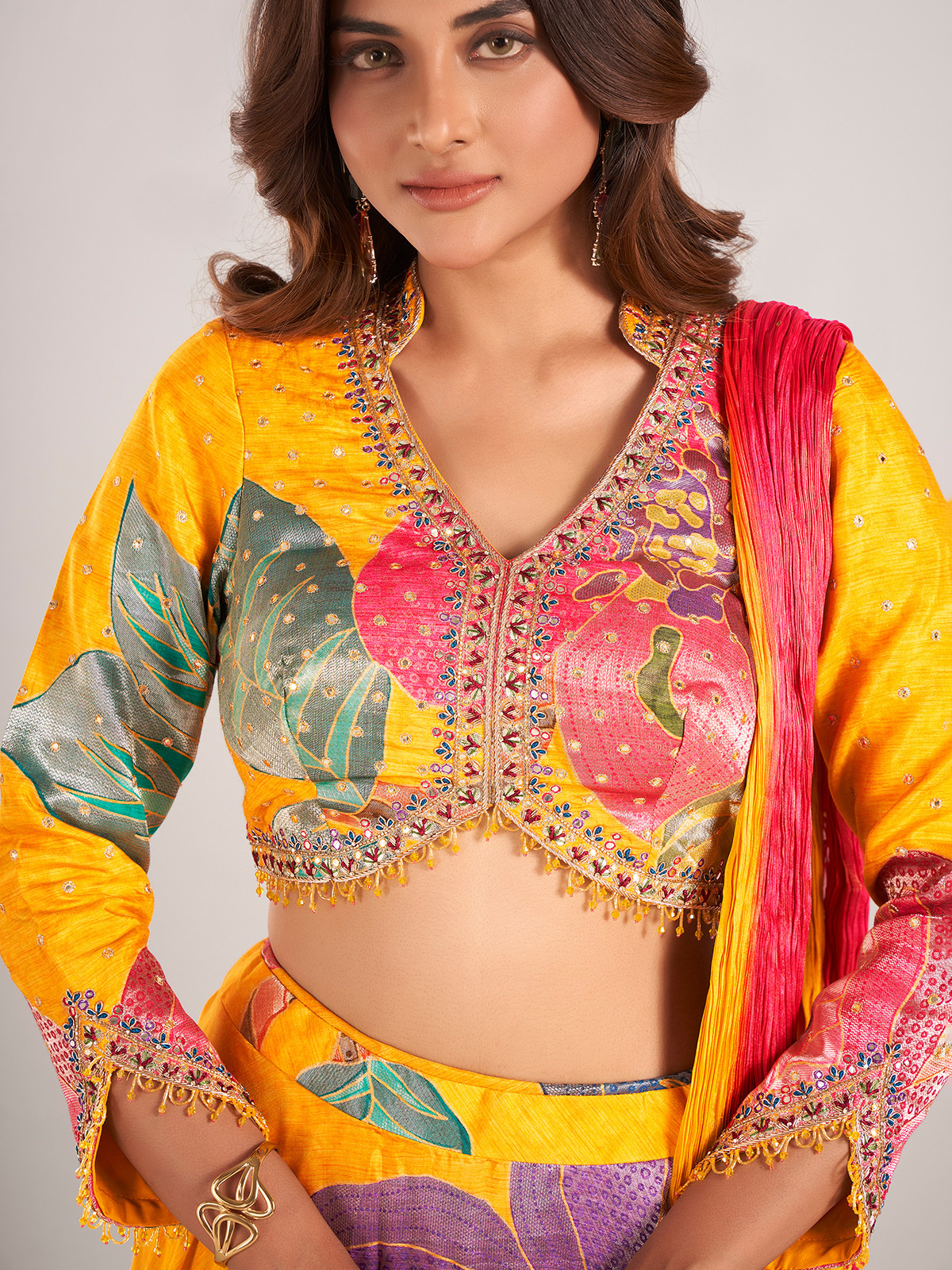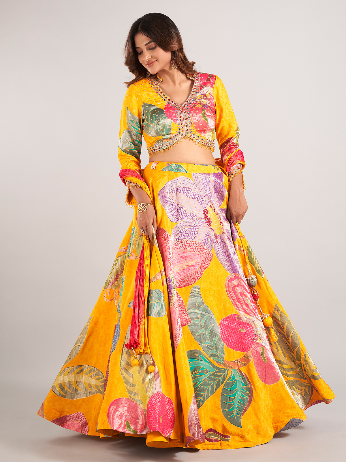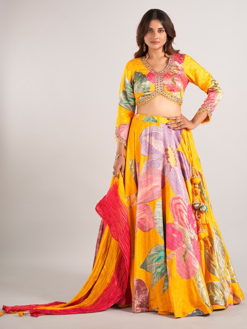 Step into the spotlight with this striking mustard yellow printed silk lehenga choli, complete with a dupatta. Showcasing exquisite craftsmanship, it features intricate aabla, zardosi, thread, cutdana, and stone work that adds a rich, traditional charm. The V-neckline and quarter sleeves lend a graceful silhouette, making it a perfect choice for weddings, festive celebrations, and classic occasions where you want to stand out in style.