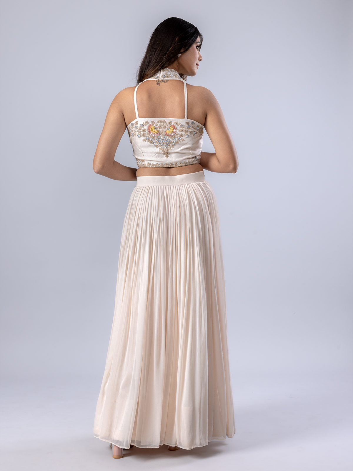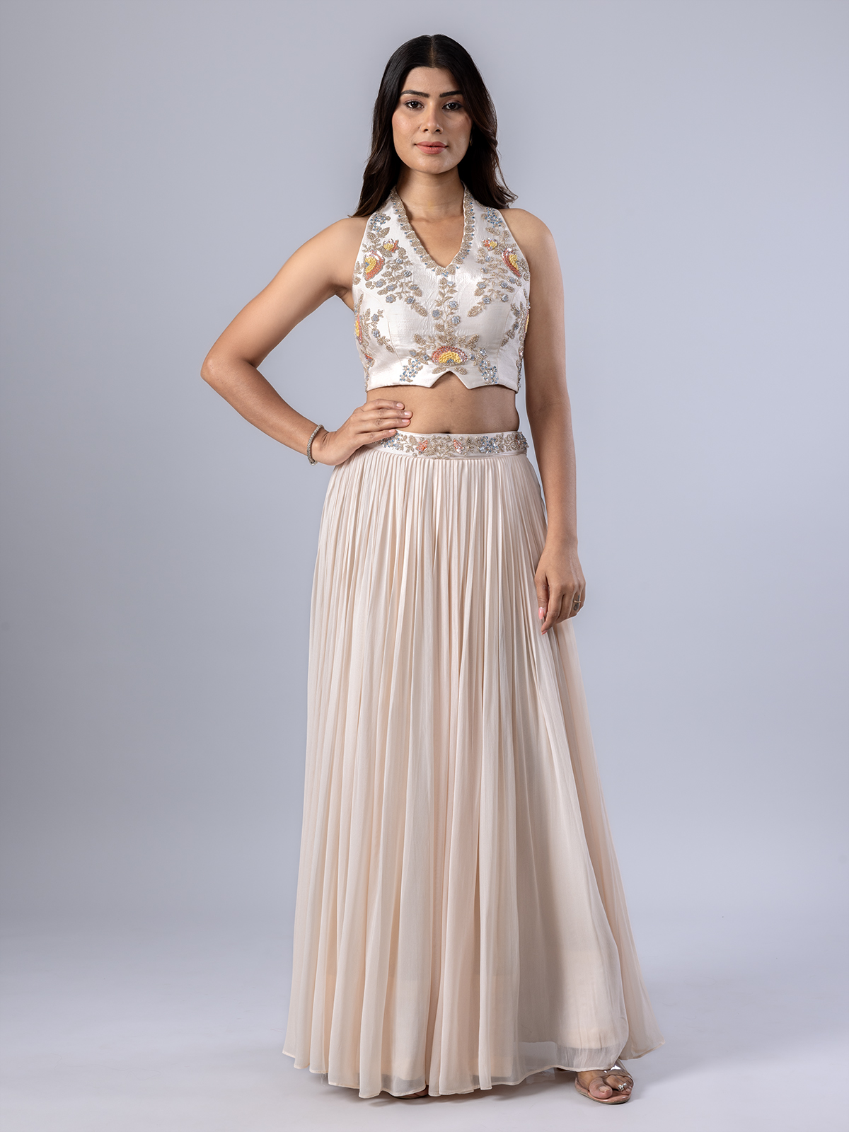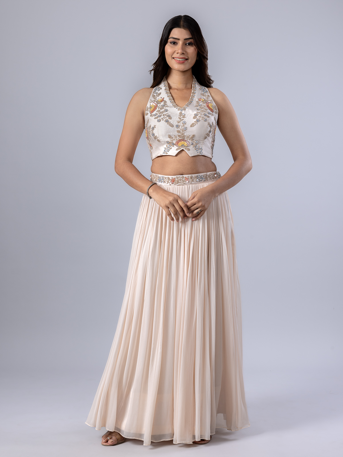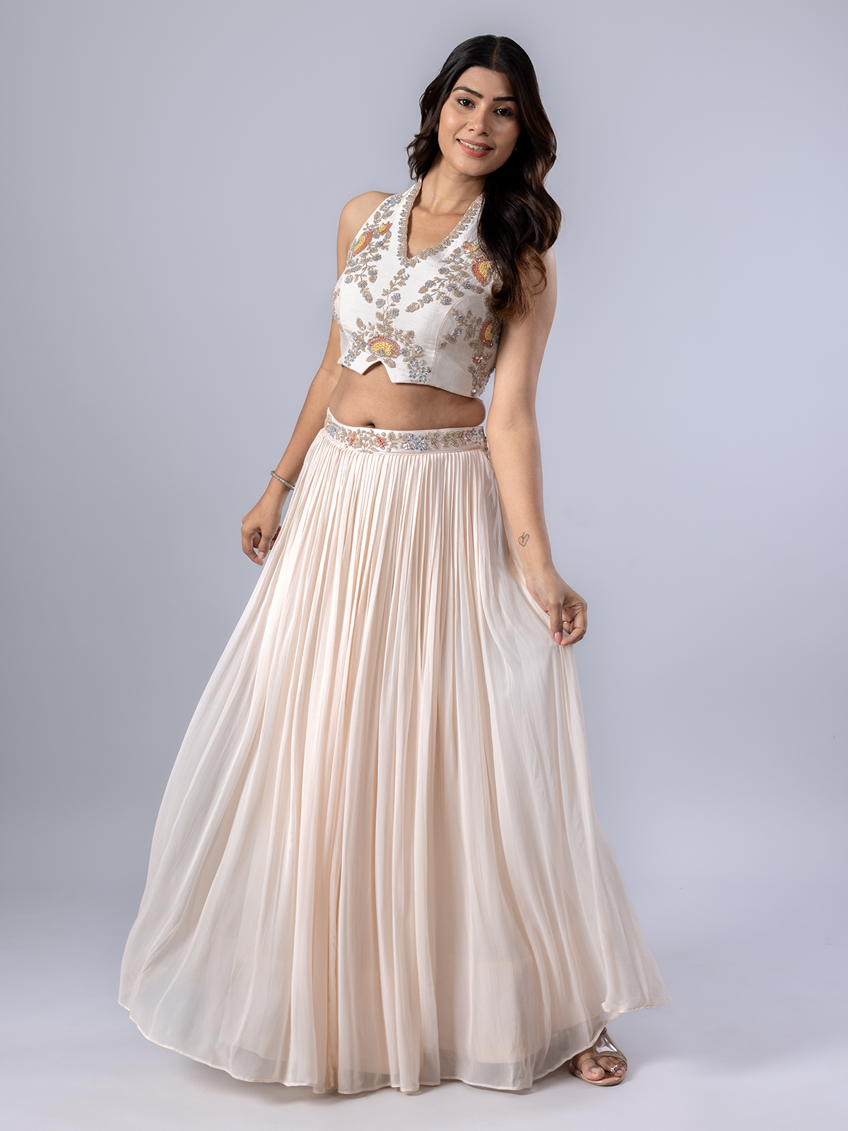 This white georgette lehenga choli beautifully blends tradition with modern flair. Embellished with sequins, beads, cutdana, and thread work, it radiates subtle sparkle, making it ideal for weddings or receptions. The sleeveless V-neck choli adds a chic touch, while the dupatta enhances its timeless elegance.