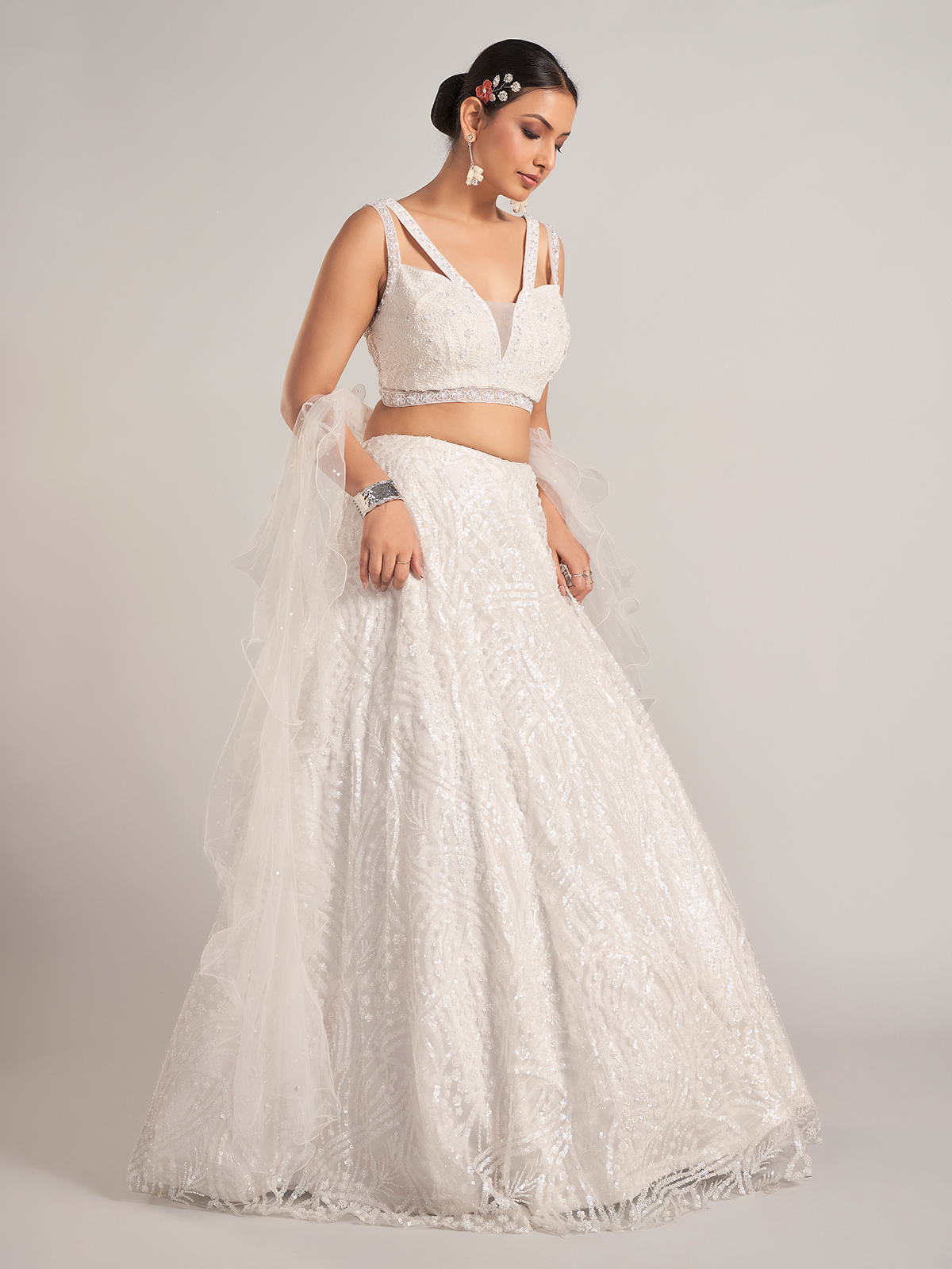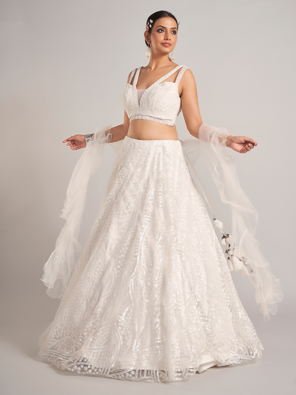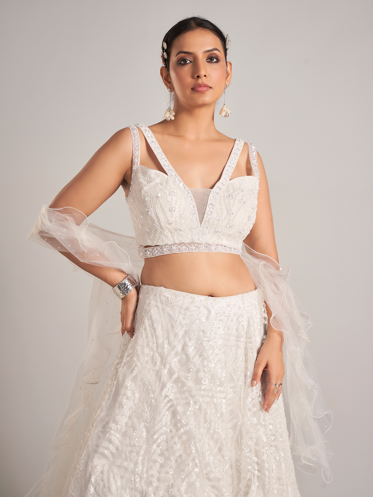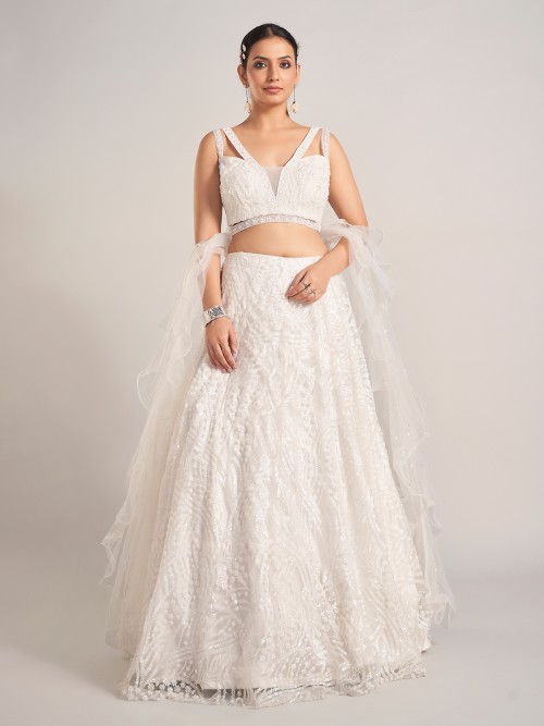 Exude ethereal beauty in this white net lehenga choli embellished with cutdana, sequins, pearls, and beads. Styled with a V neckline, sleeveless cut, and ruffle dupatta, it makes an exquisite choice for receptions and evening gatherings.