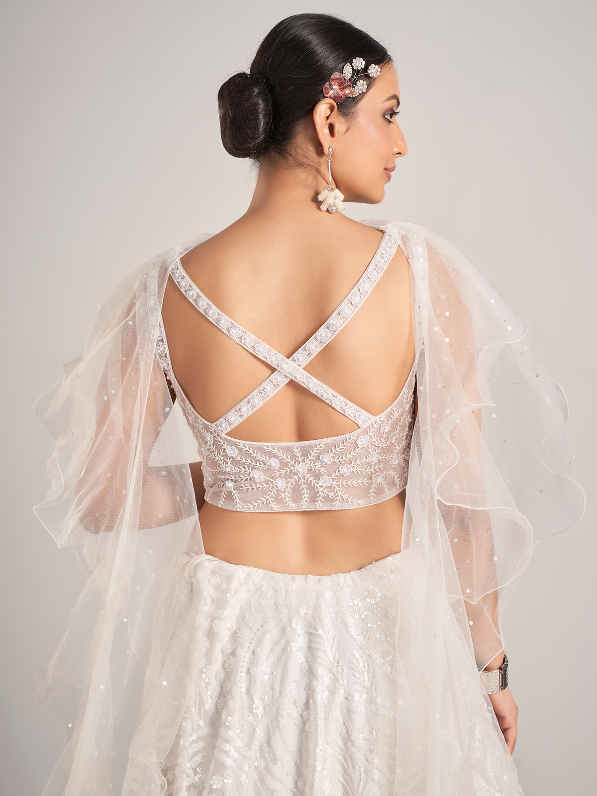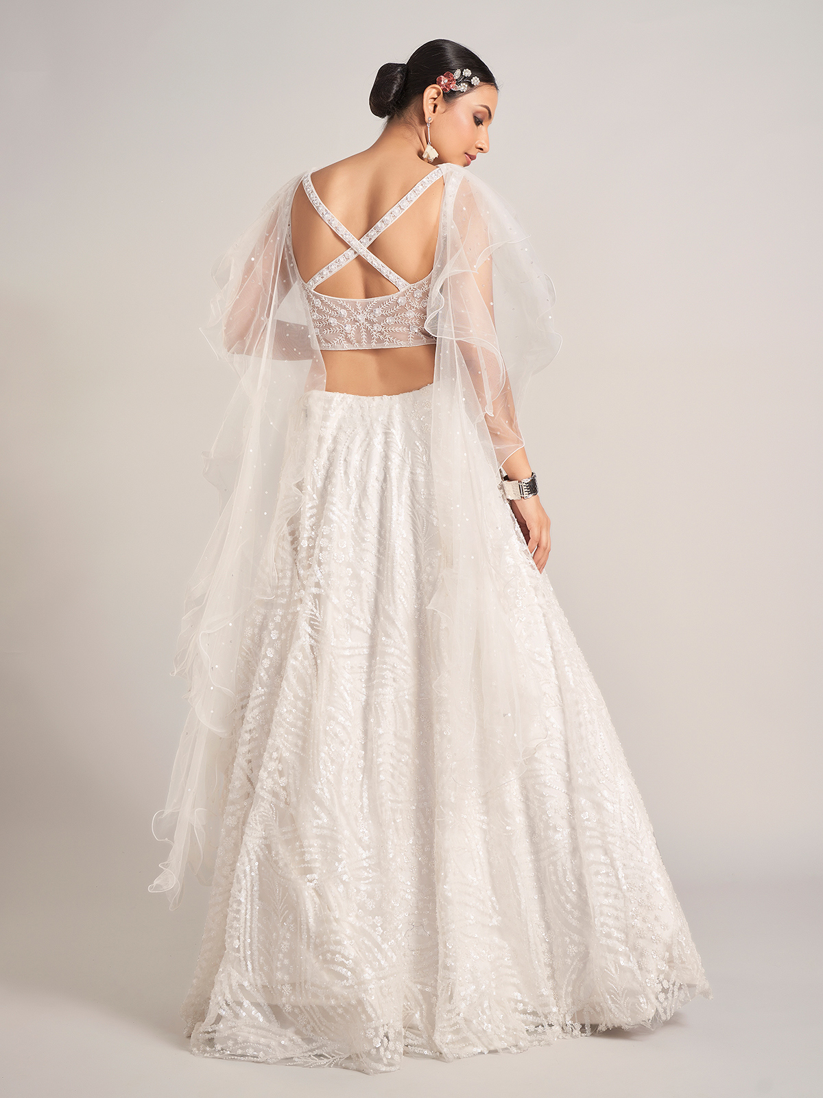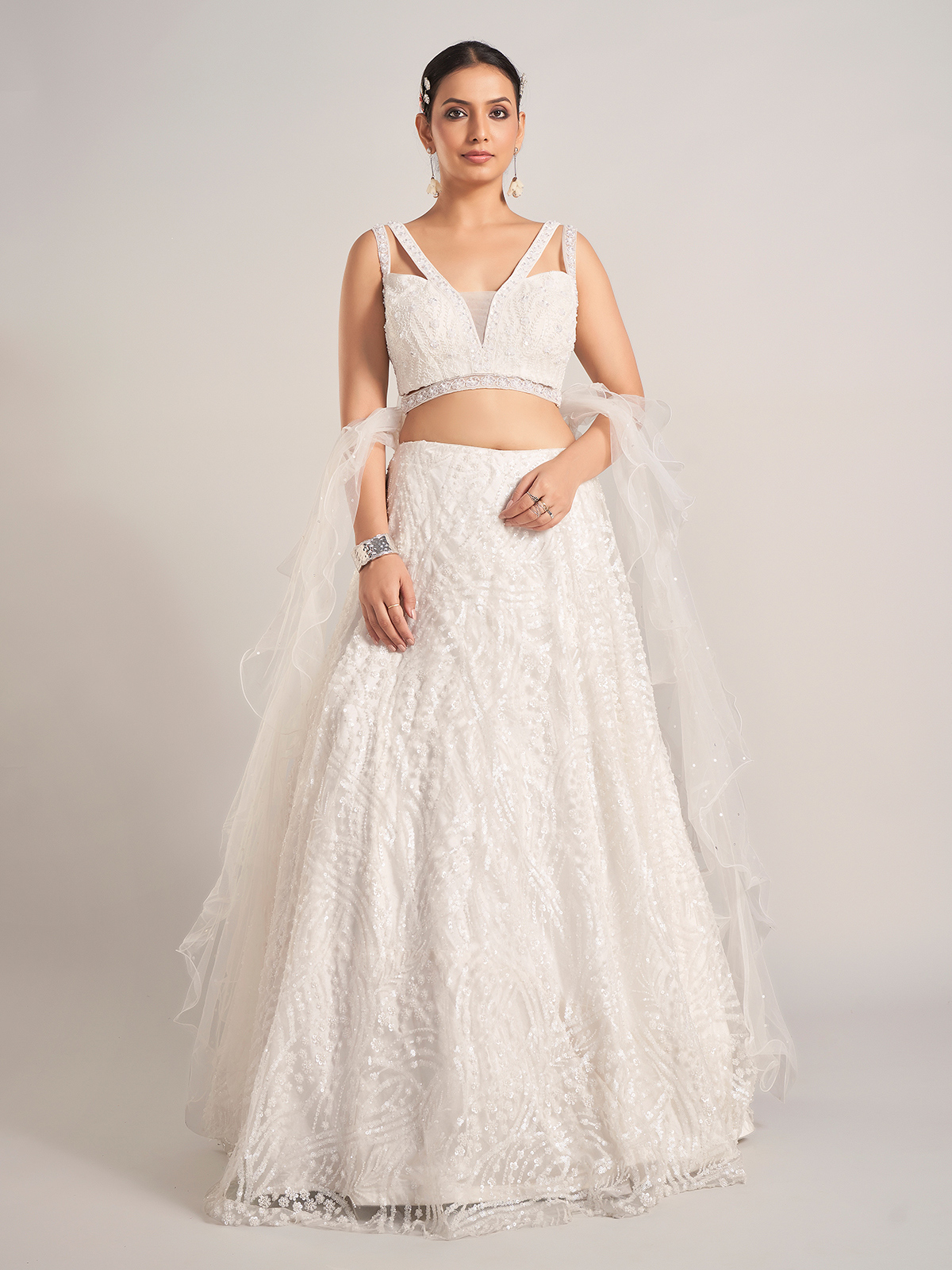 White Net Lehenga Choli With Ruffle Dupatta For Reception