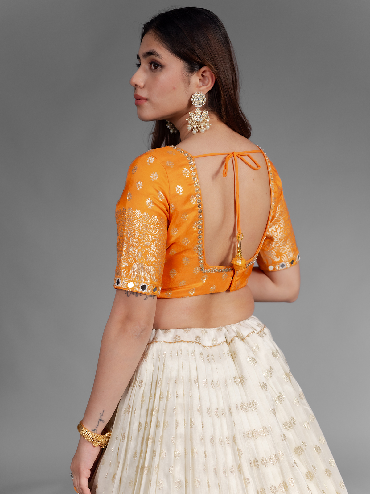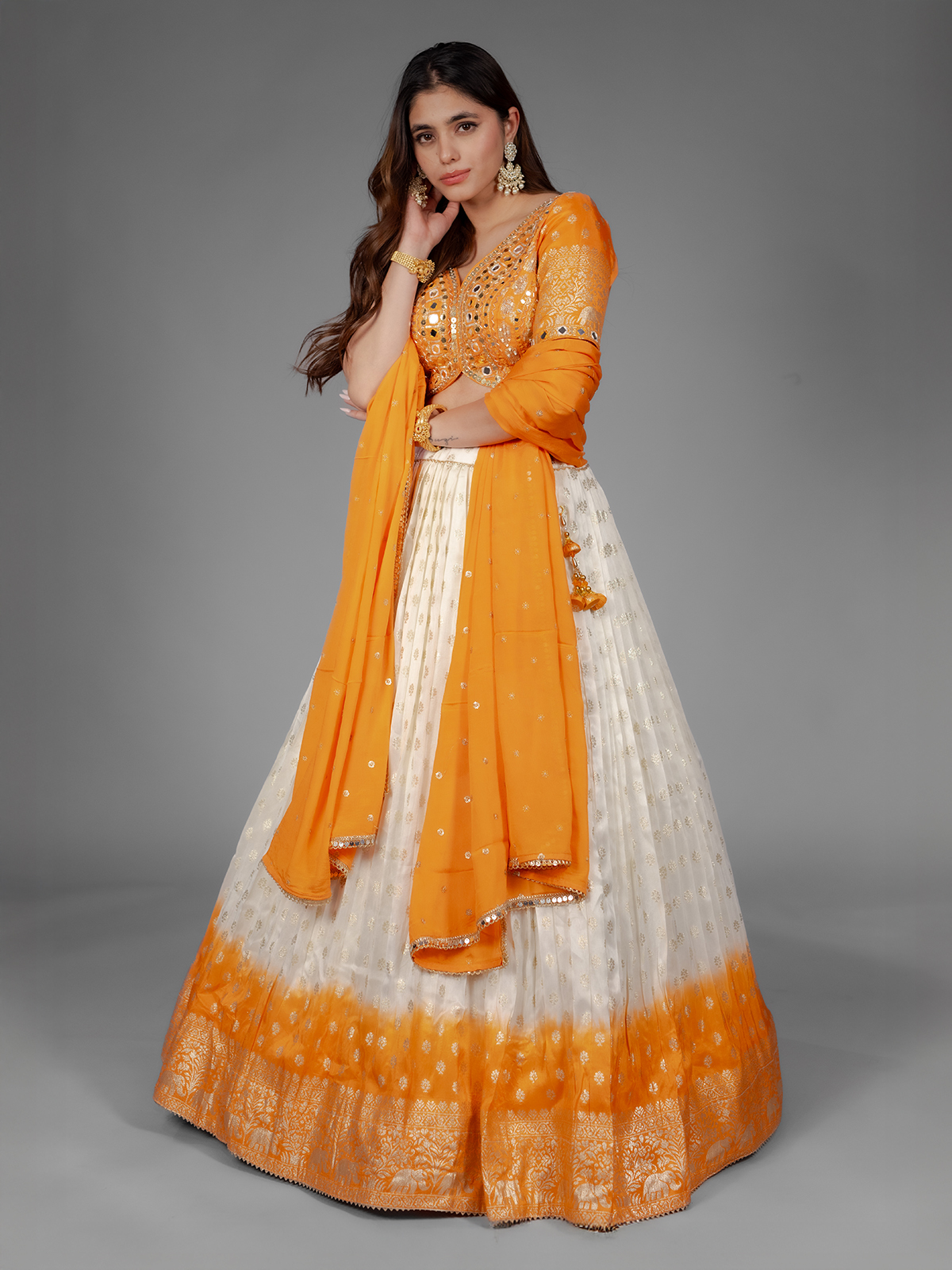 Radiating warmth, this white and orange shaded silk chaniya choli features mirror, aabla, sequin, cutdana and zari craftsmanship. The half sleeve V neck styling offers balance, while the coordinated dupatta completes the festive flow. Designed for joyful movement, this ensemble shines at sangeet ceremonies and lively navratri nights.