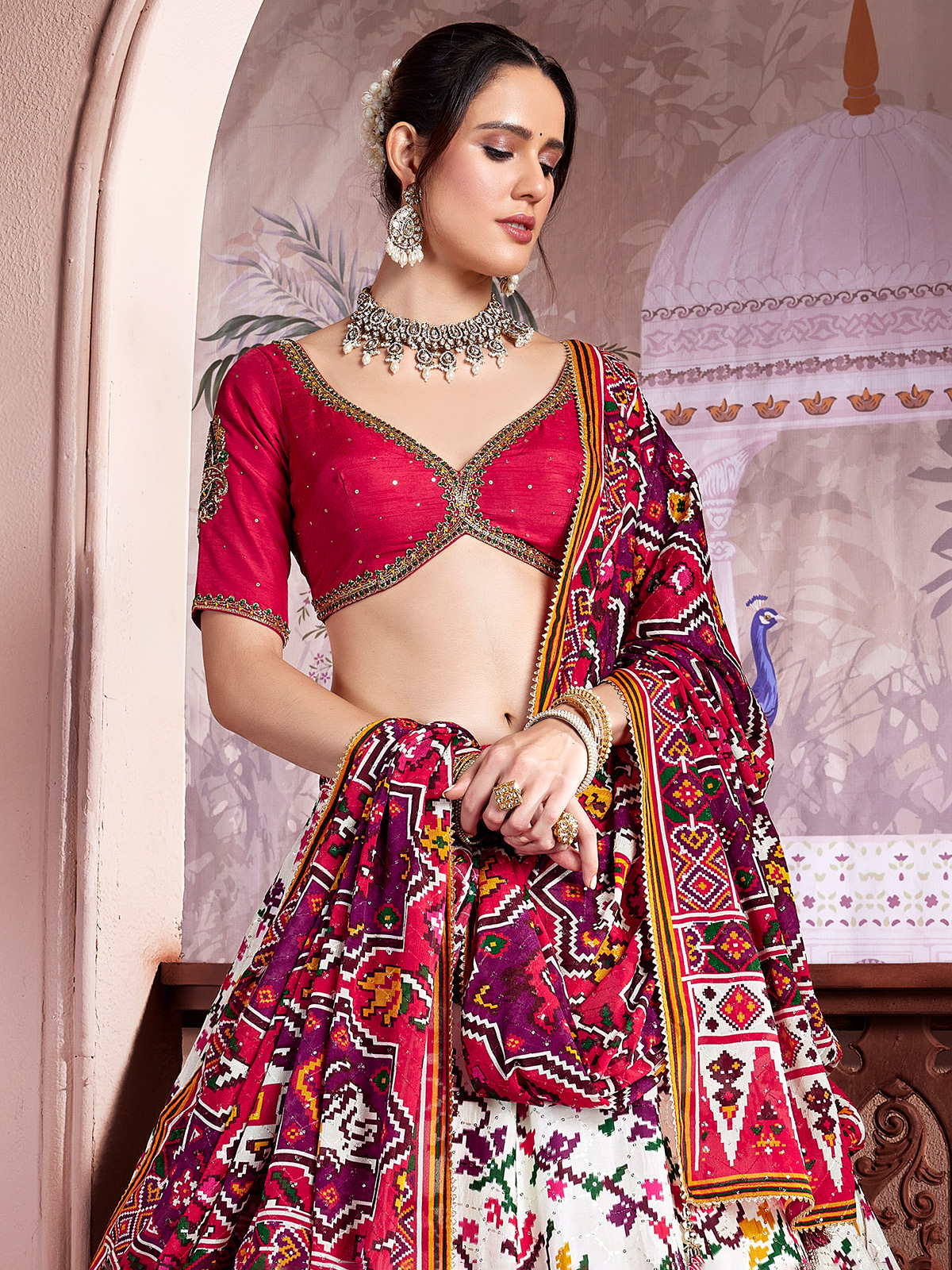 Inspired by heritage prints white patola printed patola silk lehenga choli is enhanced with thread embroidery, sequins, zardosi and cutdana work. The sweetheart neckline with elbow sleeves adds classic charm, while the dupatta completes a refined look for weddings and festive occasions.
