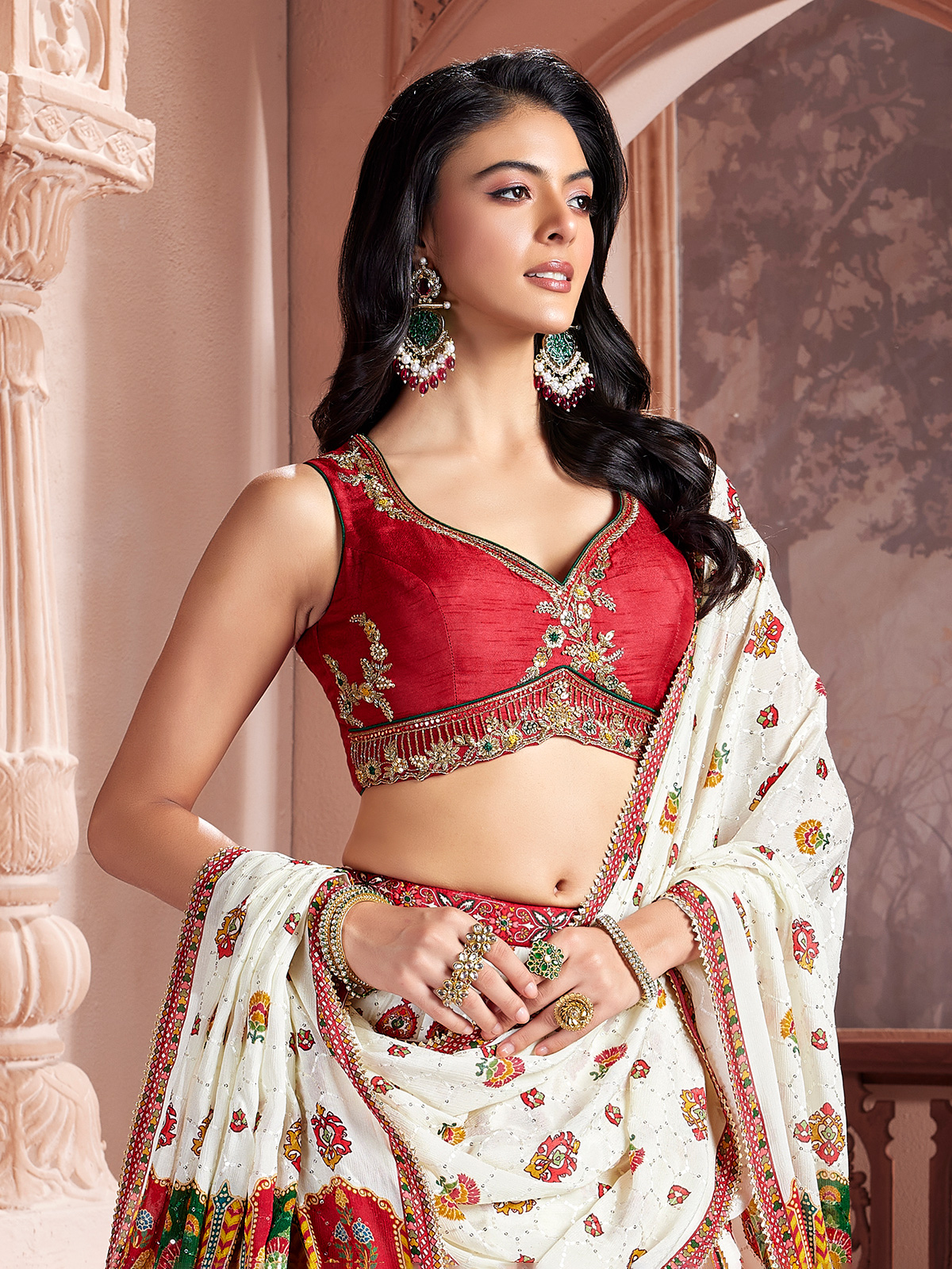 White Printed Silk Sweetheart Sleeveless Lehenga Choli