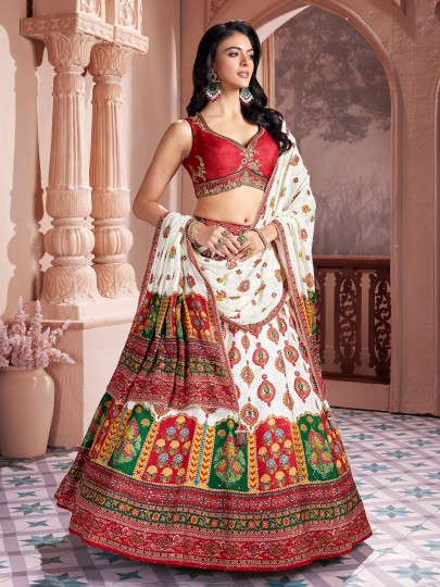Fresh and graceful, this white printed silk lehenga choli is detailed with thread embroidery, sequins, cutdana, zardosi, beads, diamond and mirror accents. Designed with a sweetheart neckline and sleeveless blouse, it pairs elegantly with a dupatta for wedding festivities and sangeet nights.