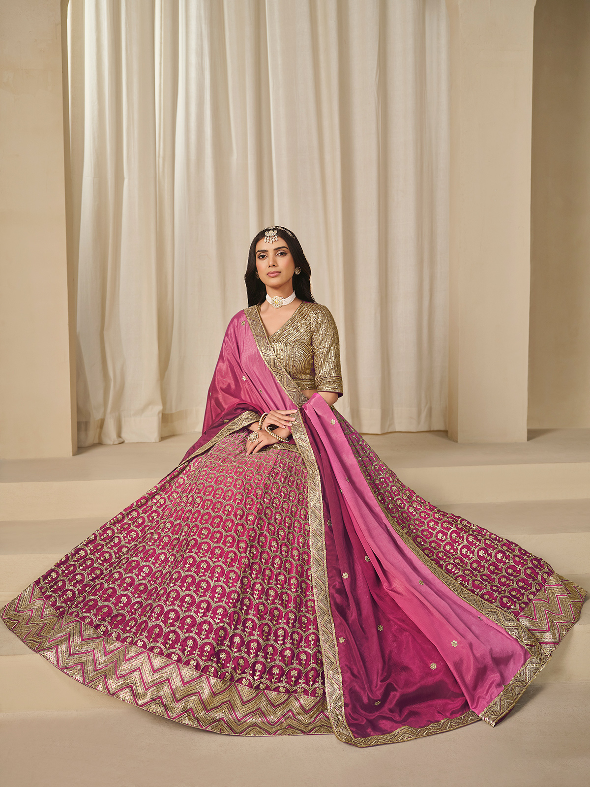 Radiate charm in this wine-toned silk lehenga choli adorned with sequins and resham motifs. The set includes a soft silk dupatta and an unstitched blouse piece, offering a refined and customizable look for weddings and festive gatherings.