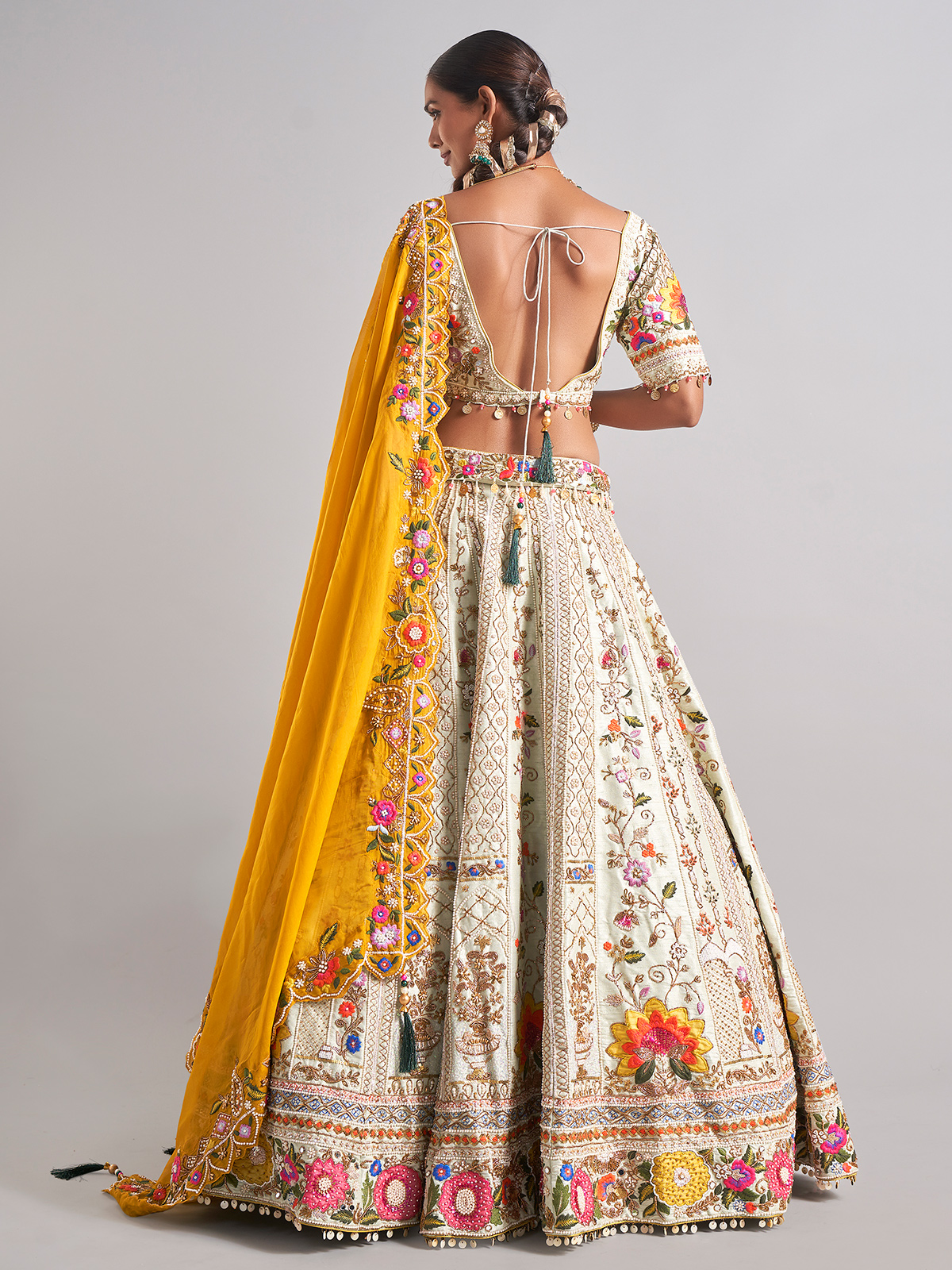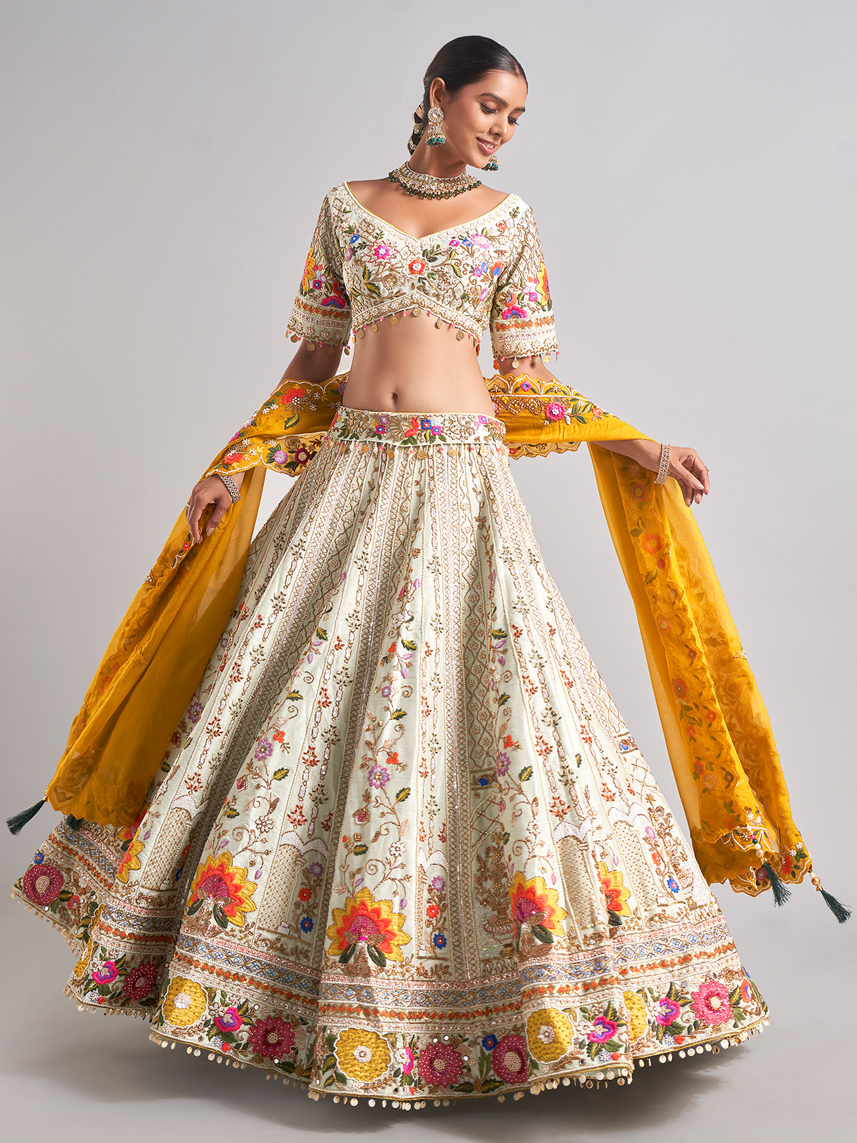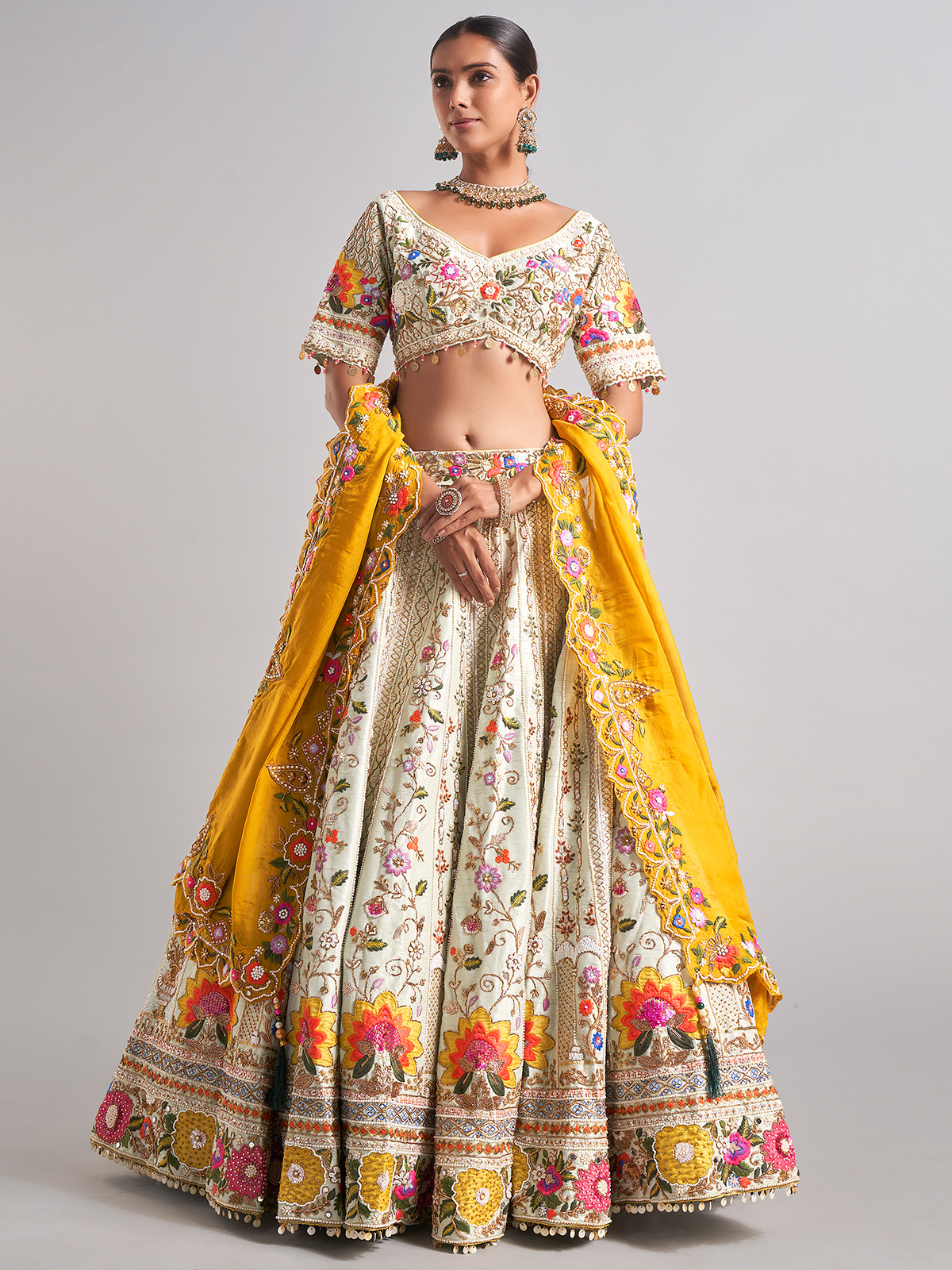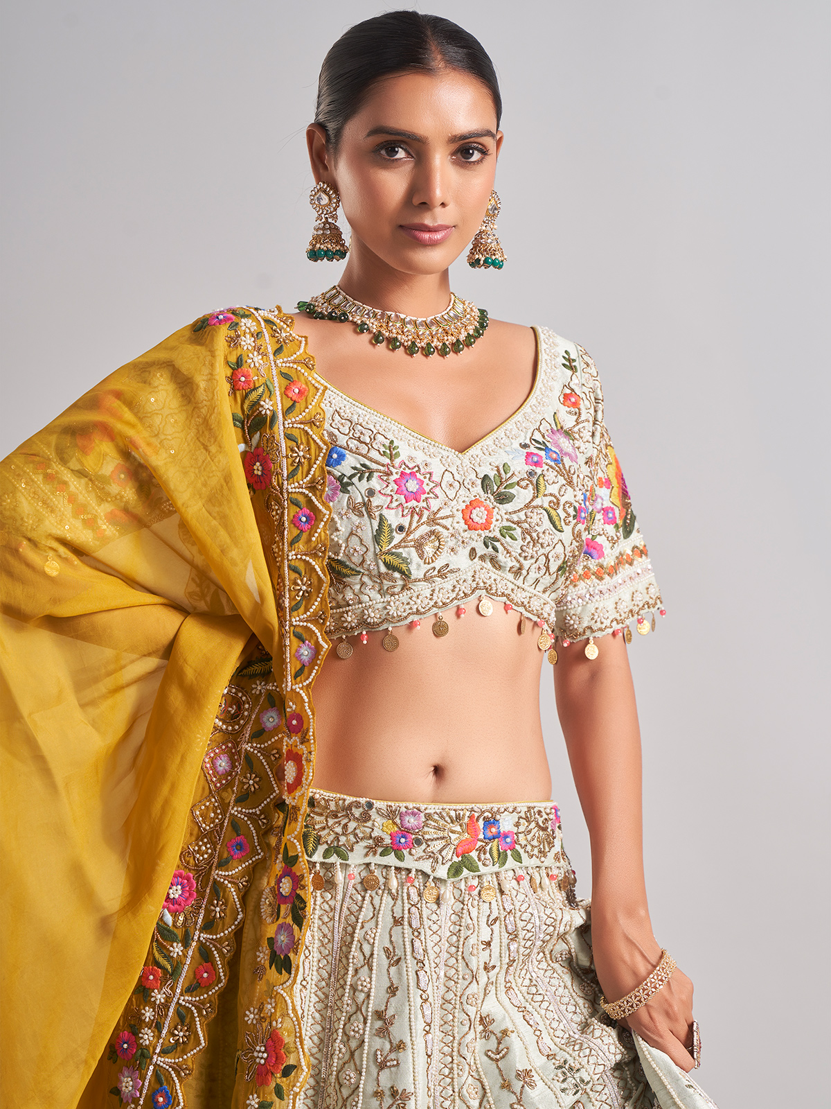 Stand out in this vibrant off-white raw silk lehenga choli. Featuring exquisite zardosi, beads, coins, sequins, resham, thread and embroidery work, its designed to elevate your look for any wedding occasion. The choli has a sweetheart neck and half sleeves.