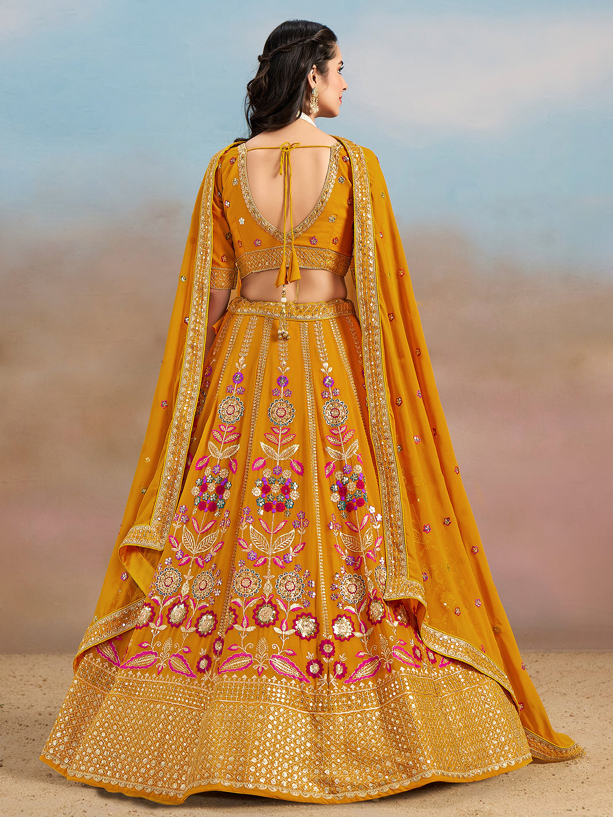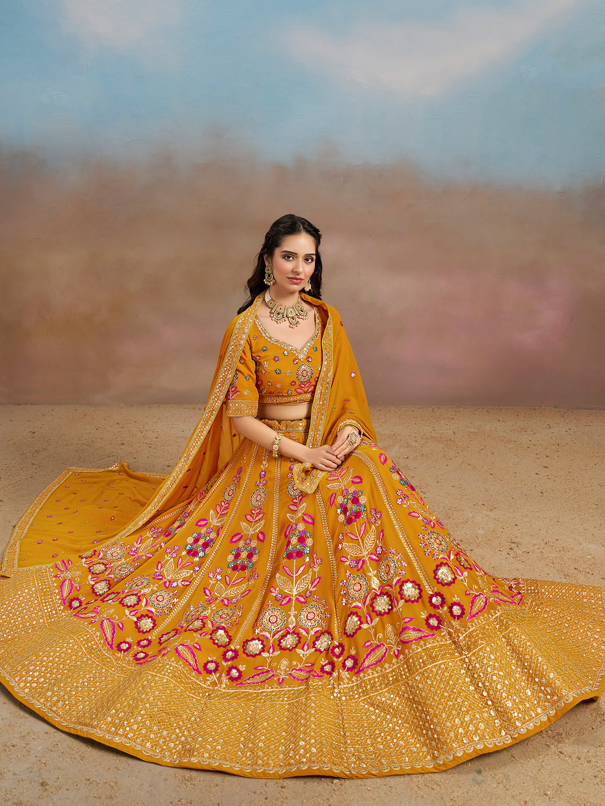 Bright and celebratory, this yellow georgette unstitched lehenga choli reflects joyful elegance and vibrant charm. Beautifully adorned with resham, sequins, and detailed embroidery, it radiates festive shimmer throughout. Perfect for weddings, sangeet, and haldi ceremonies, it comes with an unstitched blouse and a georgette dupatta finished with delicate lace accents.