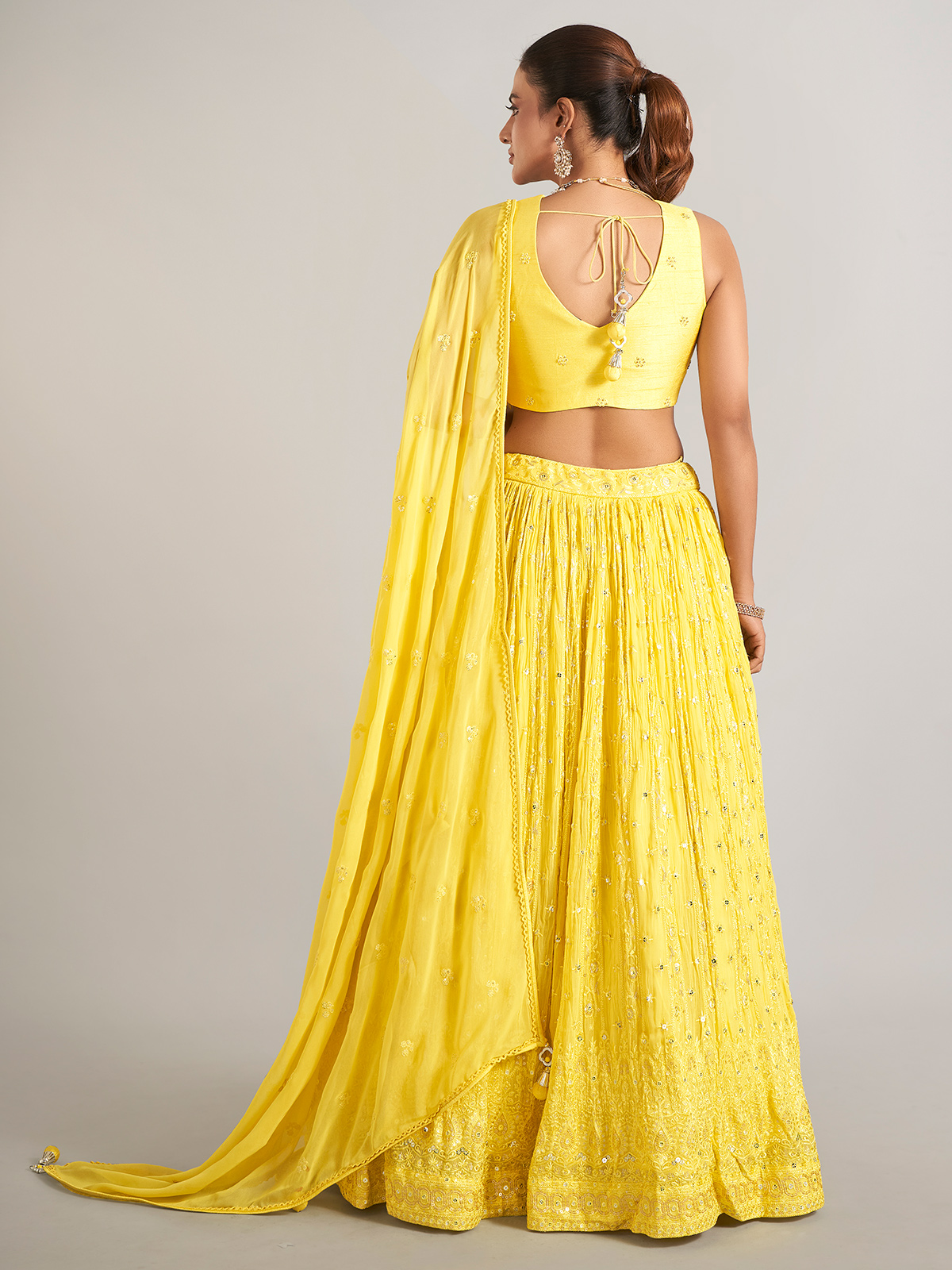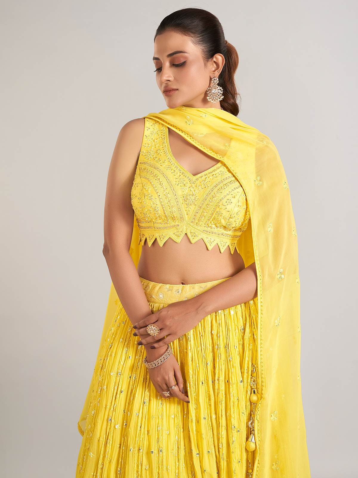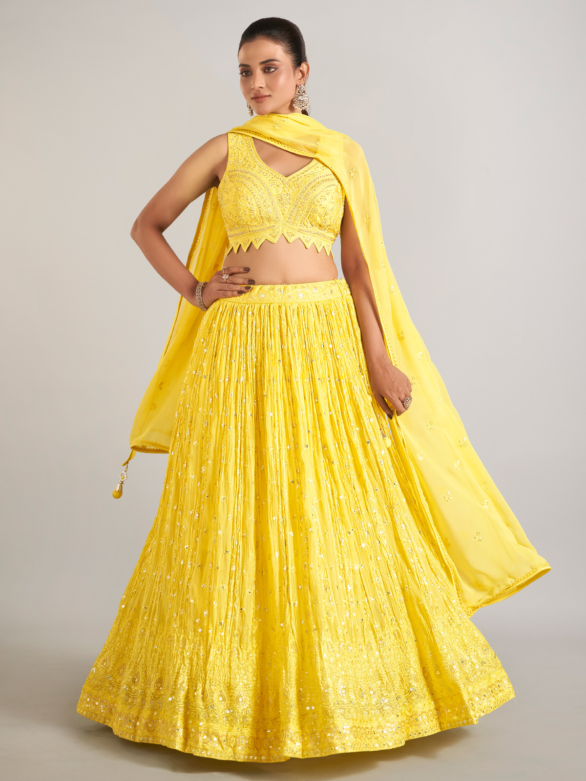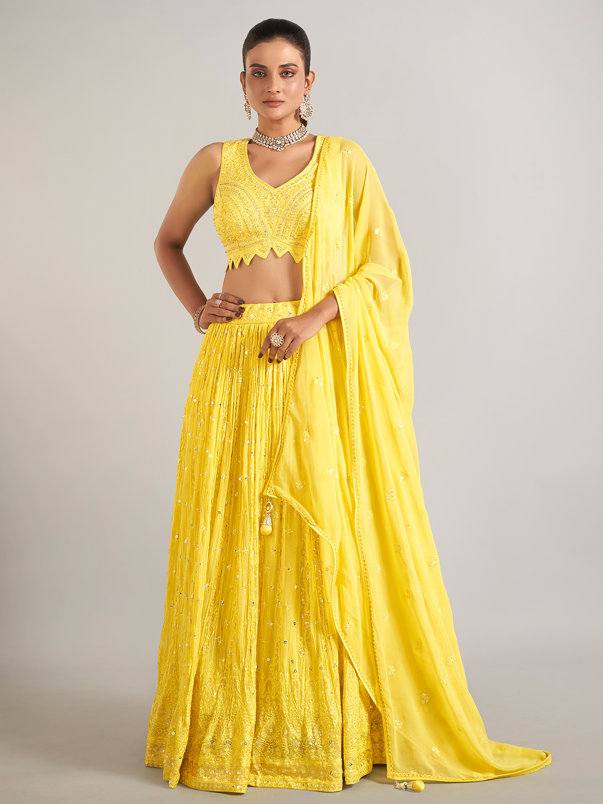 This yellow lehenga choli perfectly blends elegance and charm. Crafted from georgette and adorned with embroidery, stones, sequins, and zardosi work, it is designed for classic occasions. The sleeveless choli features a sweetheart neckline and comes with a dupatta.