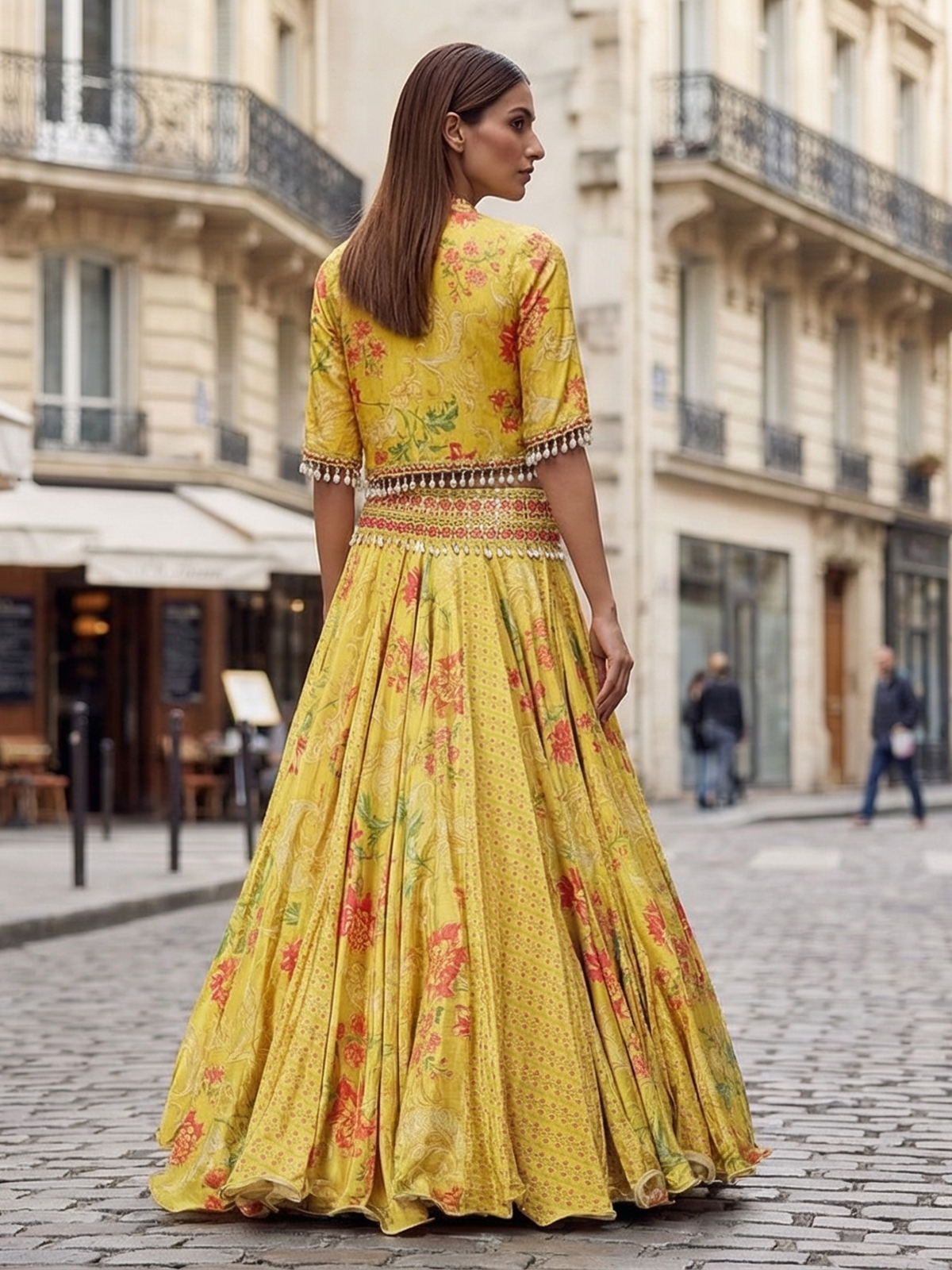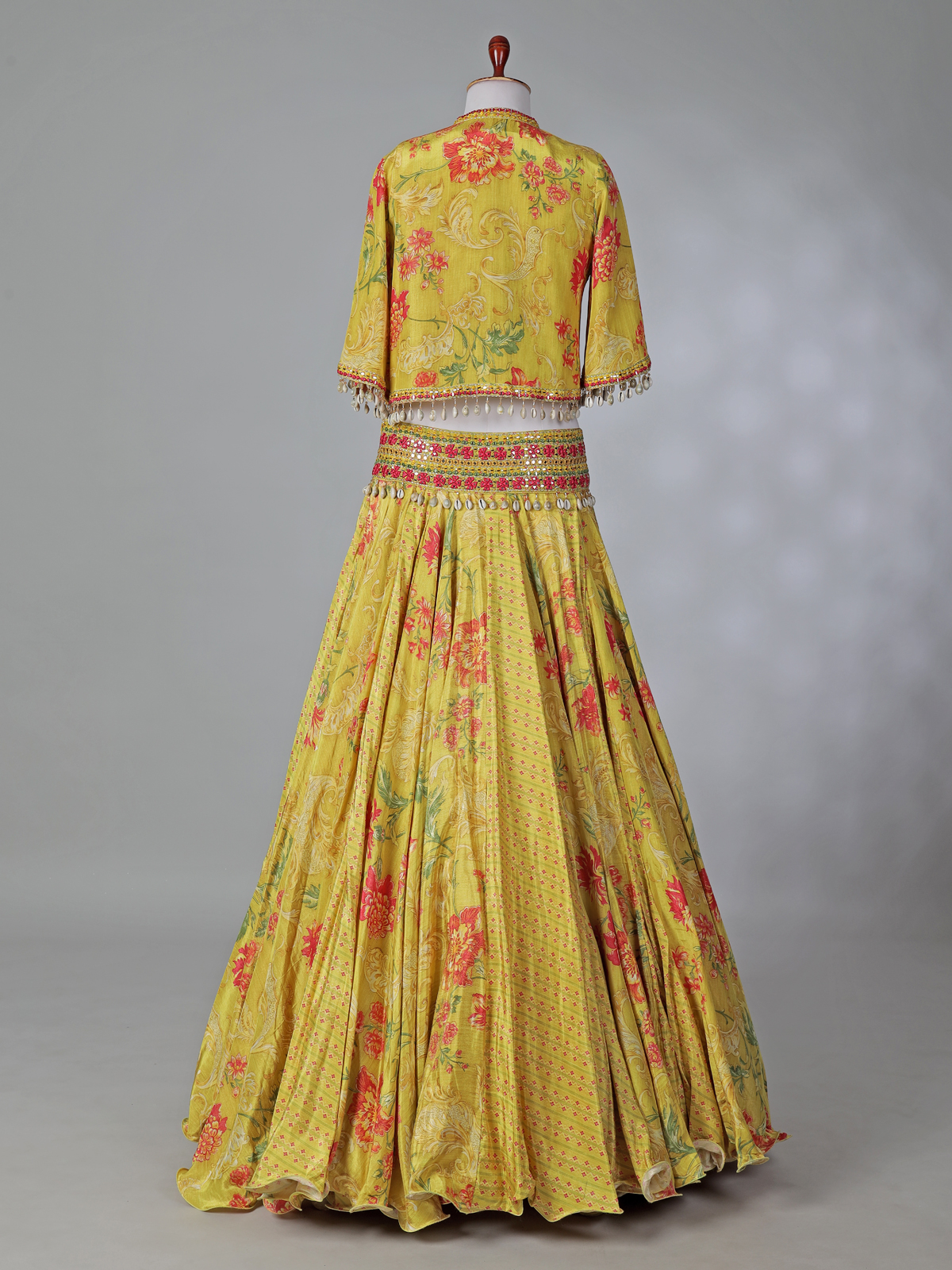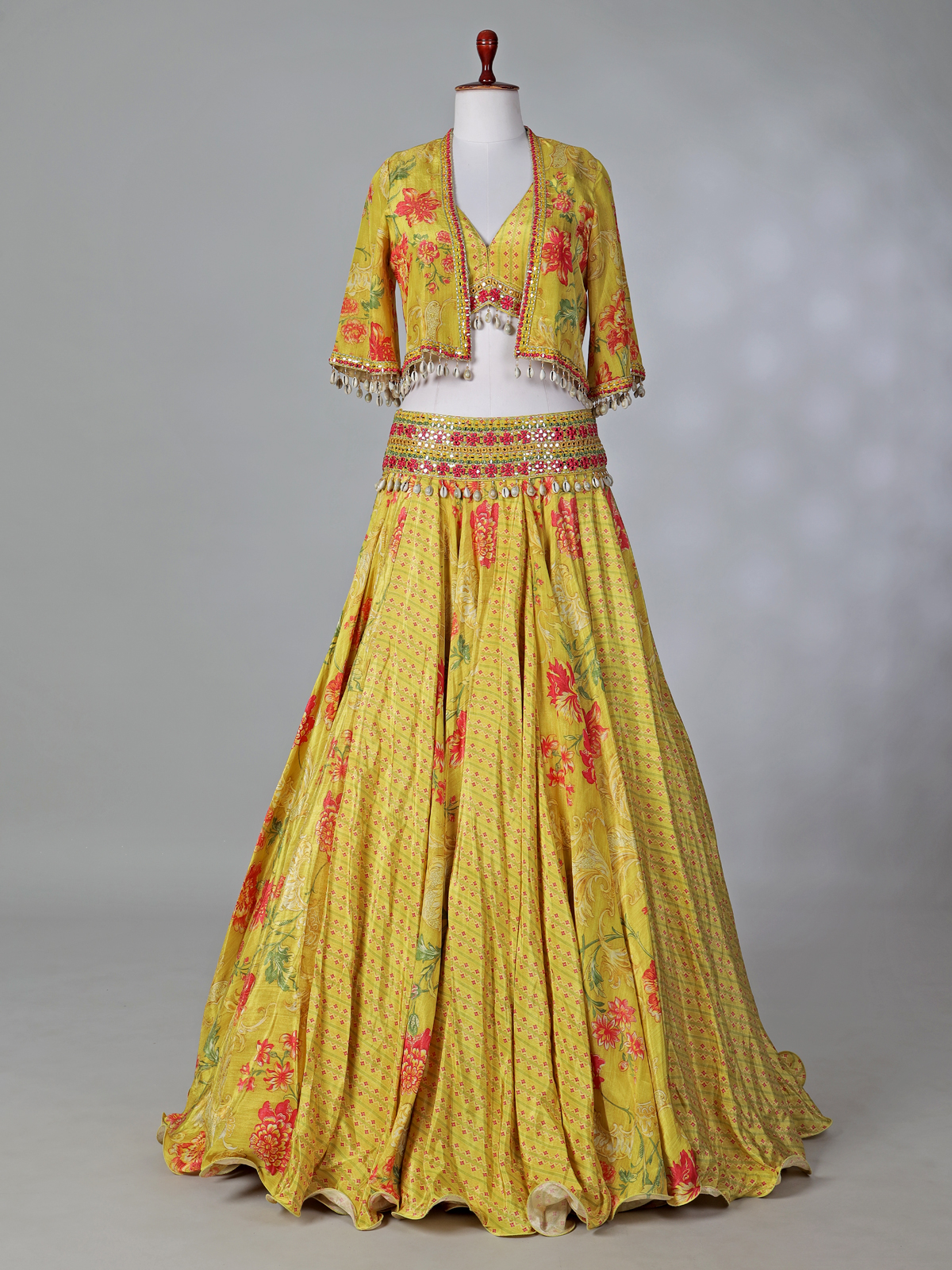 Yellow Printed Silk Lehenga Choli With Short Jacket