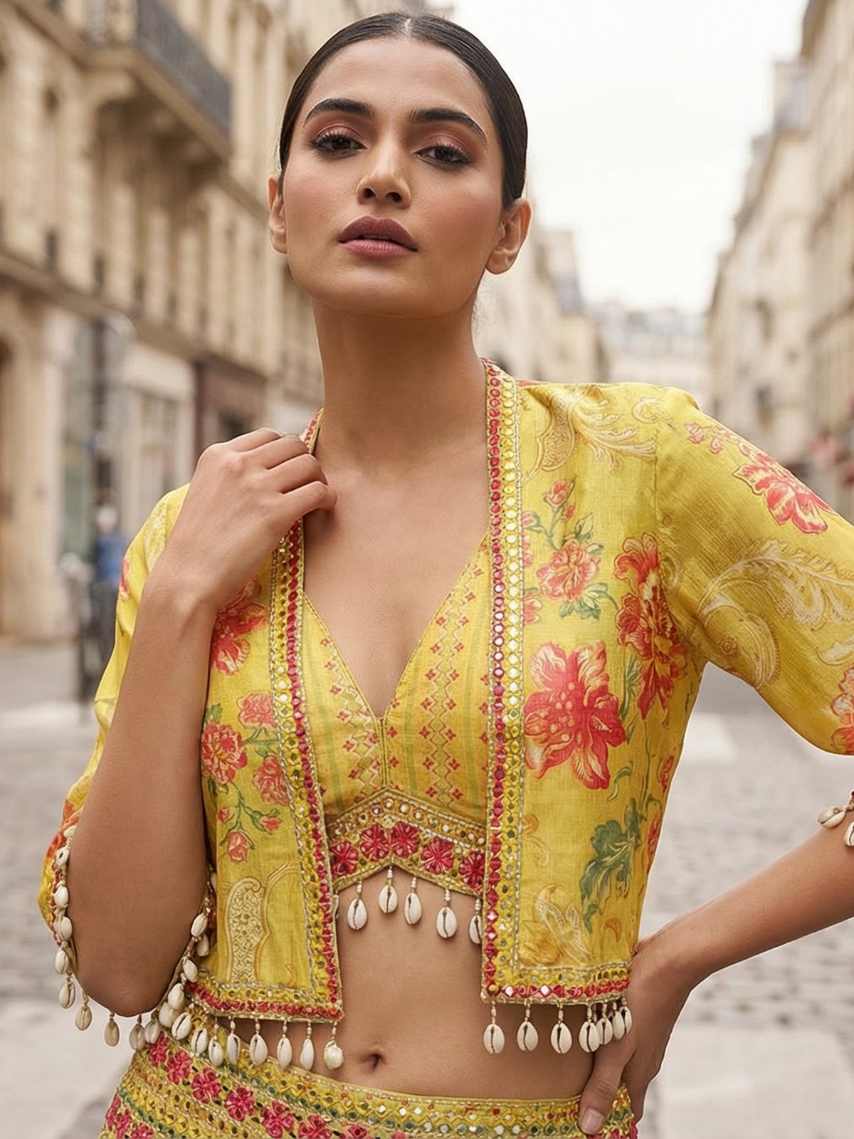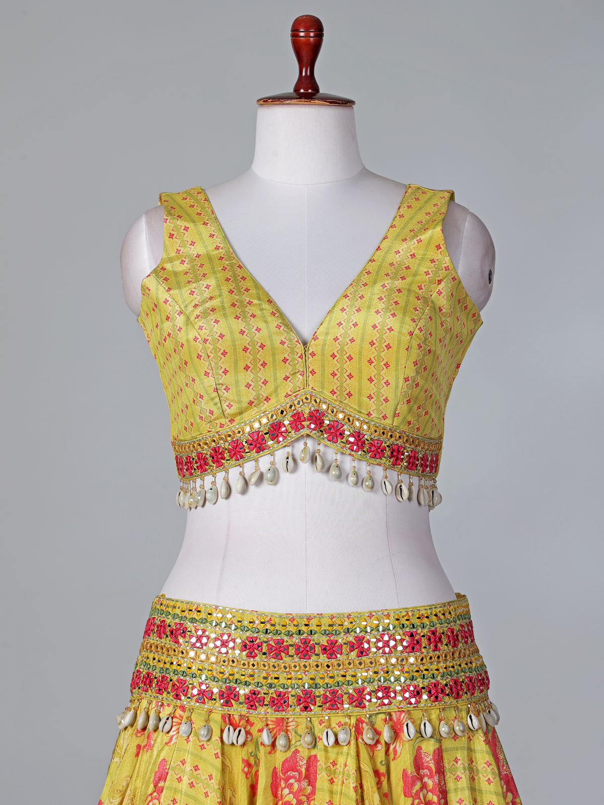 Glow with vibrant elegance in this beautiful yellow silk lehenga choli that radiates youthful charm. Detailed with beads, aabla, cutdana, thread work, and cowrie shell embellishments, it offers unique texture. Styled with a sleeveless V-neck blouse and a printed jacket layer, it is perfect for festive celebrations and weddings.