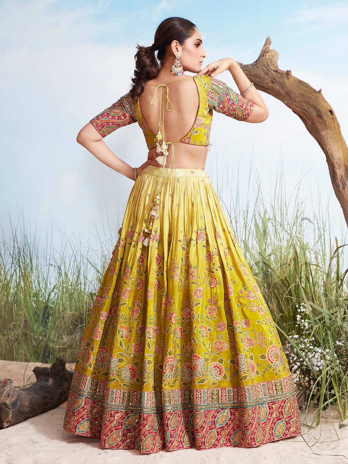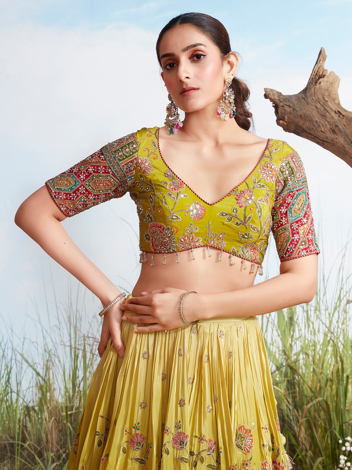 Radiating festive vibrance, this yellow silk lehenga choli captures joyous elegance with its shaded and printed design. Intricate resham, sequins, stone, and mirror embellishments enhance the ensemble, while the V-neck choli with half sleeves ensures comfort and grace. Paired with a coordinated dupatta, this outfit is perfect for wedding ceremonies and cheerful celebratory occasions.