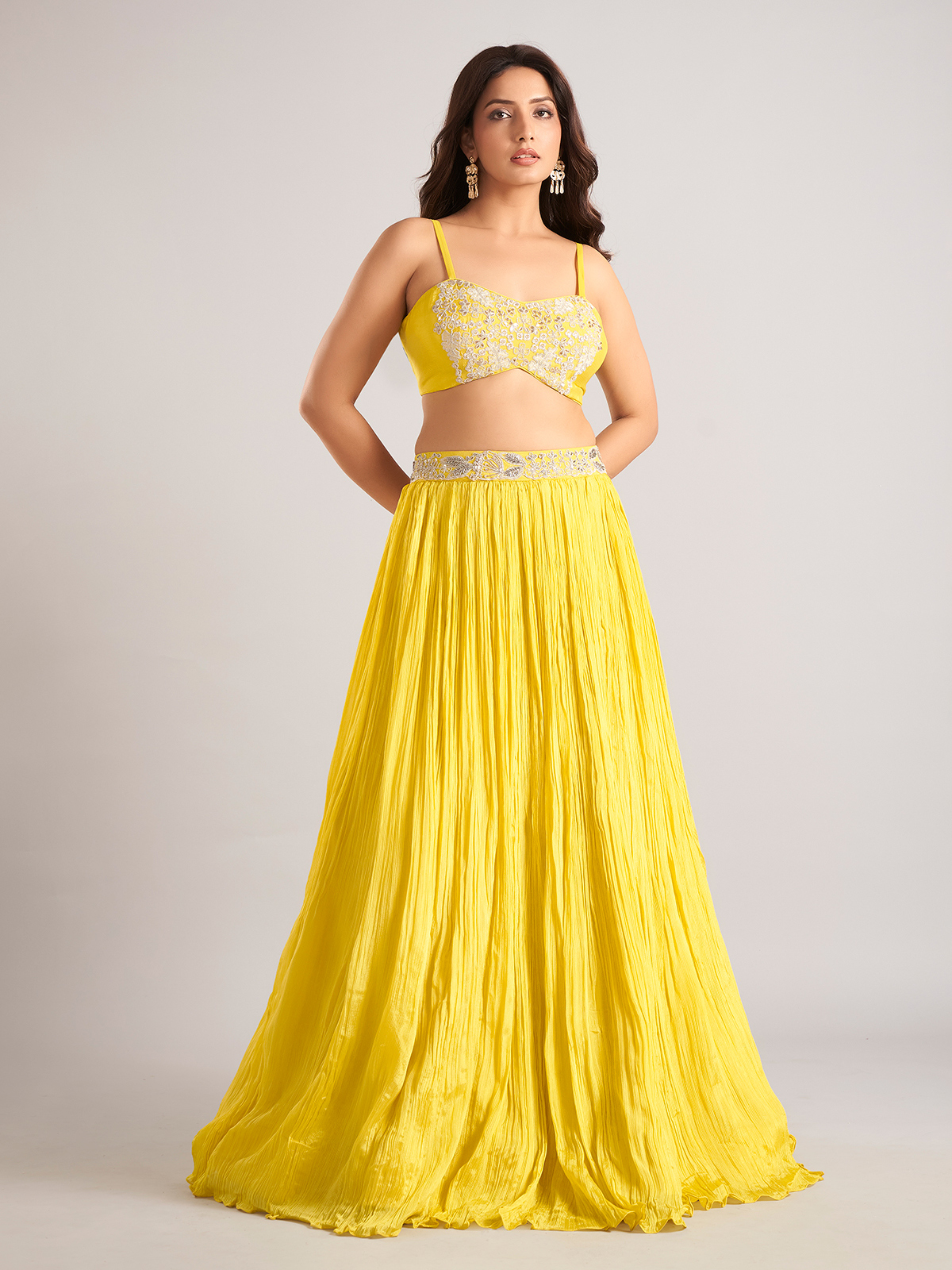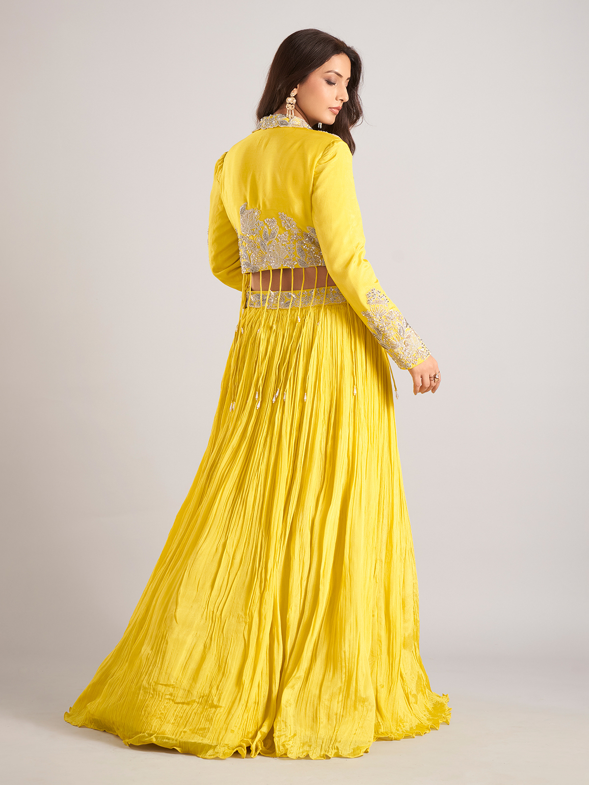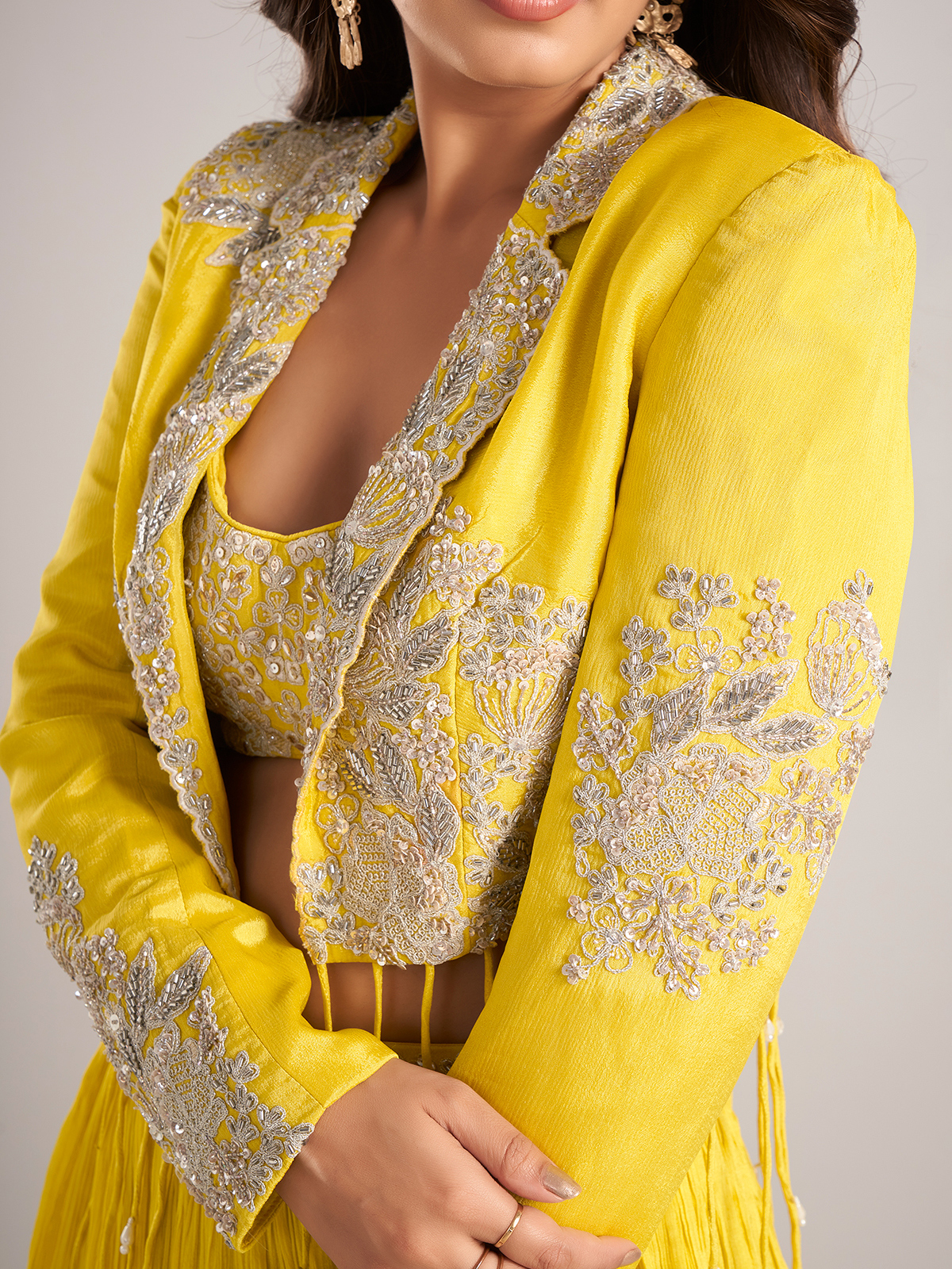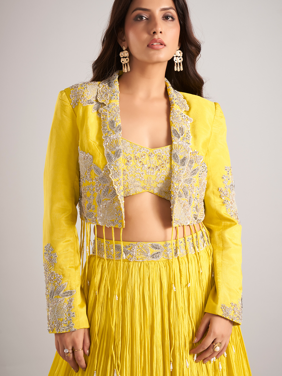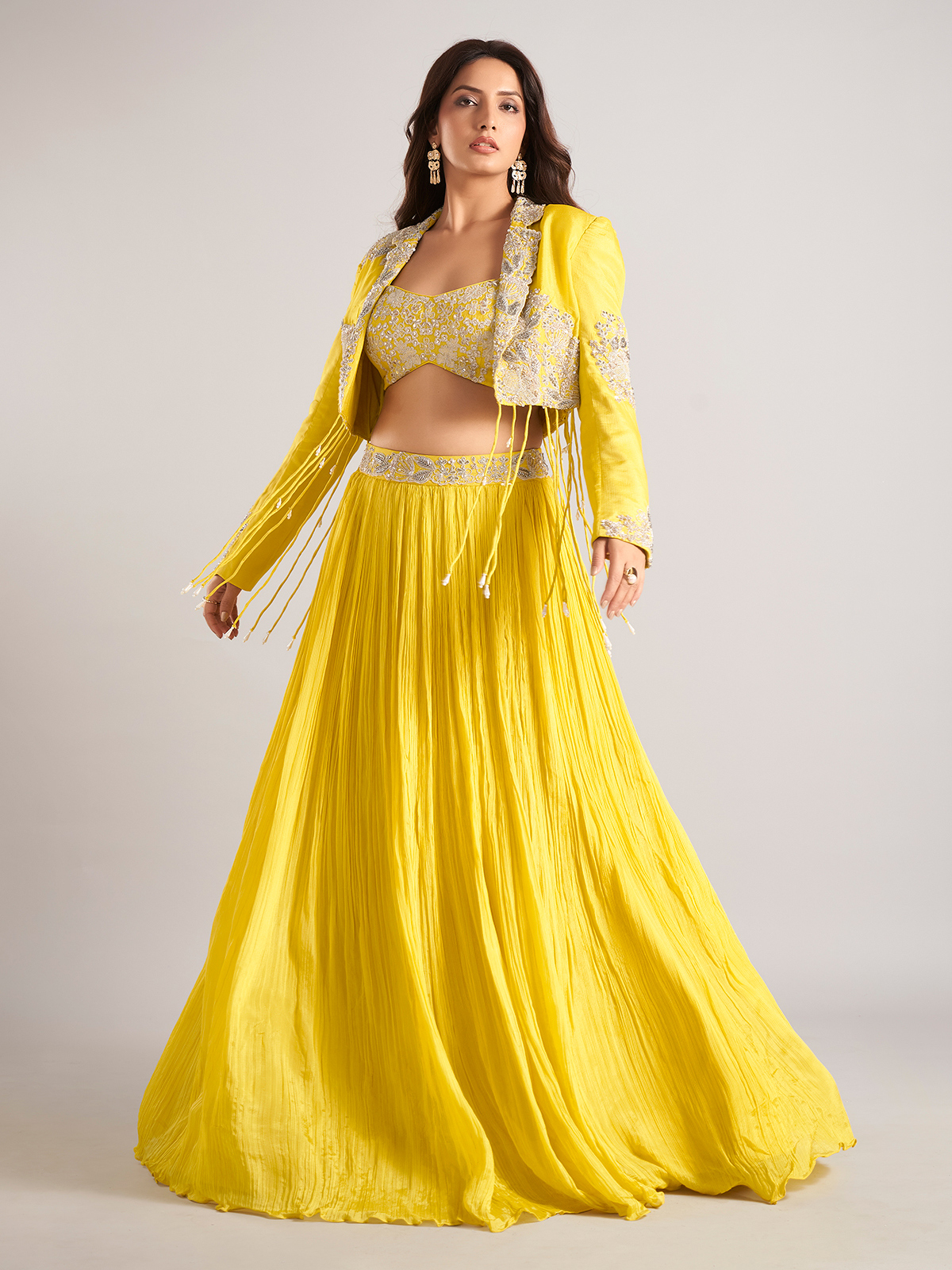 Bring vibrance to your celebrations with this yellow silk lehenga choli in a jacket silhouette, beautifully enhanced with thread, cutdana, and sequins work. Perfect for weddings, receptions, or haldi ceremonies, it fuses tradition with contemporary sophistication.