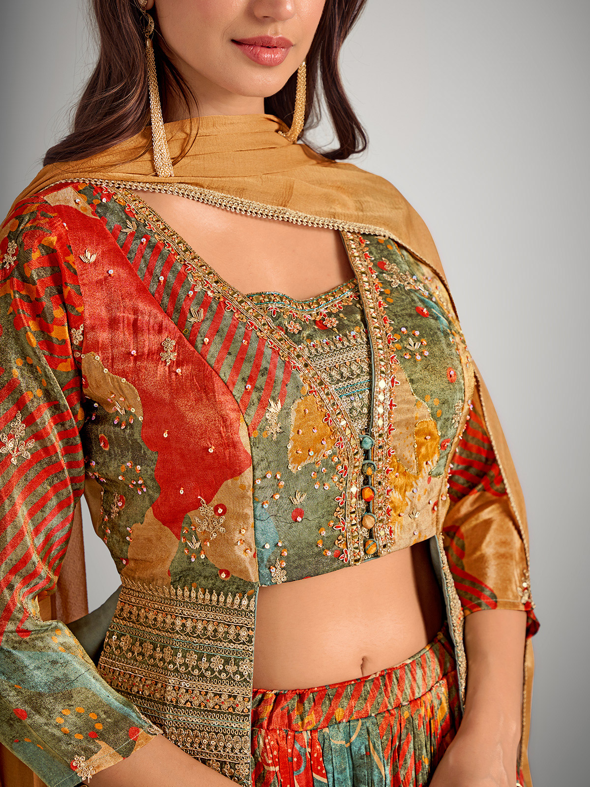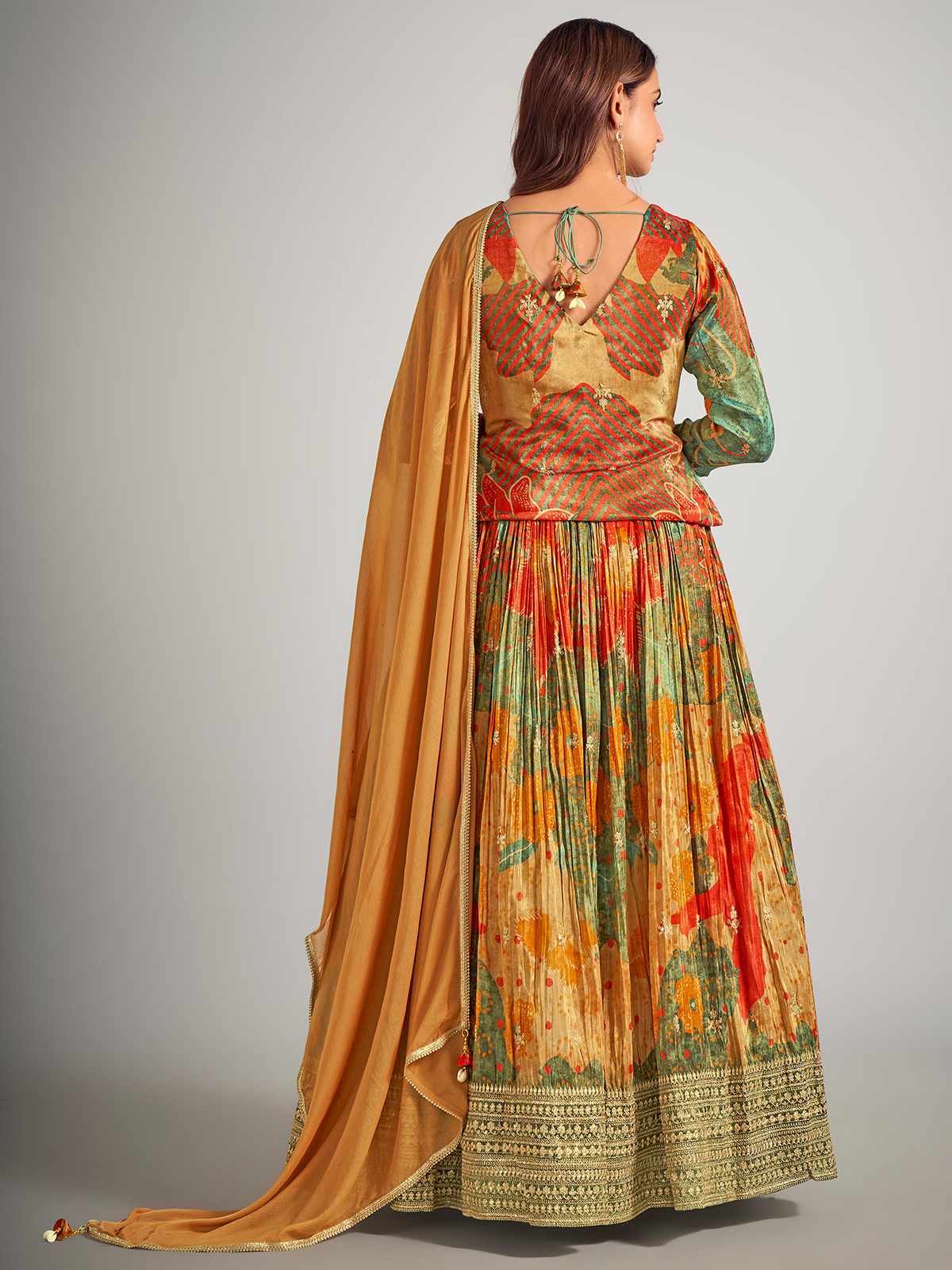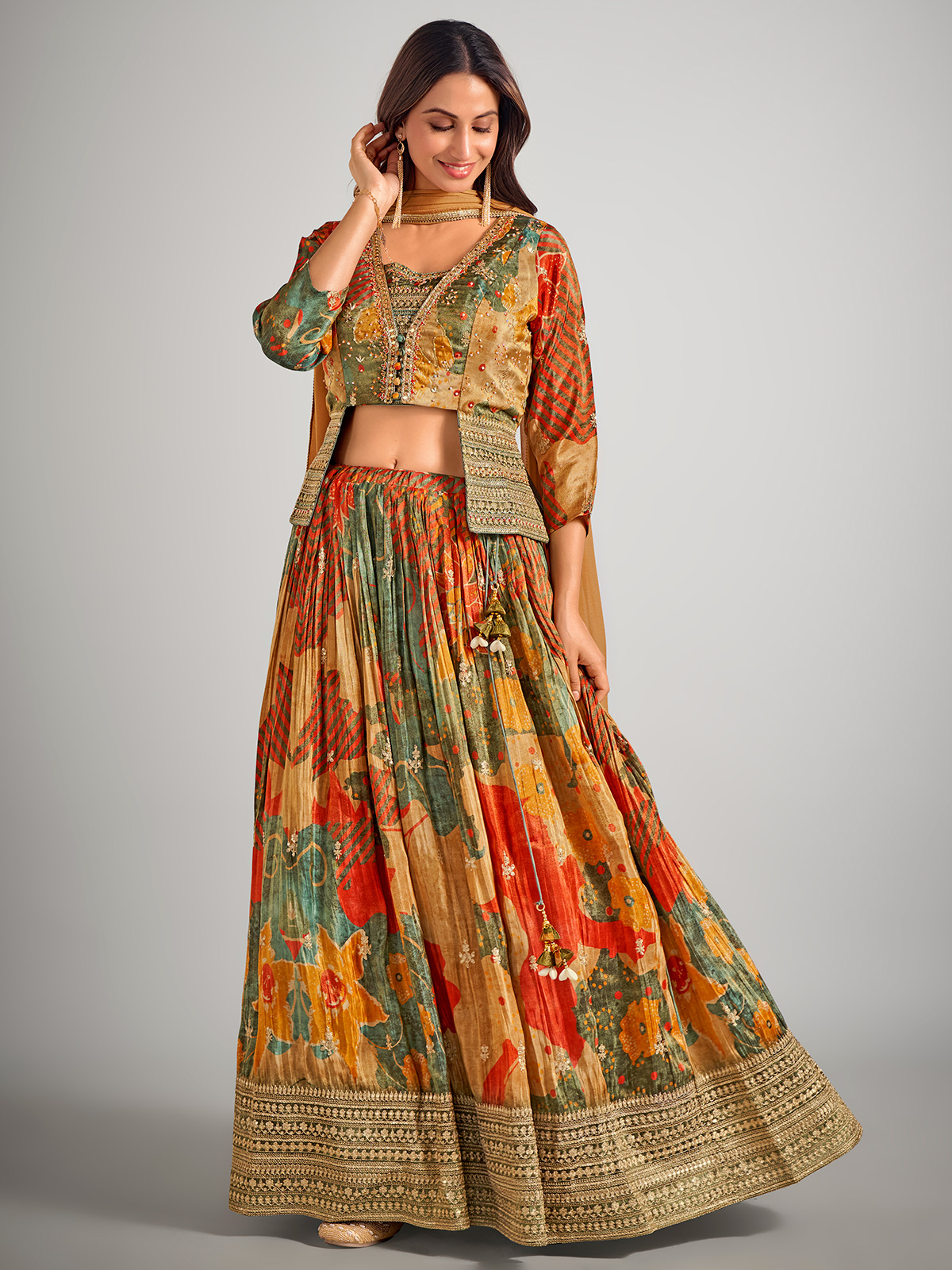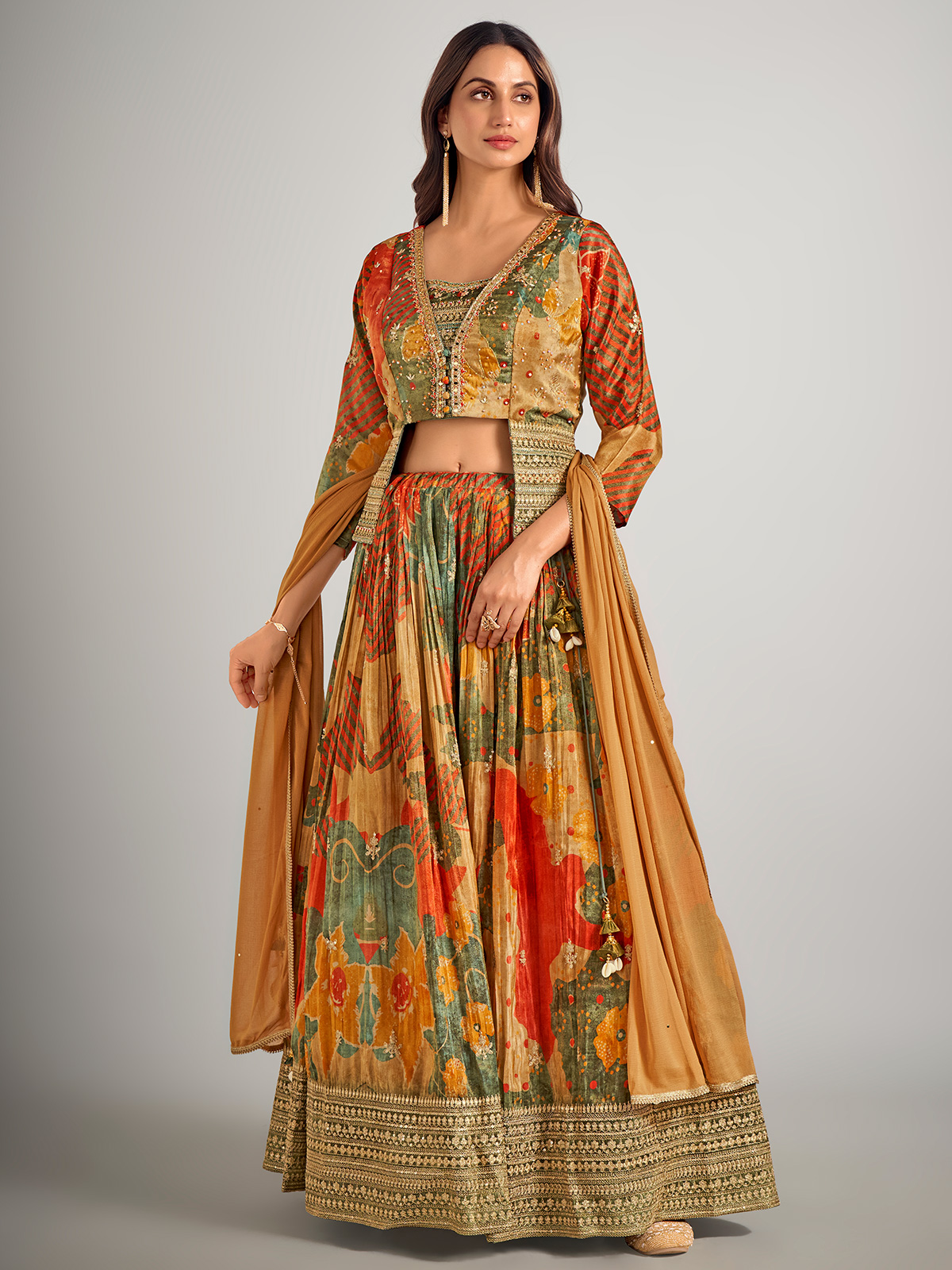 Beautiful silk lehenga choli with an earthy yellow design that is embellished with resham, zardosi, cutdana, beads, sequins, and aabla. Its quarter sleeves, choli, and dupatta give it a fashionable appearance.
