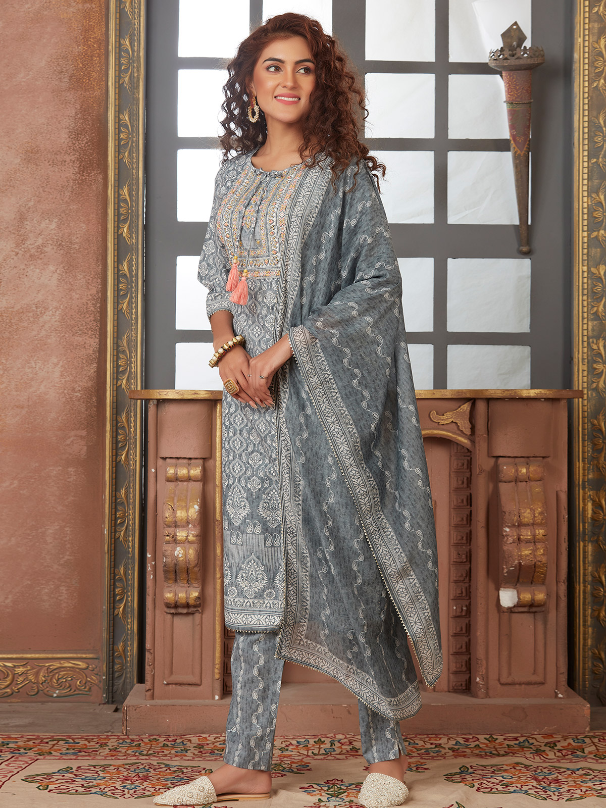 Embrace a contemporary yet graceful look with the grey printed kurti set. Tailored from luxurious cotton fabric with resham, sequins and zari work, it boasts a keyhole neck and quarter sleeves, making it perfect for casual occasions. This ensemble includes a dupatta.