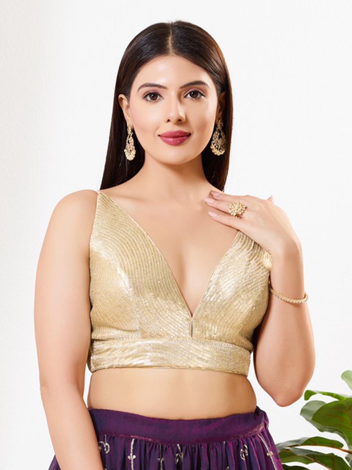 This antique gold sequins blouse glows with fine sequin detailing that adds a refined festive touch. The V neckline and sleeveless cut create a modern appeal, while the back-open design enhances elegance. Perfect for pairing with wedding lehengas and festive sarees.