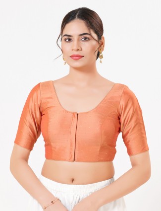 This soft beige tafeta silk blouse exudes calm charm with delicate zari accents. Designed with a round neck and front-open silhouette, it pairs comfort with elegance. Elbow sleeves add subtle poise, making it perfect for sarees in vibrant or pastel tones during festive occasions.