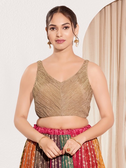 Made in tissue silk, this beige blouse carries a gentle festive glow. The sweetheart neckline, sleeveless cut and back-open closure make it easy to pair with silk and organza drapes.