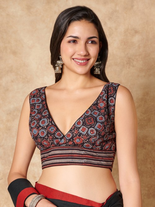 Black Ajrakh Cotton V Neck Ready Made Blouse With Hand Block Print