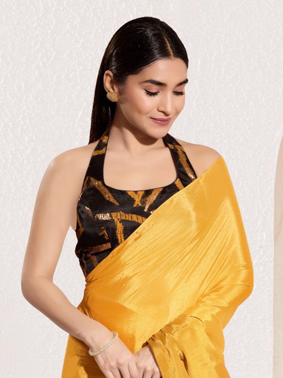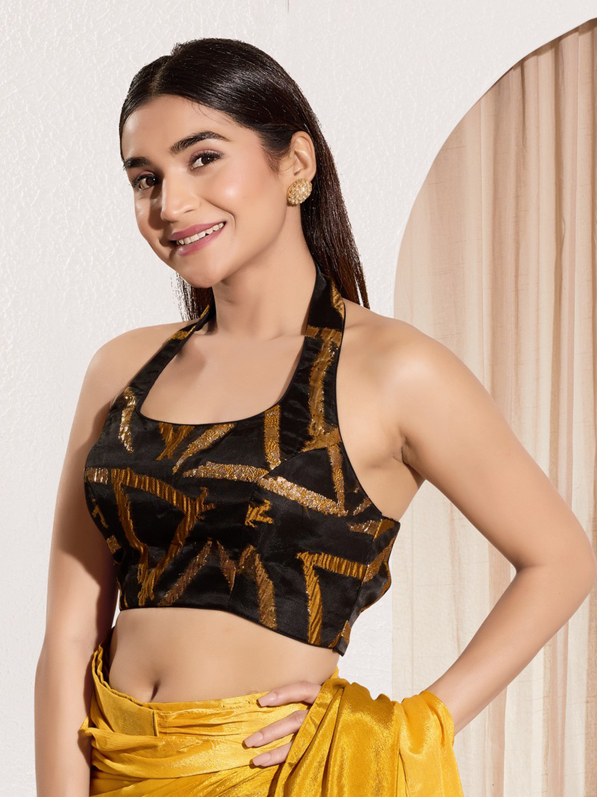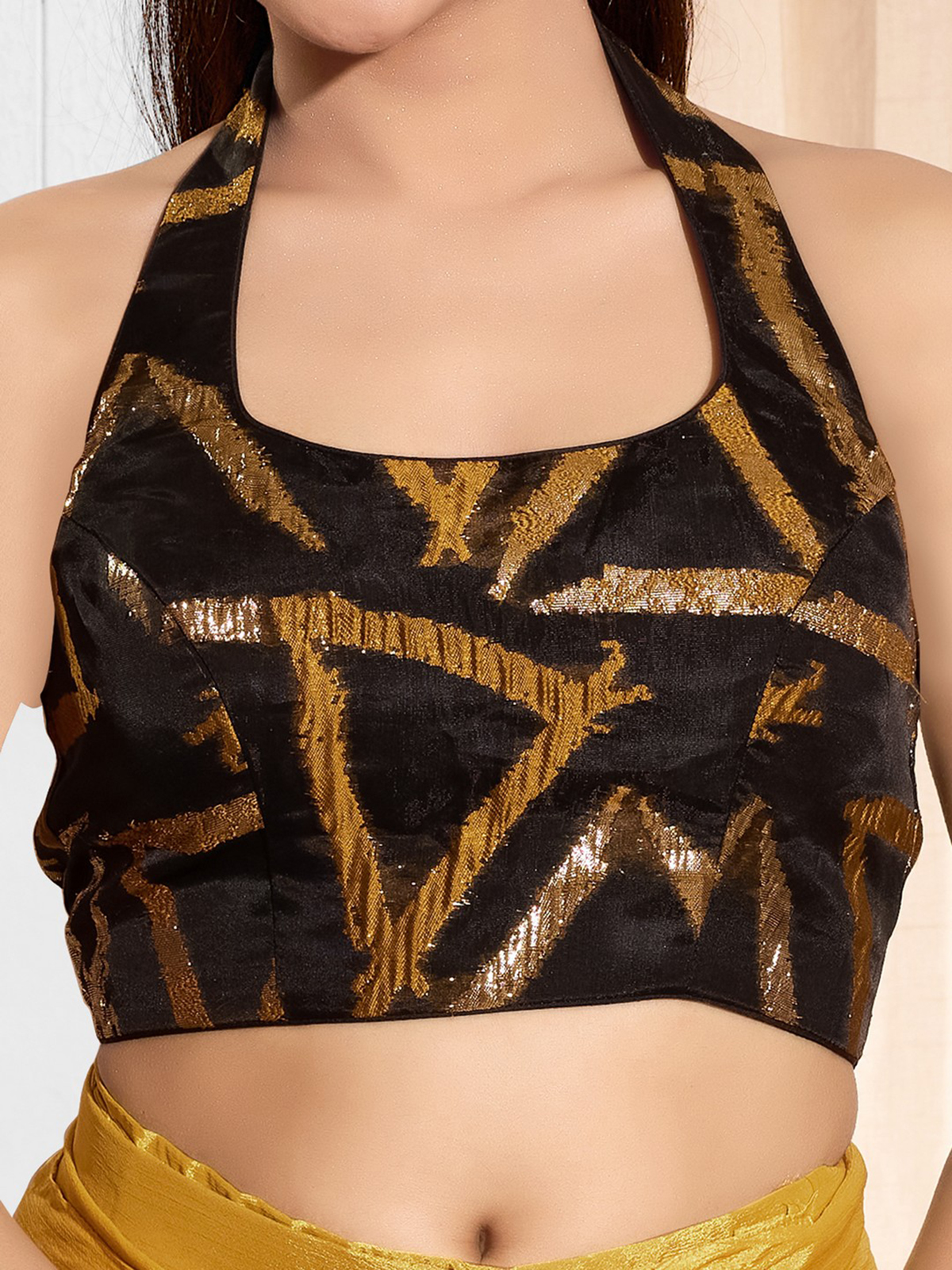 This cotton blouse in black and mustard features tasteful zari detailing that brings understated elegance. The sleeveless silhouette with square neckline and back-open design makes it ideal for handloom or casual festive sarees.