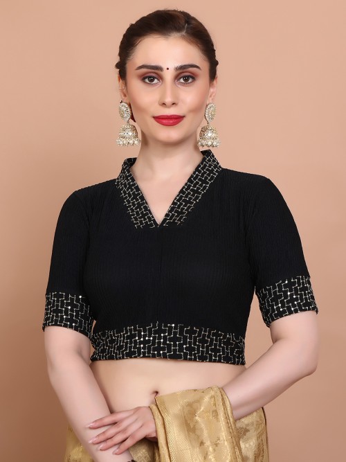Intricately designed, this black lycra blouse features resham and sequin work, a V neckline, elbow sleeves, and a no-opening slip-on silhouette—perfect for festive occasions.