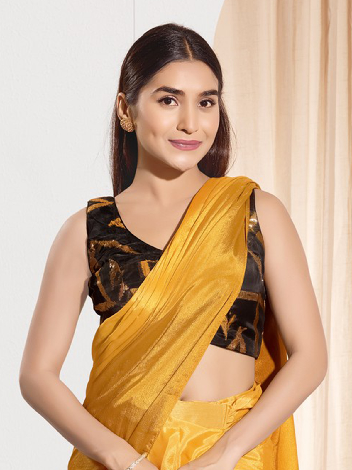Made in sheer black organza, this ready-made blouse features delicate zari work that adds subtle festive charm. Its sleeveless silhouette, sweetheart neckline and back-open closure create a modern look for parties and celebrations.