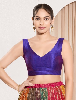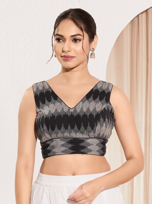 This sleeveless black cotton blouse is printed with ethnic motifs and finished with a flattering V neckline. A perfect choice for warm weather saree looks or casual ethnic gatherings.