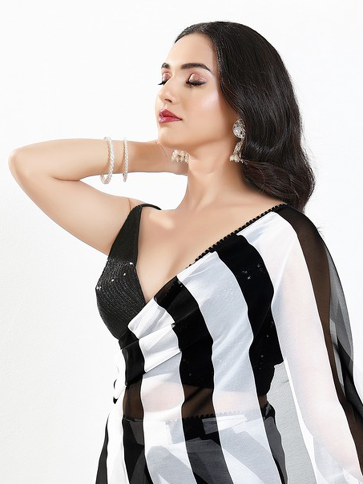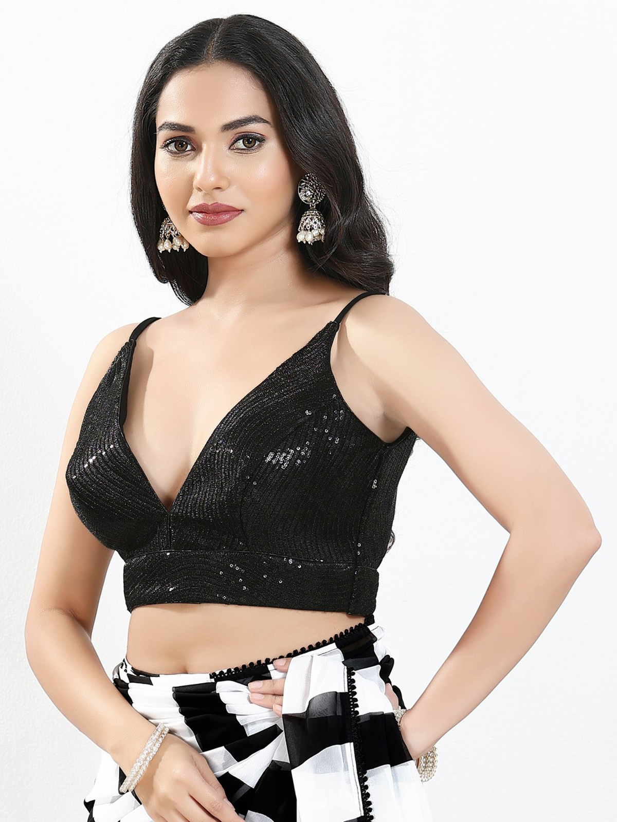 Crafted in black sequins fabric, this blouse shines with neatly arranged sequin work. The V-neck and sleeveless silhouette bring a sleek finish, complemented by a stylish back-open pattern. A versatile choice for partywear sarees, designer drapes and evening functions.
