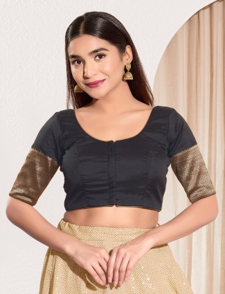 Elegant and refined, this black silk blouse features traditional zari weaving, a round neckline, and elbow sleeves. Ideal for weddings, religious events, or special festive occasions with richly woven sarees.