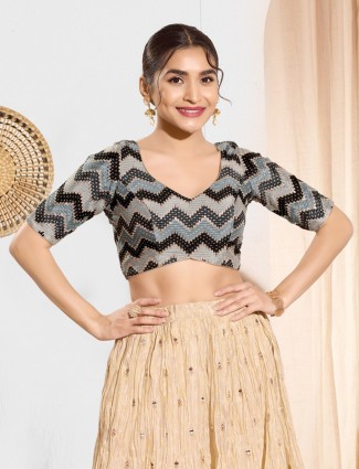 Tailored in lightweight black chiffon, this ready-made blouse showcases a chic zig-zag print highlighted with thread work. The sweetheart neckline, elbow sleeves and back-open closure complete its stylish appeal. Ideal for festive and party drapes in chiffon or georgette.