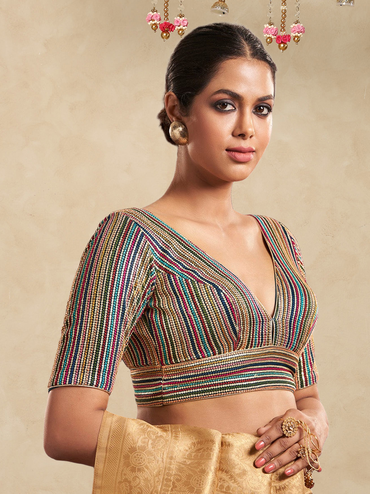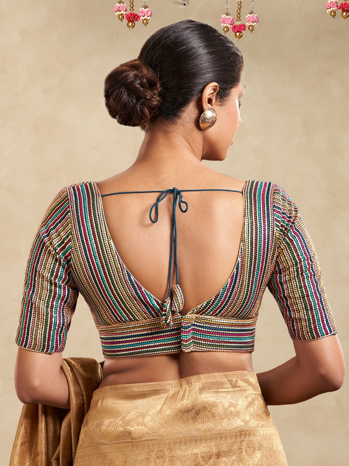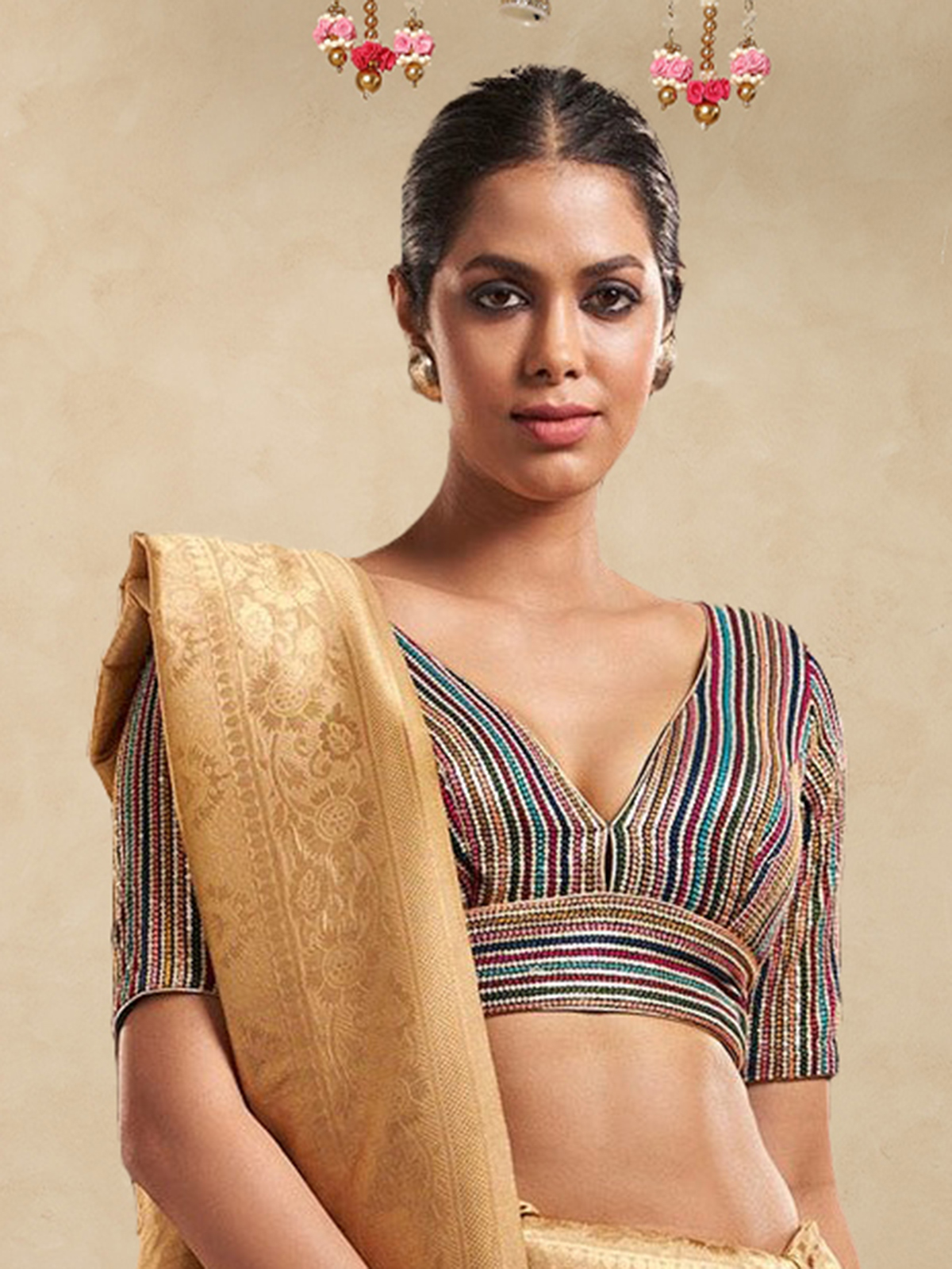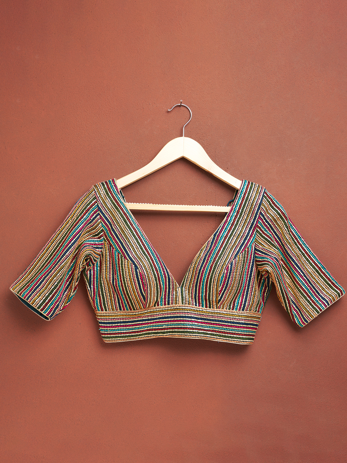 This vibrant blue georgette ready made blouse features embroidery and sequins work. V neckline, back opening and elbow sleeves create a regal and festive appeal. Ideal for wedding parties or special celebrations. It pairs beautifully with sarees or lehengas, adding elegance and shimmer to your ensemble.